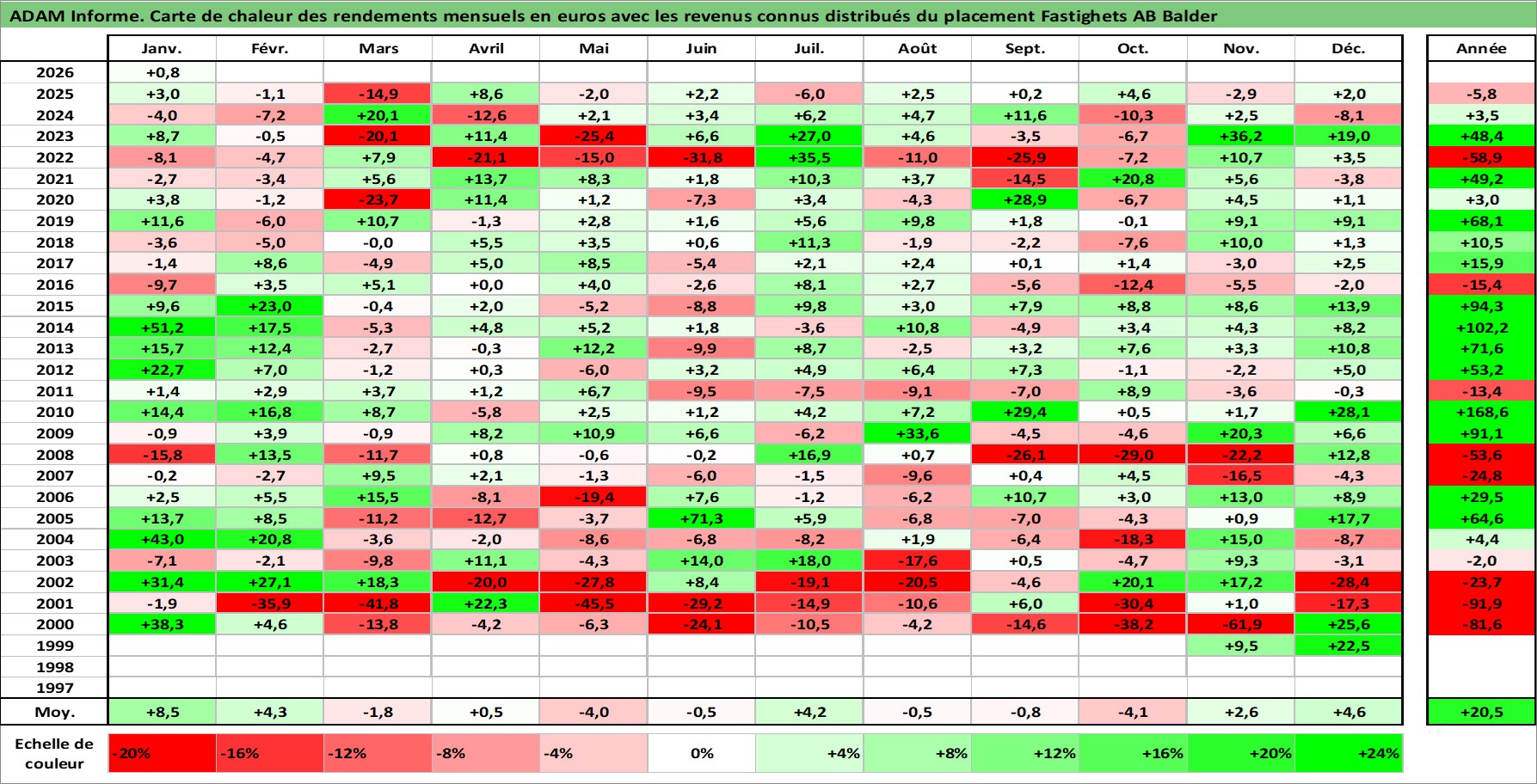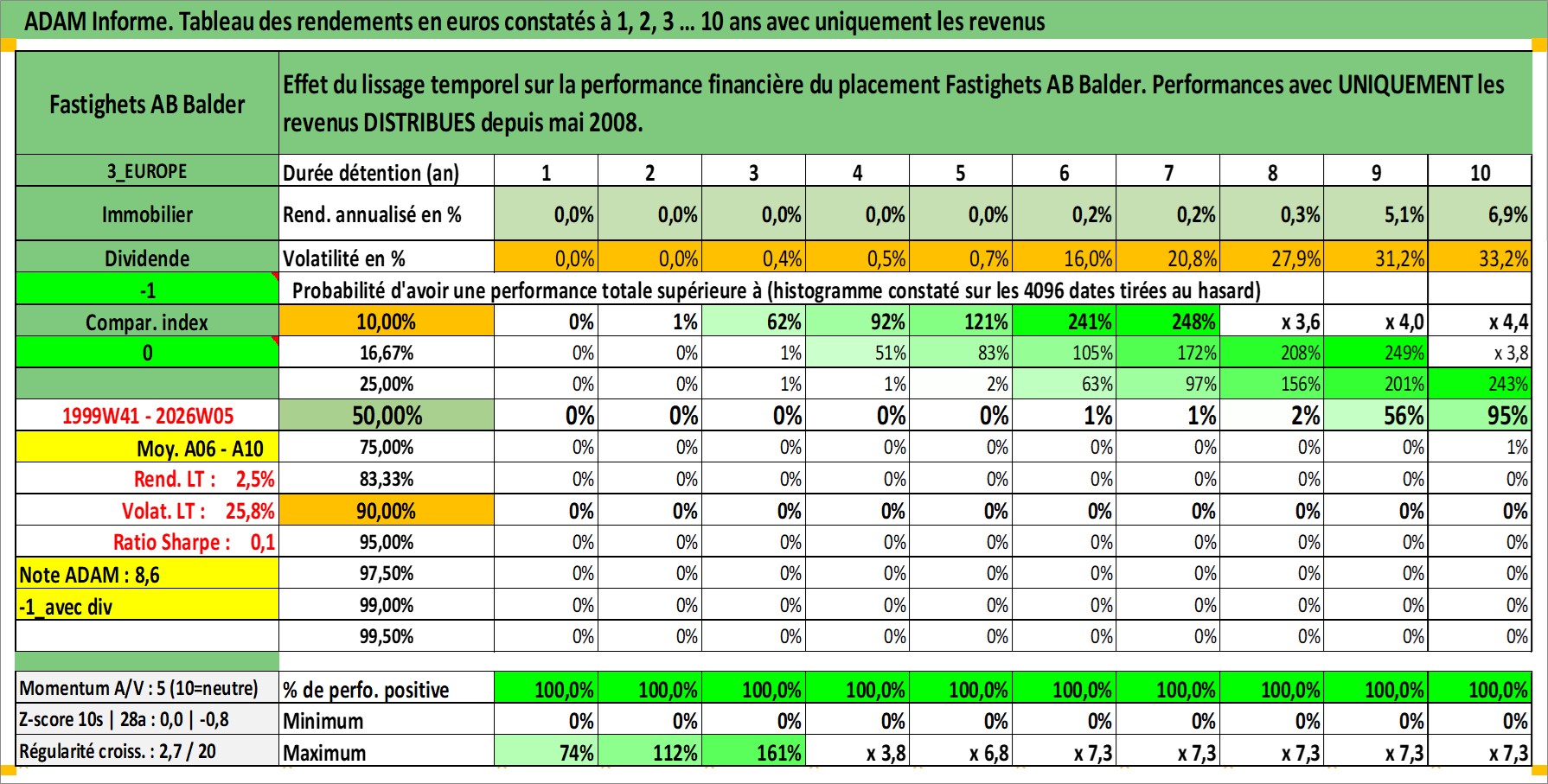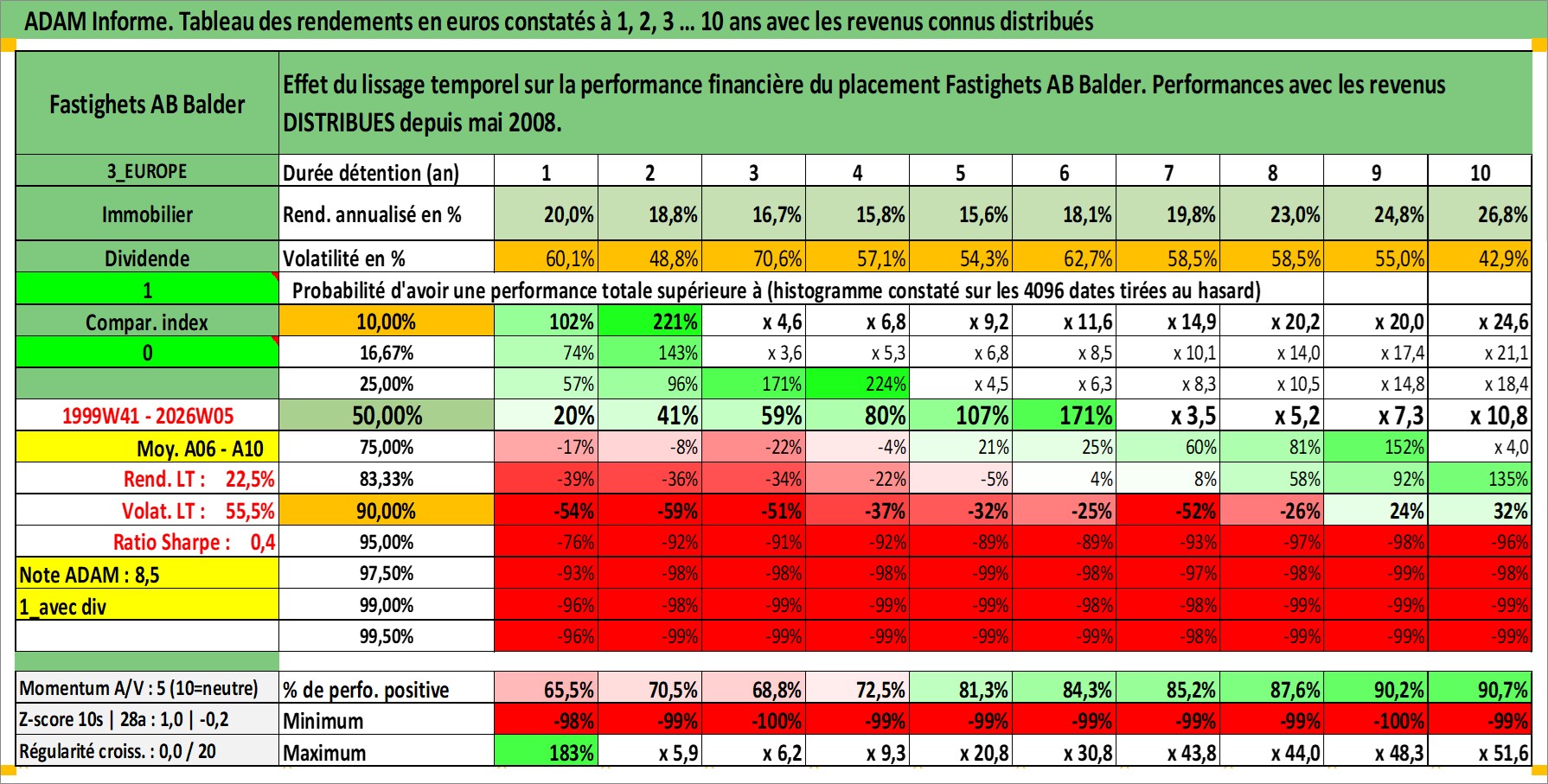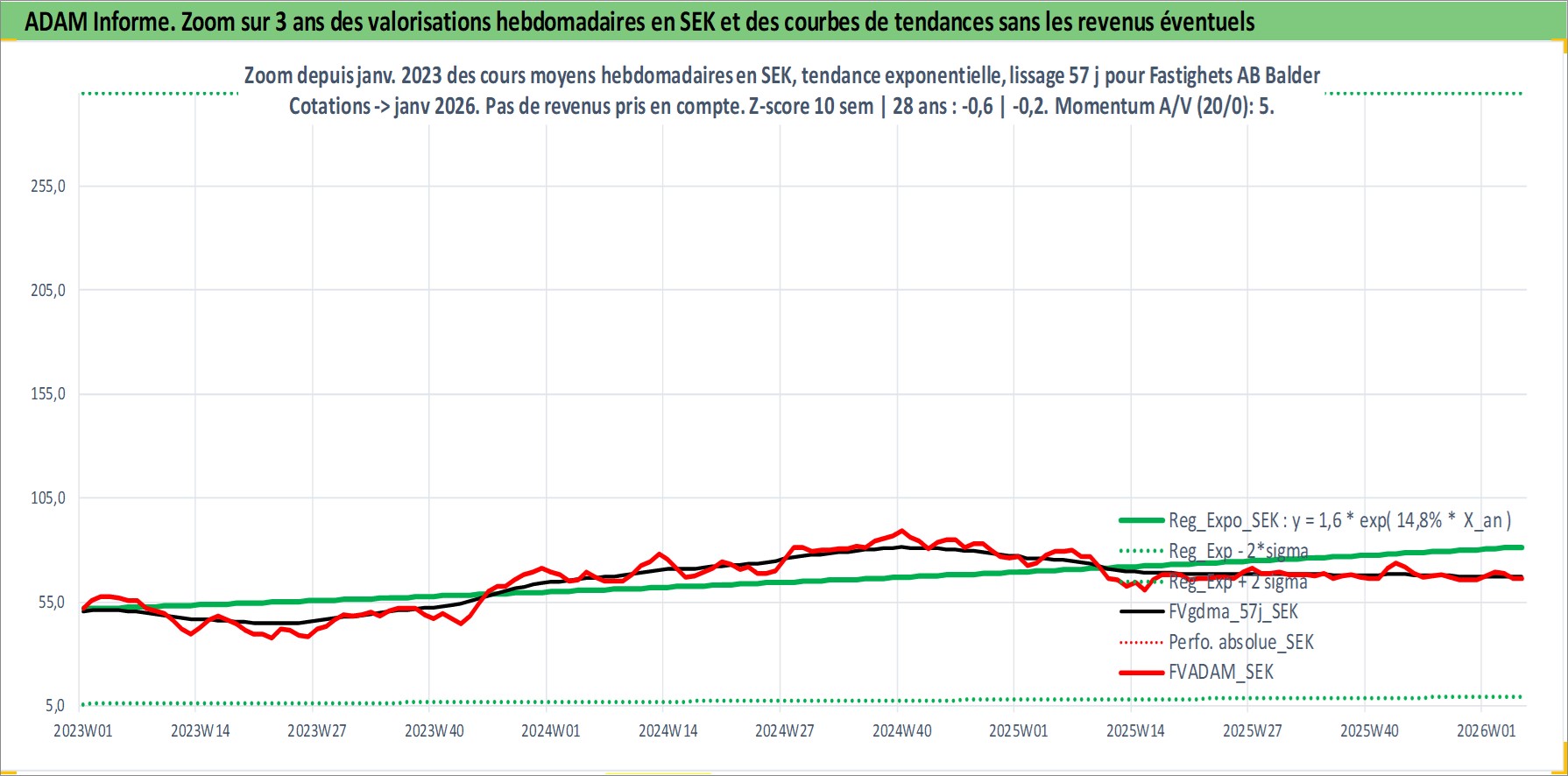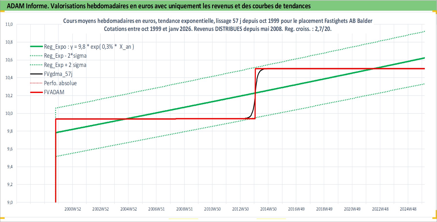 Site dédié aux investisseursPage dédiée sur site financeAnalyse des valorisations hebdomadaires de l'action Fastighets AB Balder. Cet actif est cote en SEK. Les valorisations sont en contrevaleur EURO et couvrent les semaines 1999W41 a 2026W05. Les revenus de cet actif financier sont pris en compte depuis la semaine 2008W19. La note ESG de cet actif n'est pas connue.