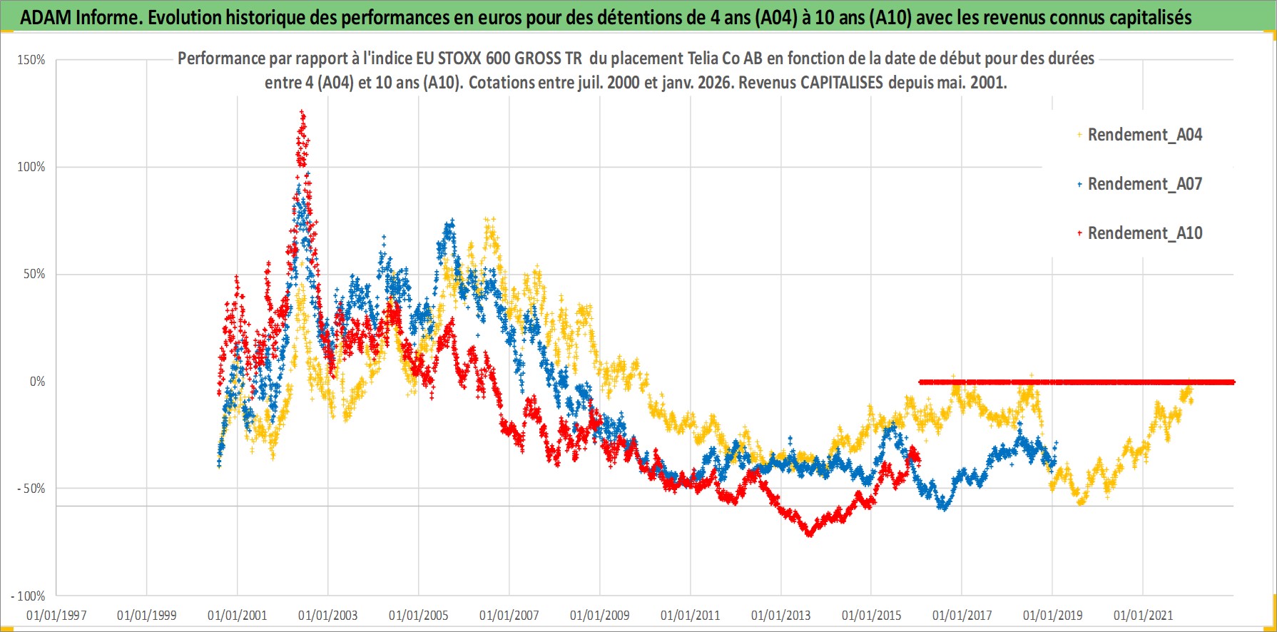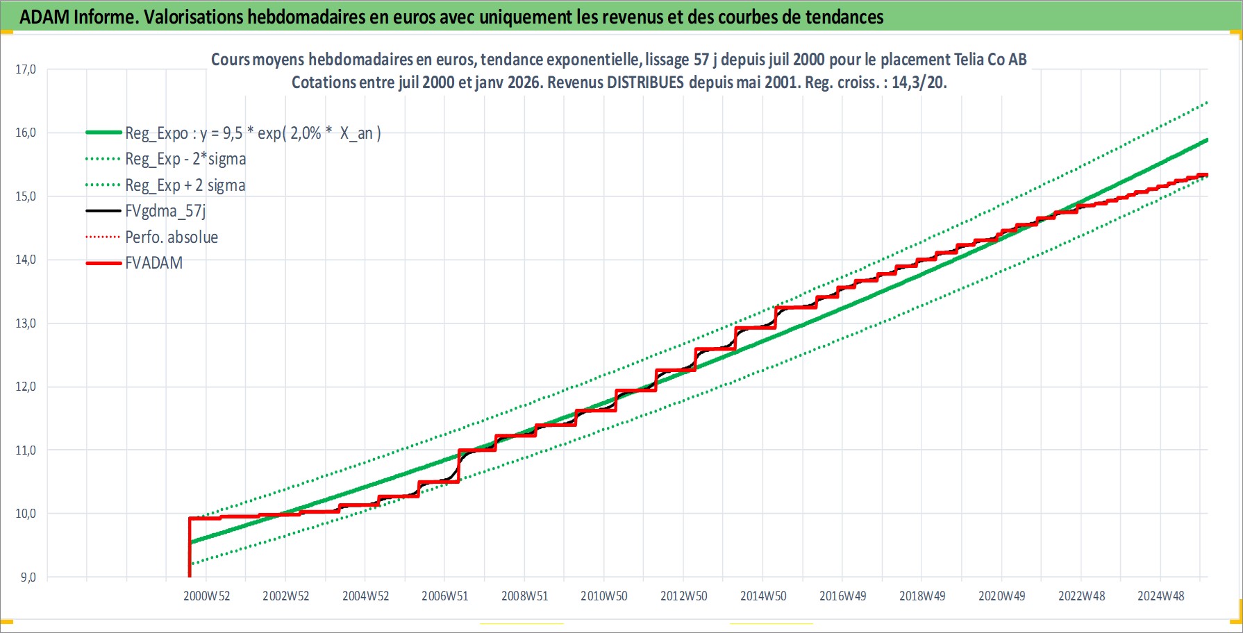 Site dédié aux investisseursPage dédiée sur site financeAnalyse des valorisations hebdomadaires de l'action Telia Co AB. Cet actif est cote en SEK. Les valorisations sont en contrevaleur EURO et couvrent les semaines 2000W30 a 2026W05. Les revenus de cet actif financier sont pris en compte depuis la semaine 2001W19. La note globale ESG de cet actif est estimee a 11.0 (apres rebasage entre 0 et 20).