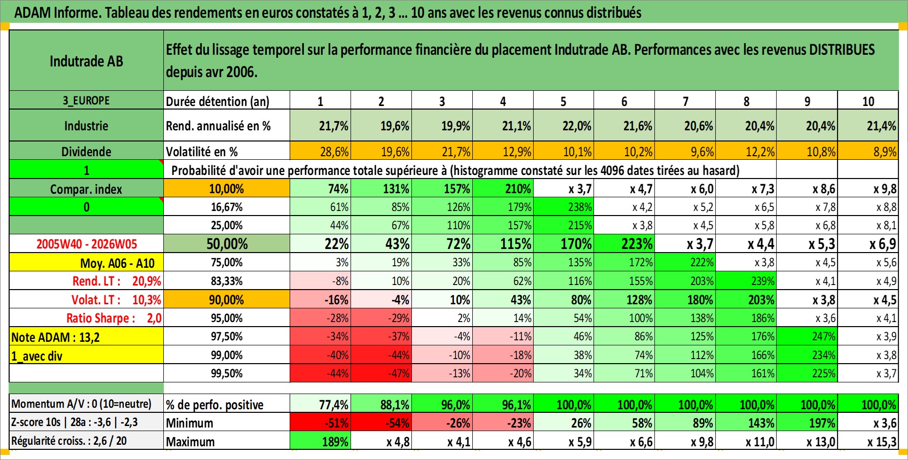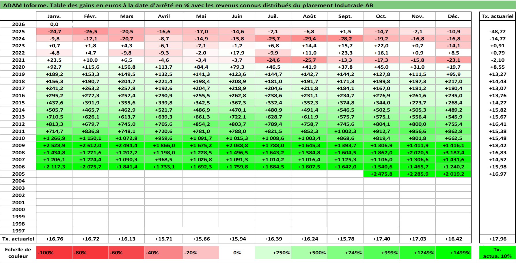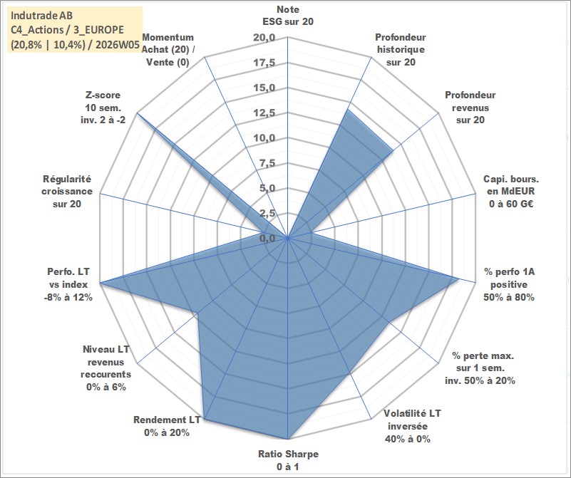 Site dédié aux investisseursPage dédiée sur site financeAnalyse des valorisations hebdomadaires de l'action Indutrade AB. Cet actif est cote en SEK. Les valorisations sont en contrevaleur EURO et couvrent les semaines 2005W40 a 2026W05. Les revenus de cet actif financier sont pris en compte depuis la semaine 2006W17. La note ESG de cet actif n'est pas connue.