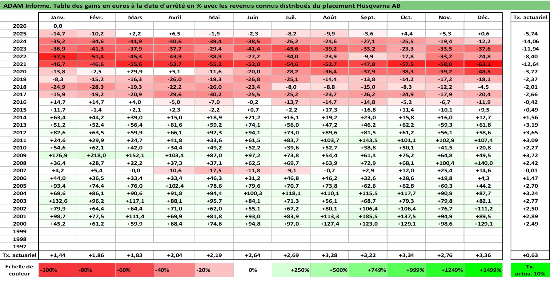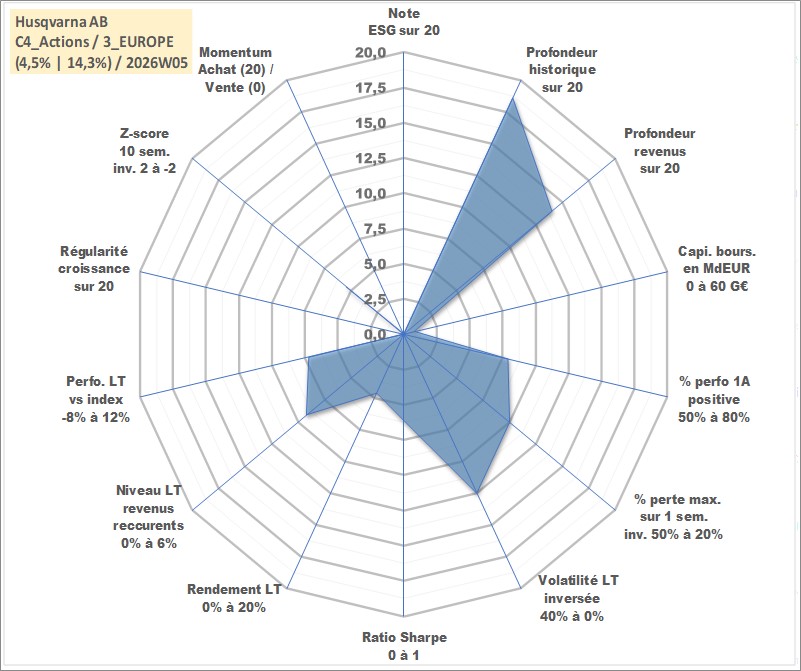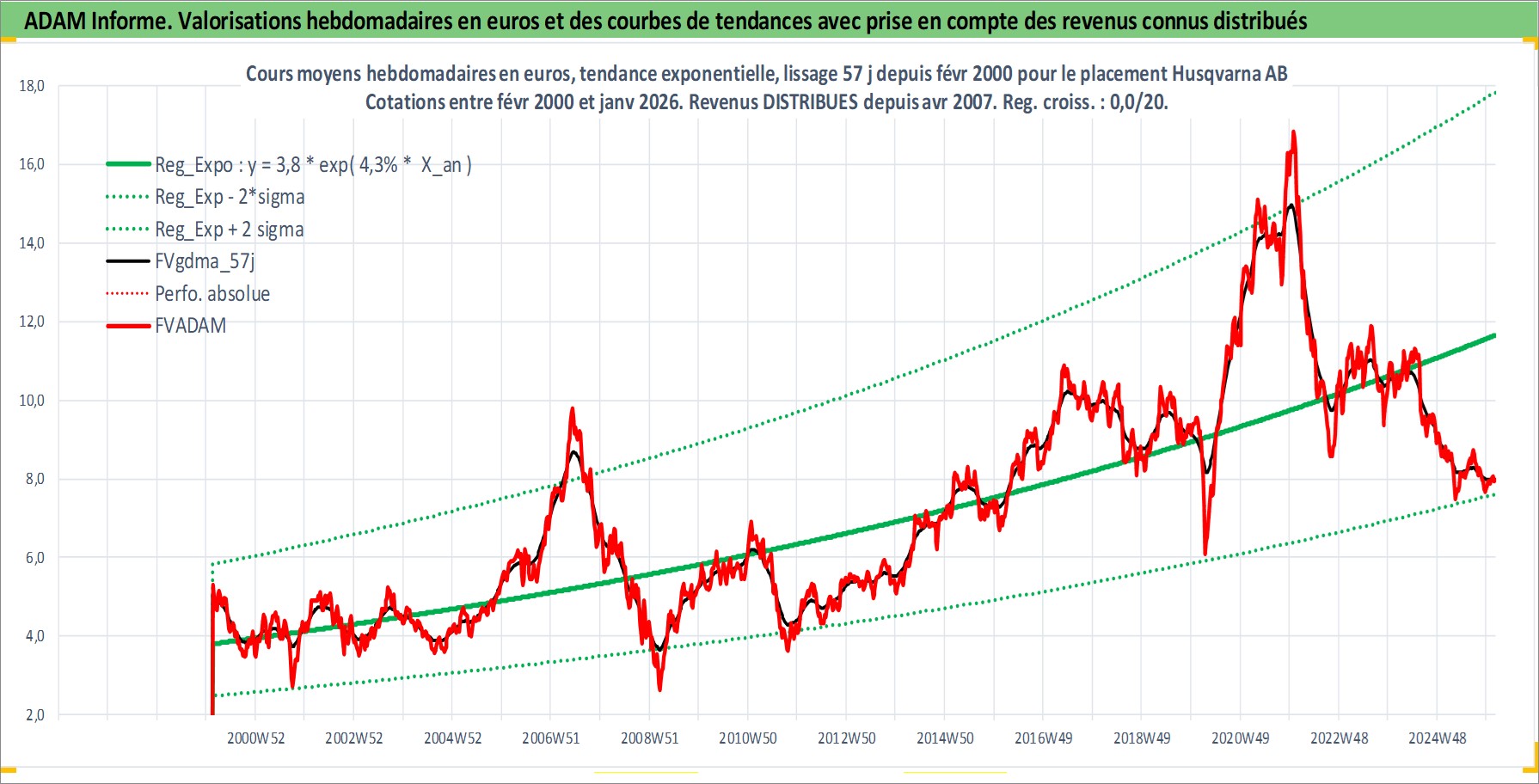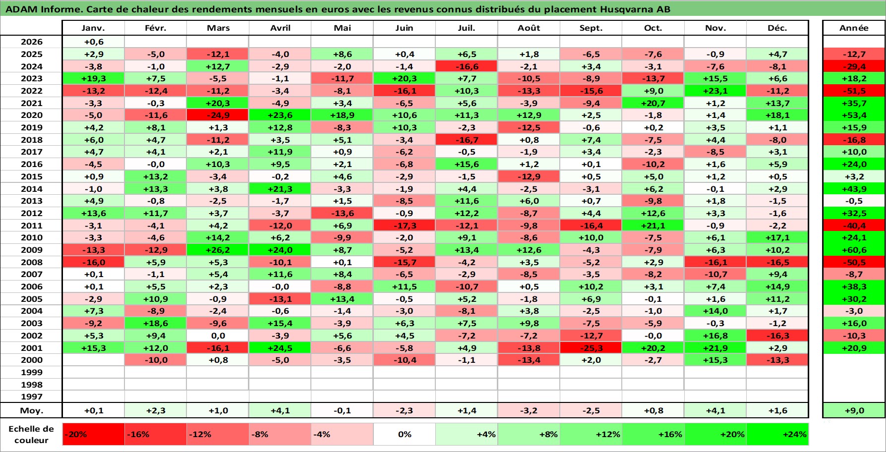 Site dédié aux investisseursPage dédiée sur site financeAnalyse des valorisations hebdomadaires de l'action Husqvarna AB. Cet actif est cote en SEK. Les valorisations sont en contrevaleur EURO et couvrent les semaines 2000W07 a 2026W05. Les revenus de cet actif financier sont pris en compte depuis la semaine 2007W16. La note ESG de cet actif n'est pas connue.