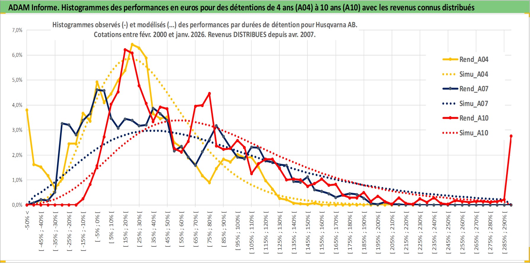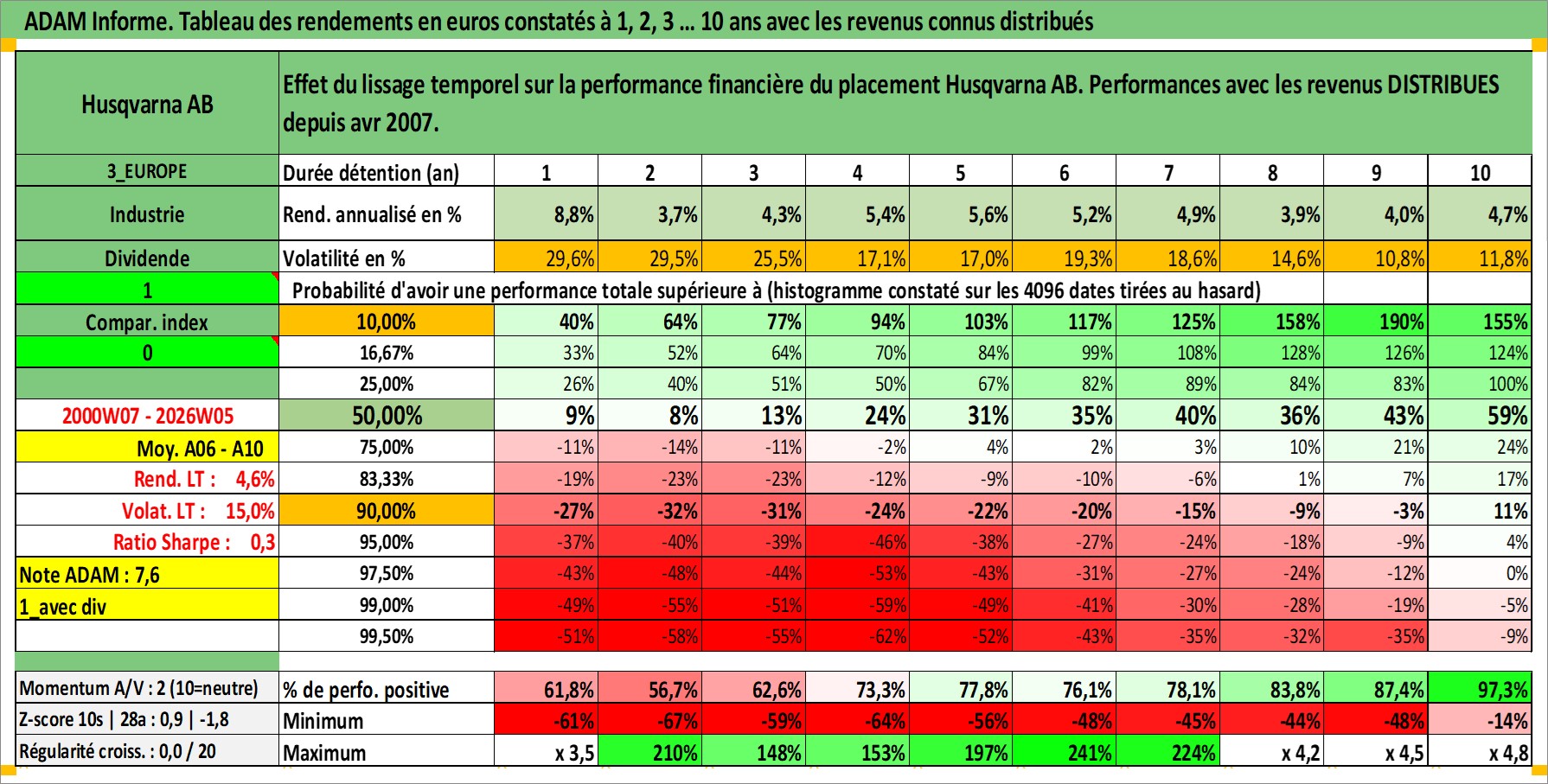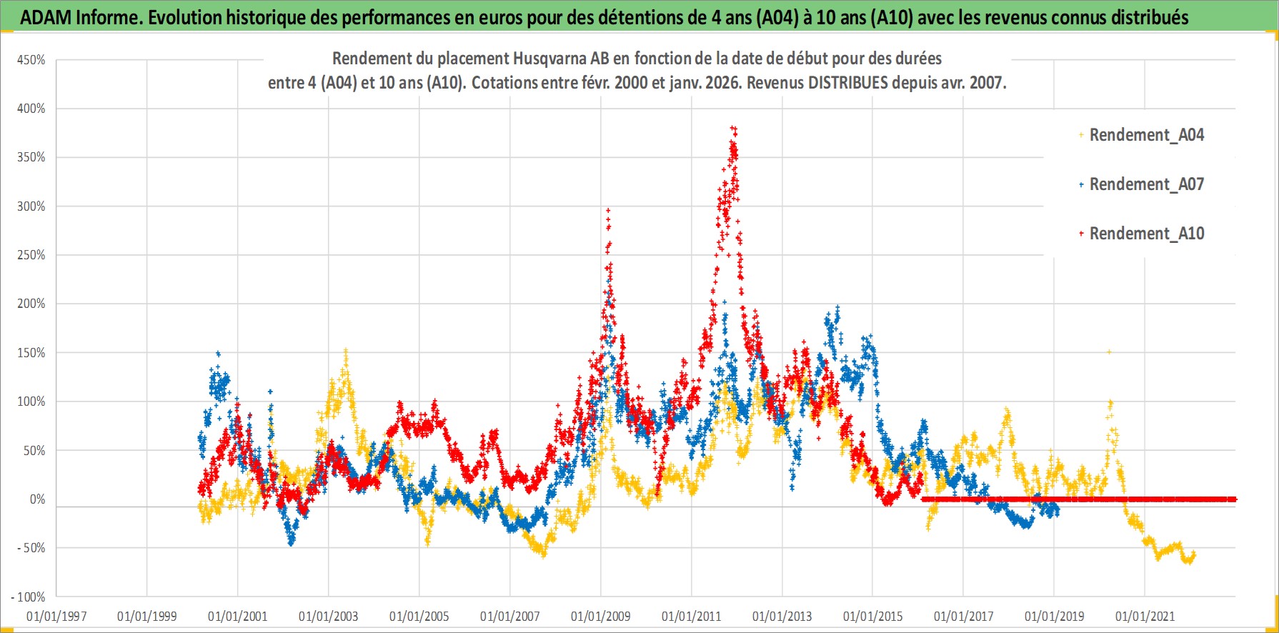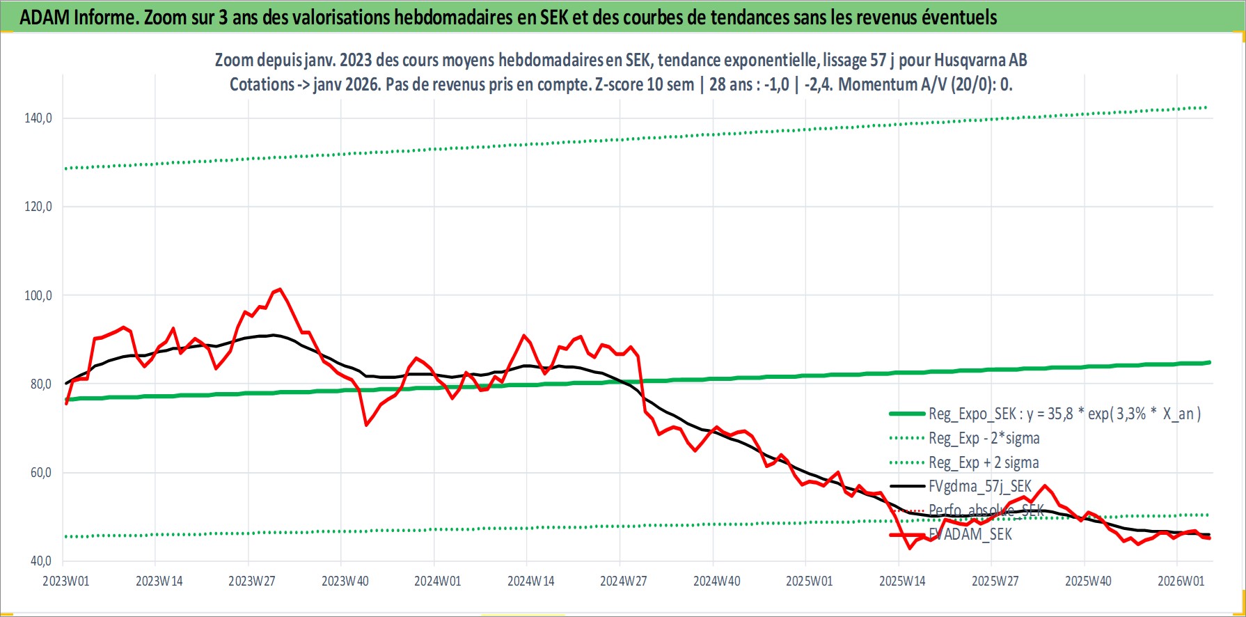 Site dédié aux investisseursPage dédiée sur site financeAnalyse des valorisations hebdomadaires de l'action Husqvarna AB. Cet actif est cote en SEK. Les valorisations sont en contrevaleur EURO et couvrent les semaines 2000W07 a 2026W05. Les revenus de cet actif financier sont pris en compte depuis la semaine 2007W16. La note ESG de cet actif n'est pas connue.