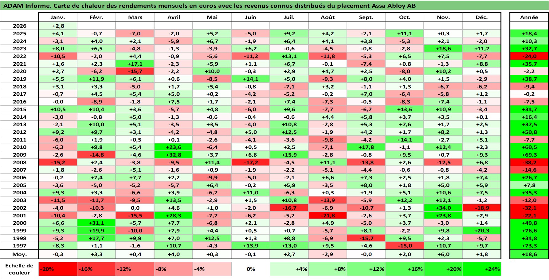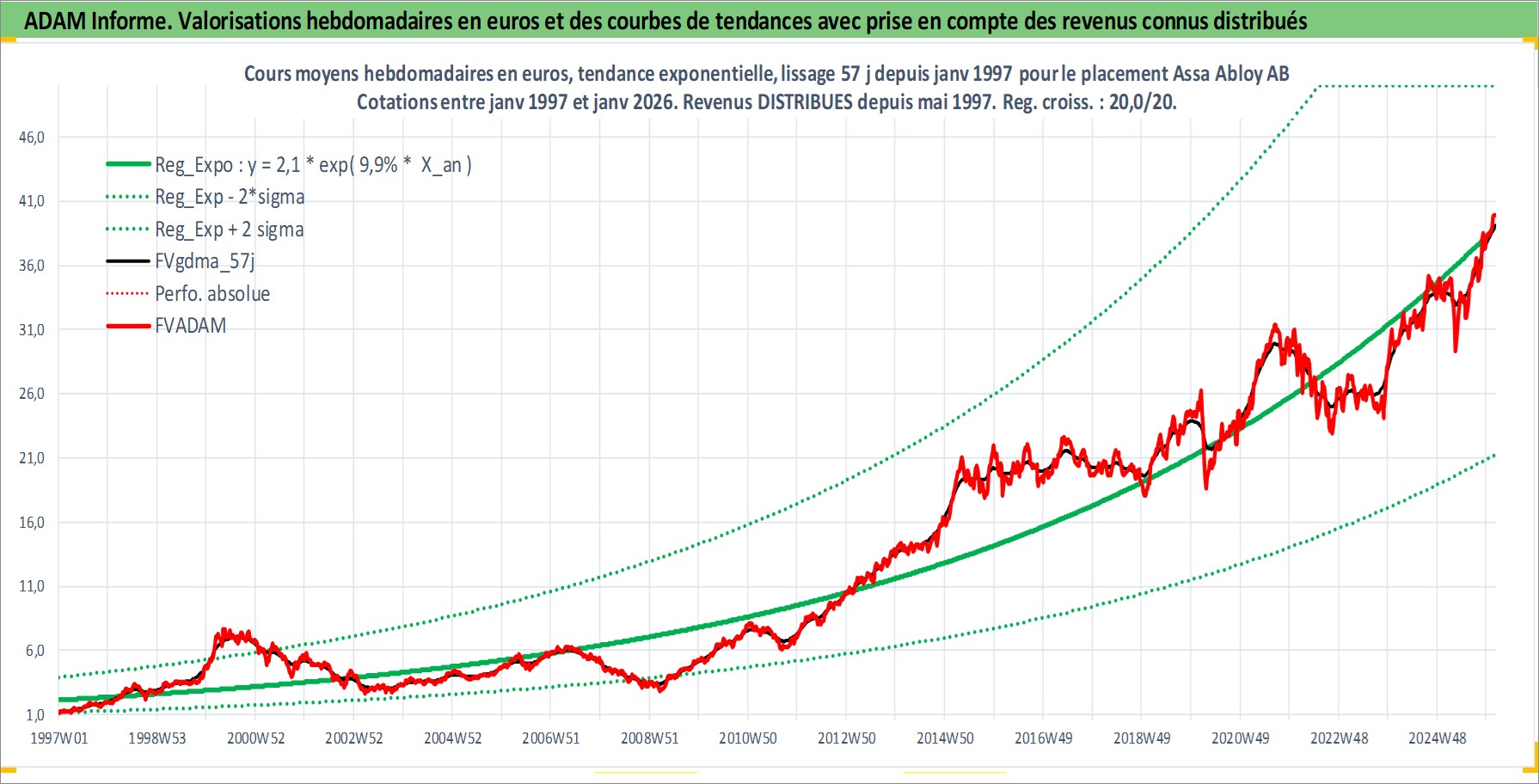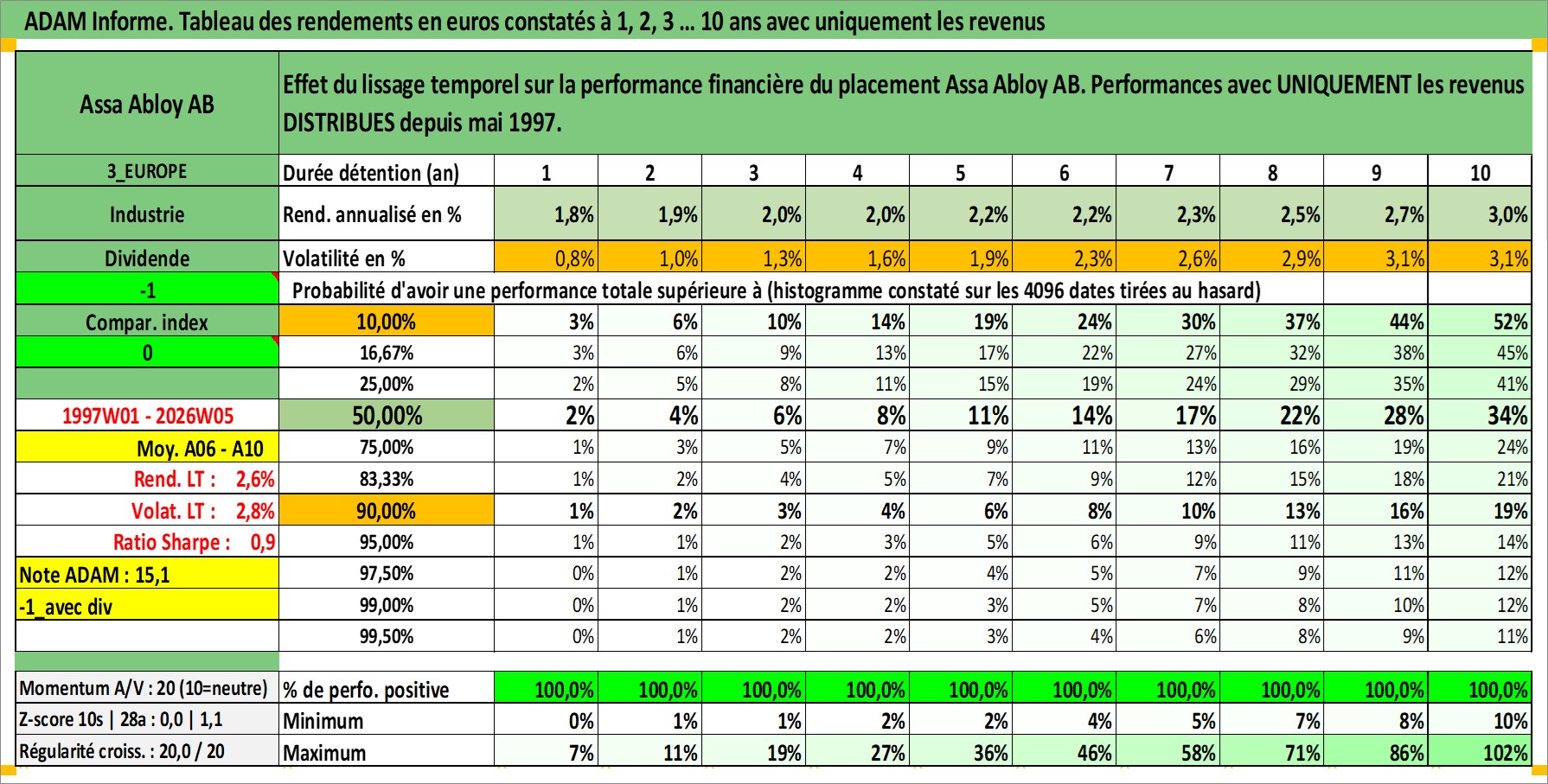 Site dédié aux investisseursPage dédiée sur site financeAnalyse des valorisations hebdomadaires de l'action Assa Abloy AB. Cet actif est cote en SEK. Les valorisations sont en contrevaleur EURO et couvrent les semaines 1997W01 a 2026W05. Les revenus de cet actif financier sont pris en compte depuis la semaine 1997W19. La note globale ESG de cet actif est estimee a 12.0 (apres rebasage entre 0 et 20).
