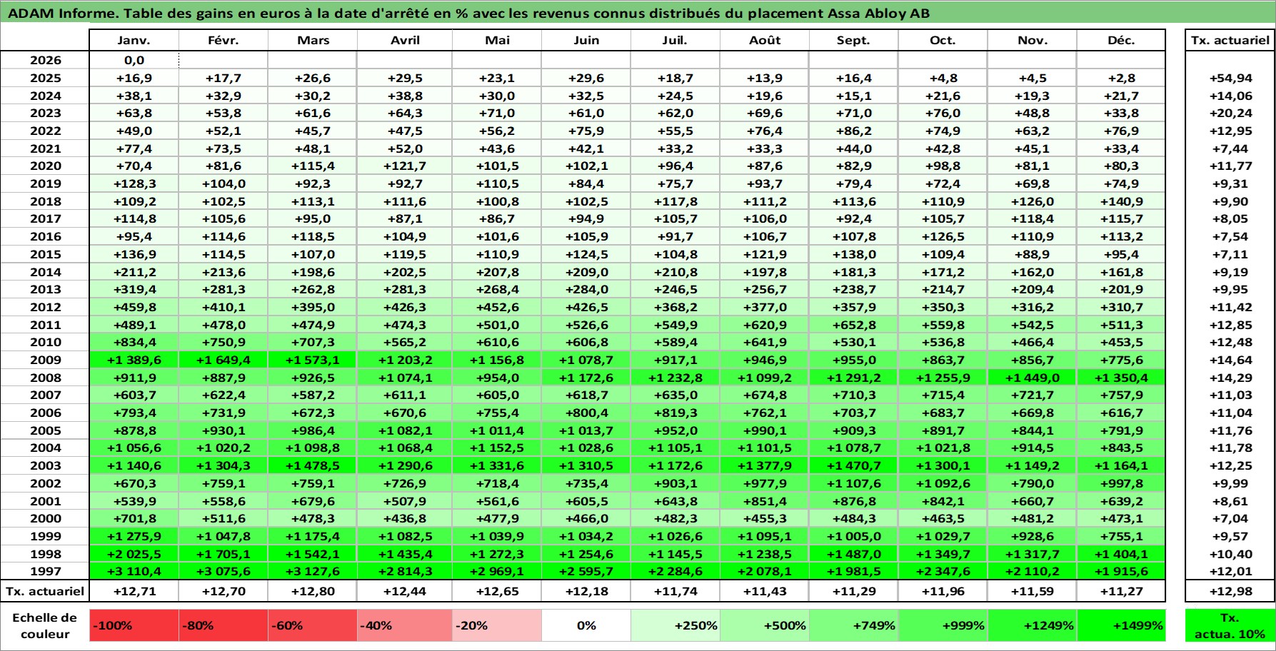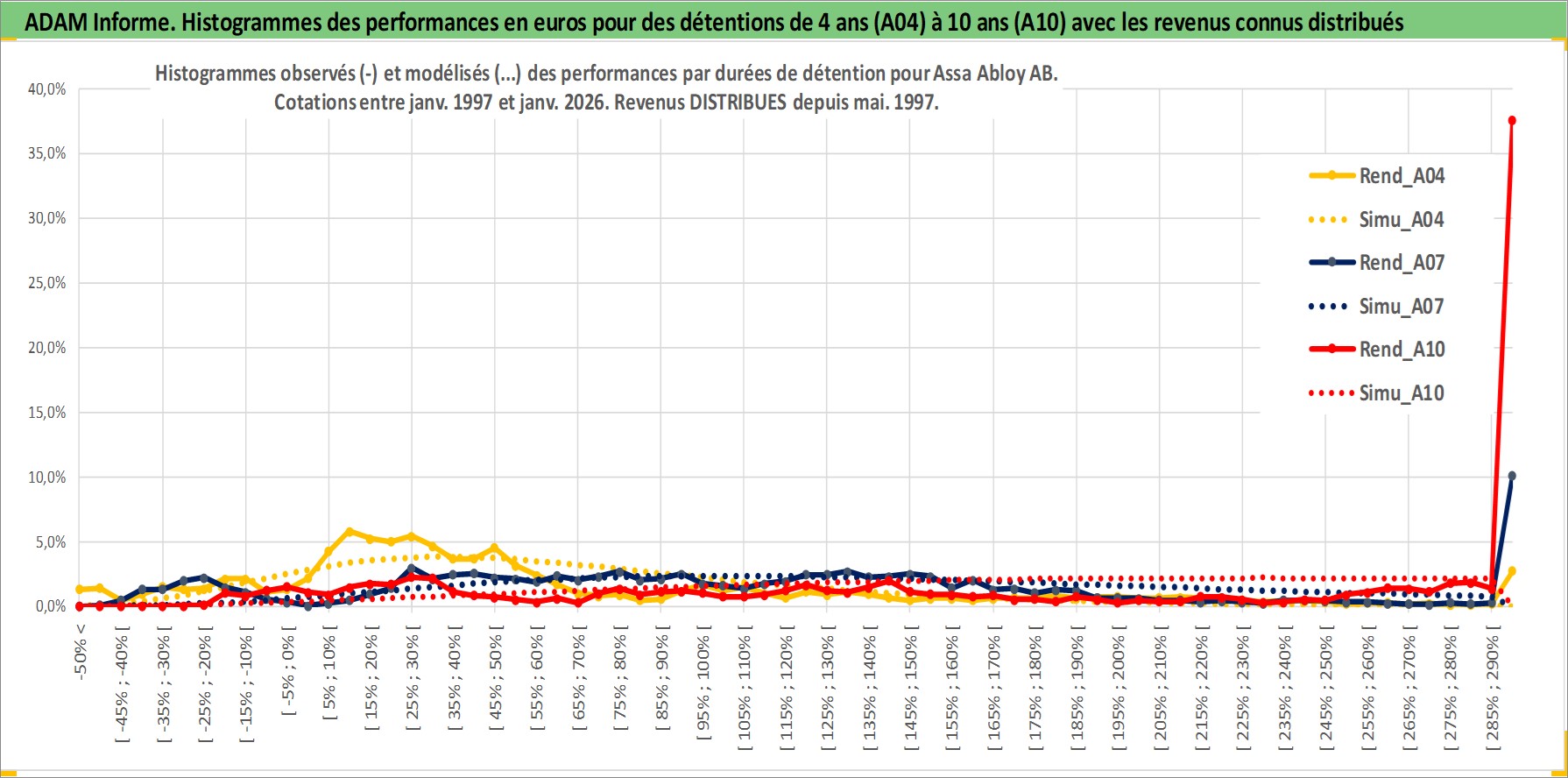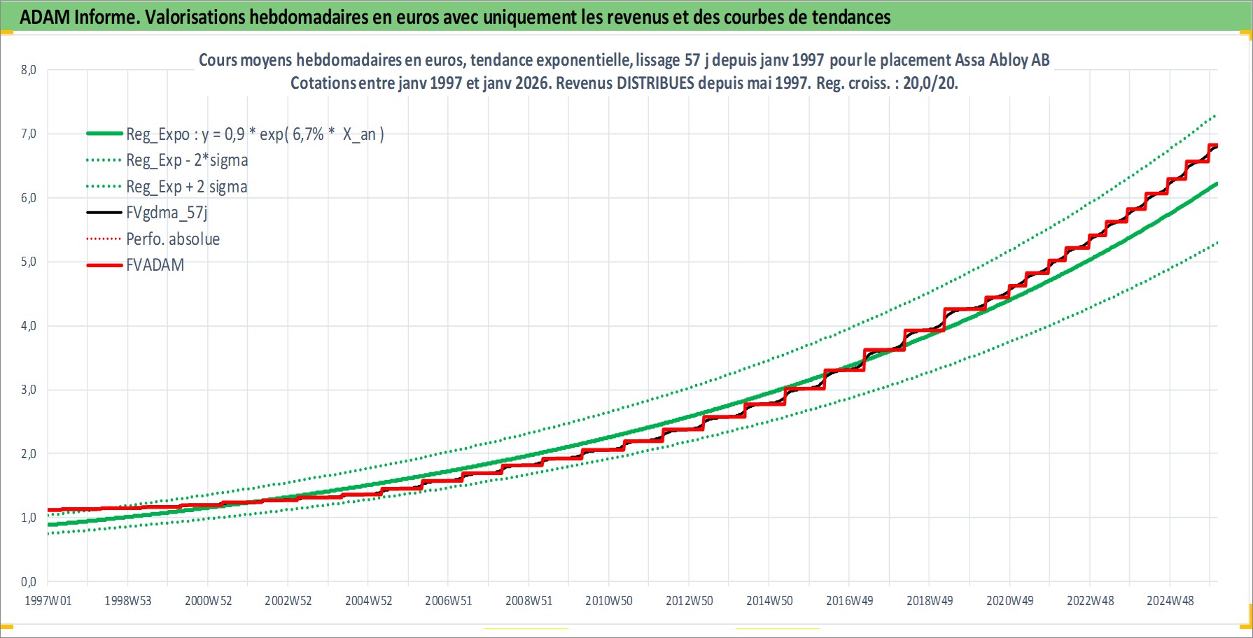 Site dédié aux investisseursPage dédiée sur site financeAnalyse des valorisations hebdomadaires de l'action Assa Abloy AB. Cet actif est cote en SEK. Les valorisations sont en contrevaleur EURO et couvrent les semaines 1997W01 a 2026W05. Les revenus de cet actif financier sont pris en compte depuis la semaine 1997W19. La note globale ESG de cet actif est estimee a 12.0 (apres rebasage entre 0 et 20).