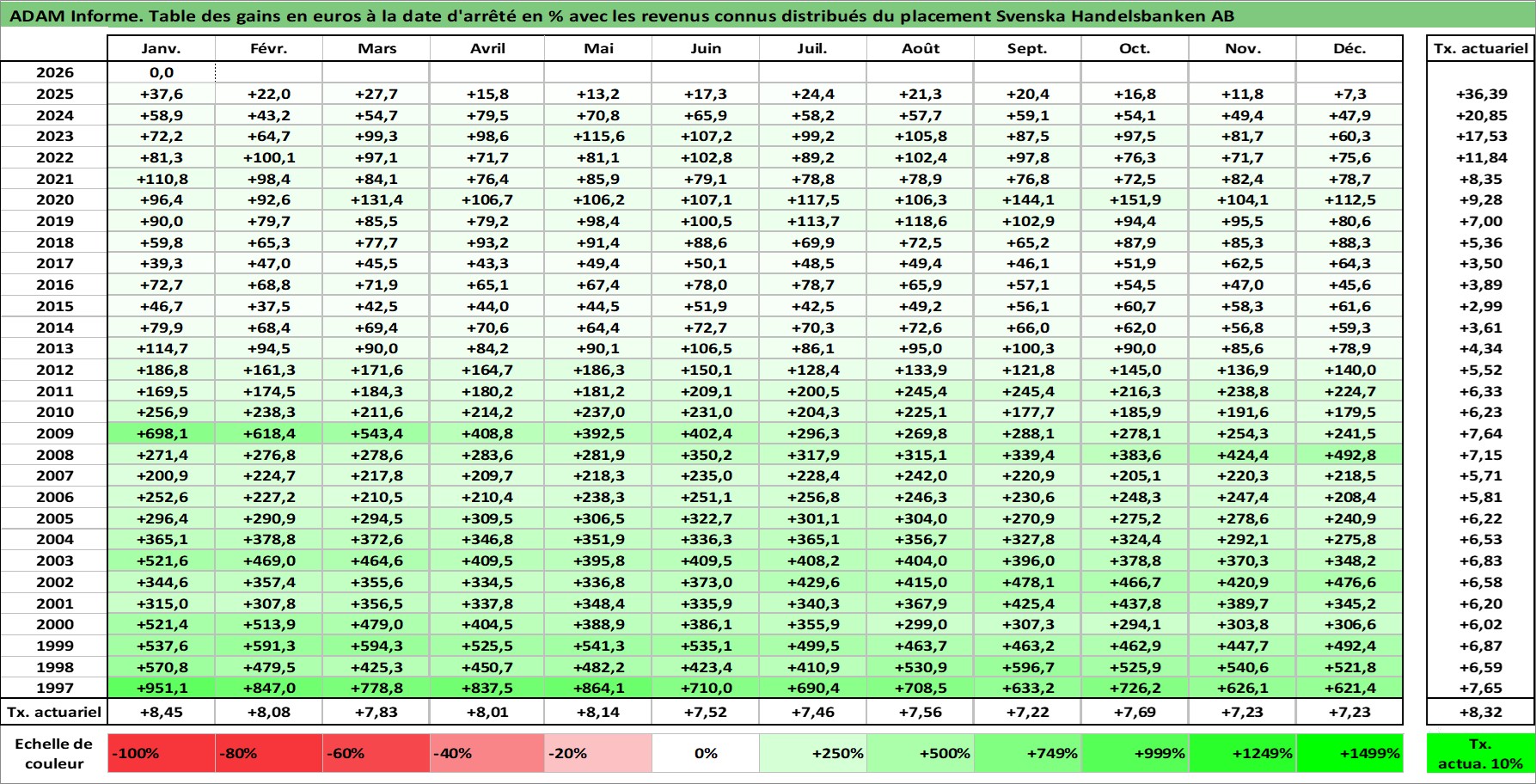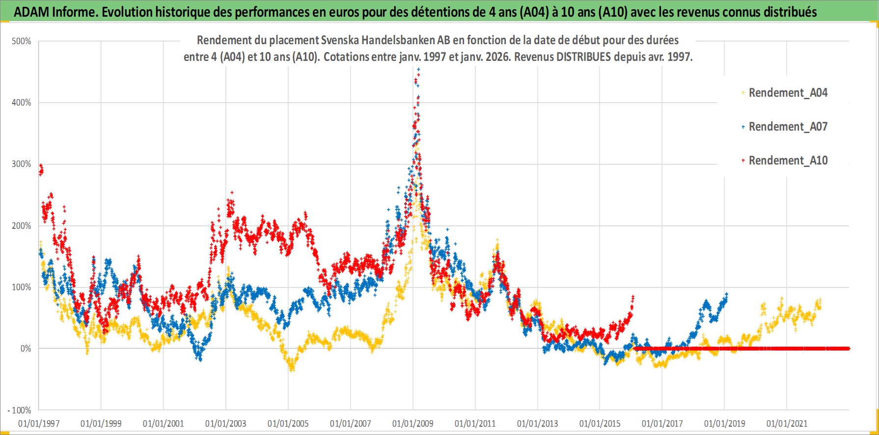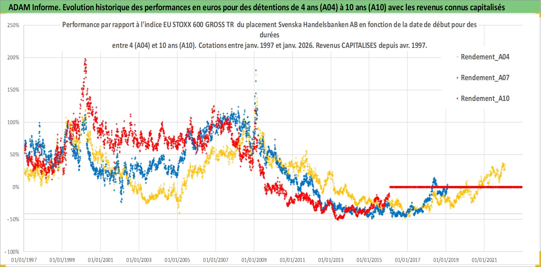 Site dédié aux investisseursPage dédiée sur site financeAnalyse des valorisations hebdomadaires de l'action Svenska Handelsbanken AB. Cet actif est cote en SEK. Les valorisations sont en contrevaleur EURO et couvrent les semaines 1997W01 a 2026W05. Les revenus de cet actif financier sont pris en compte depuis la semaine 1997W17. La note globale ESG de cet actif est estimee a 12.0 (apres rebasage entre 0 et 20).