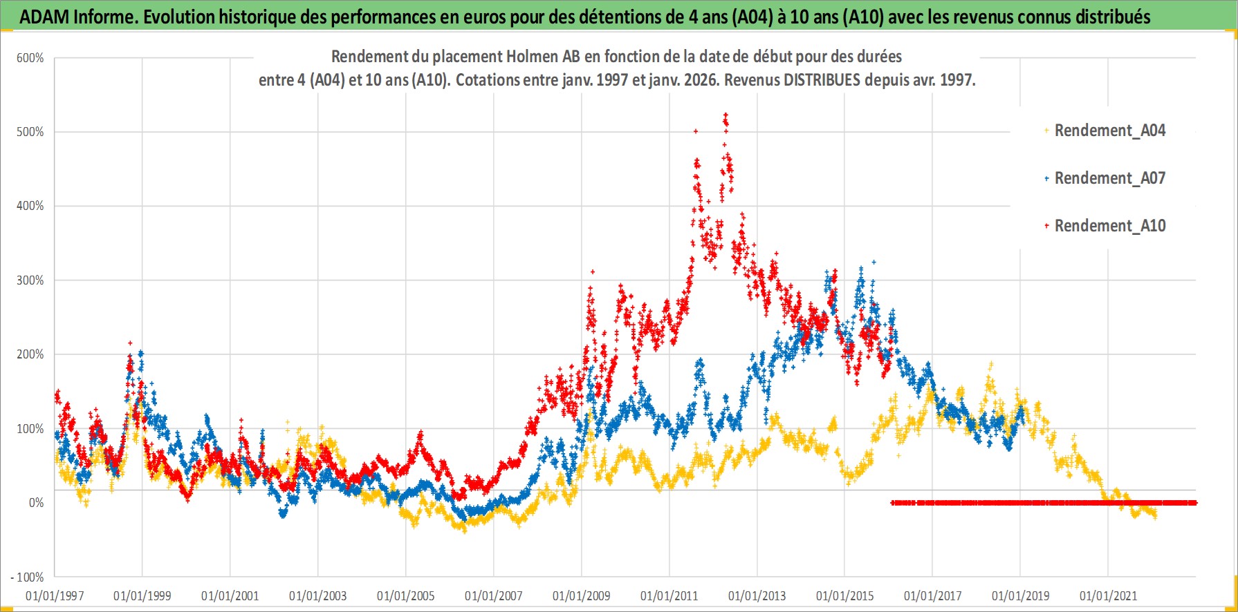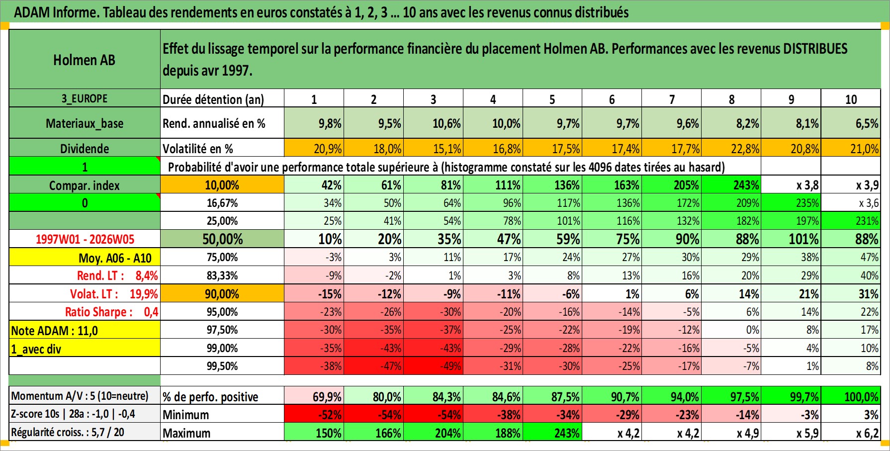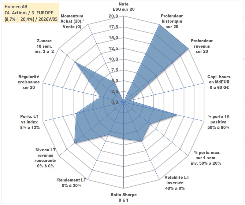 Site dédié aux investisseursPage dédiée sur site financeAnalyse des valorisations hebdomadaires de l'action Holmen AB. Cet actif est cote en SEK. Les valorisations sont en contrevaleur EURO et couvrent les semaines 1997W01 a 2026W05. Les revenus de cet actif financier sont pris en compte depuis la semaine 1997W15. La note ESG de cet actif n'est pas connue.