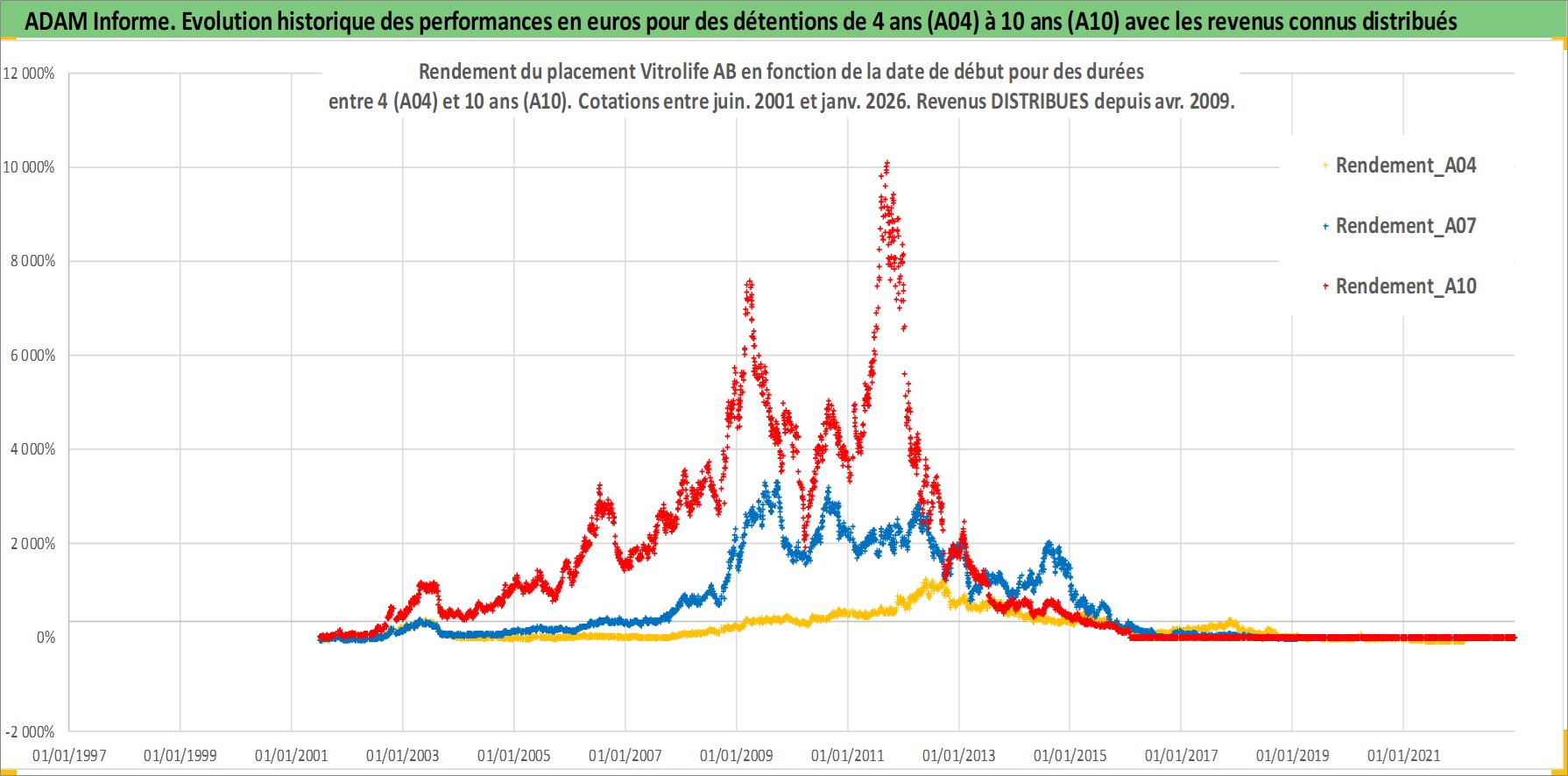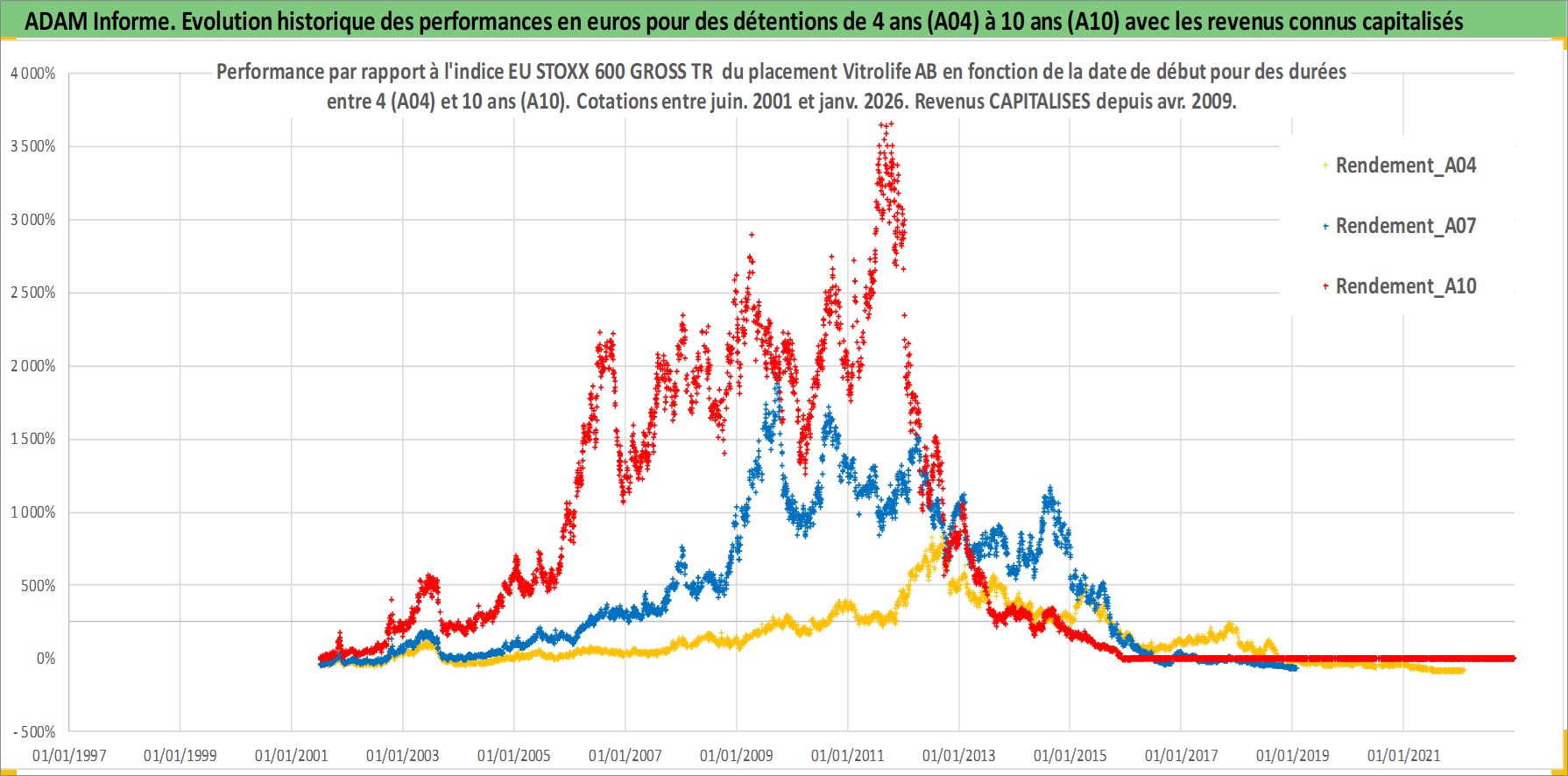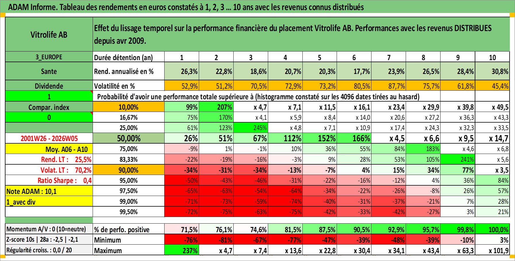 Site dédié aux investisseursPage dédiée sur site financeAnalyse des valorisations hebdomadaires de l'action Vitrolife AB. Cet actif est cote en SEK. Les valorisations sont en contrevaleur EURO et couvrent les semaines 2001W26 a 2026W05. Les revenus de cet actif financier sont pris en compte depuis la semaine 2009W18. La note ESG de cet actif n'est pas connue.