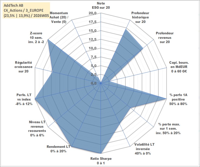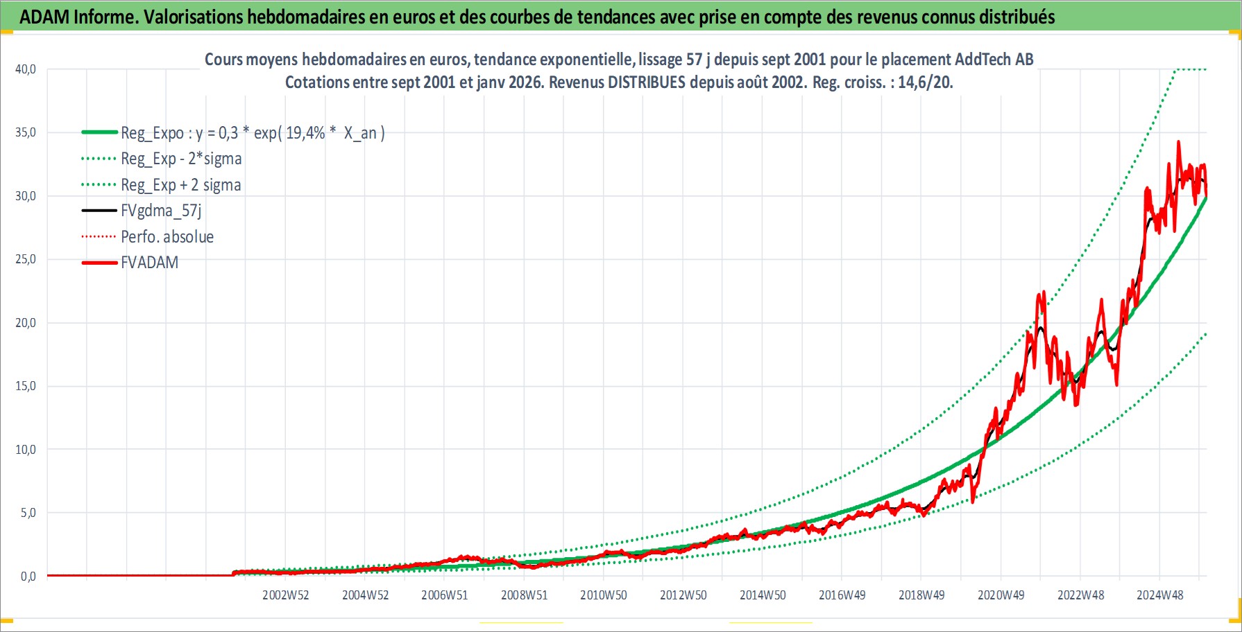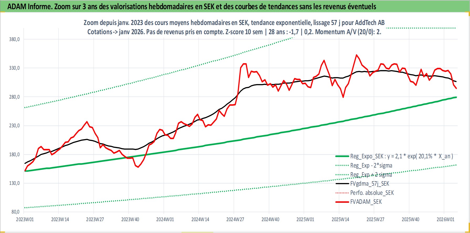 Site dédié aux investisseursPage dédiée sur site financeAnalyse des valorisations hebdomadaires de l'action AddTech AB. Cet actif est cote en SEK. Les valorisations sont en contrevaleur EURO et couvrent les semaines 2001W36 a 2026W05. Les revenus de cet actif financier sont pris en compte depuis la semaine 2002W34. La note ESG de cet actif n'est pas connue.