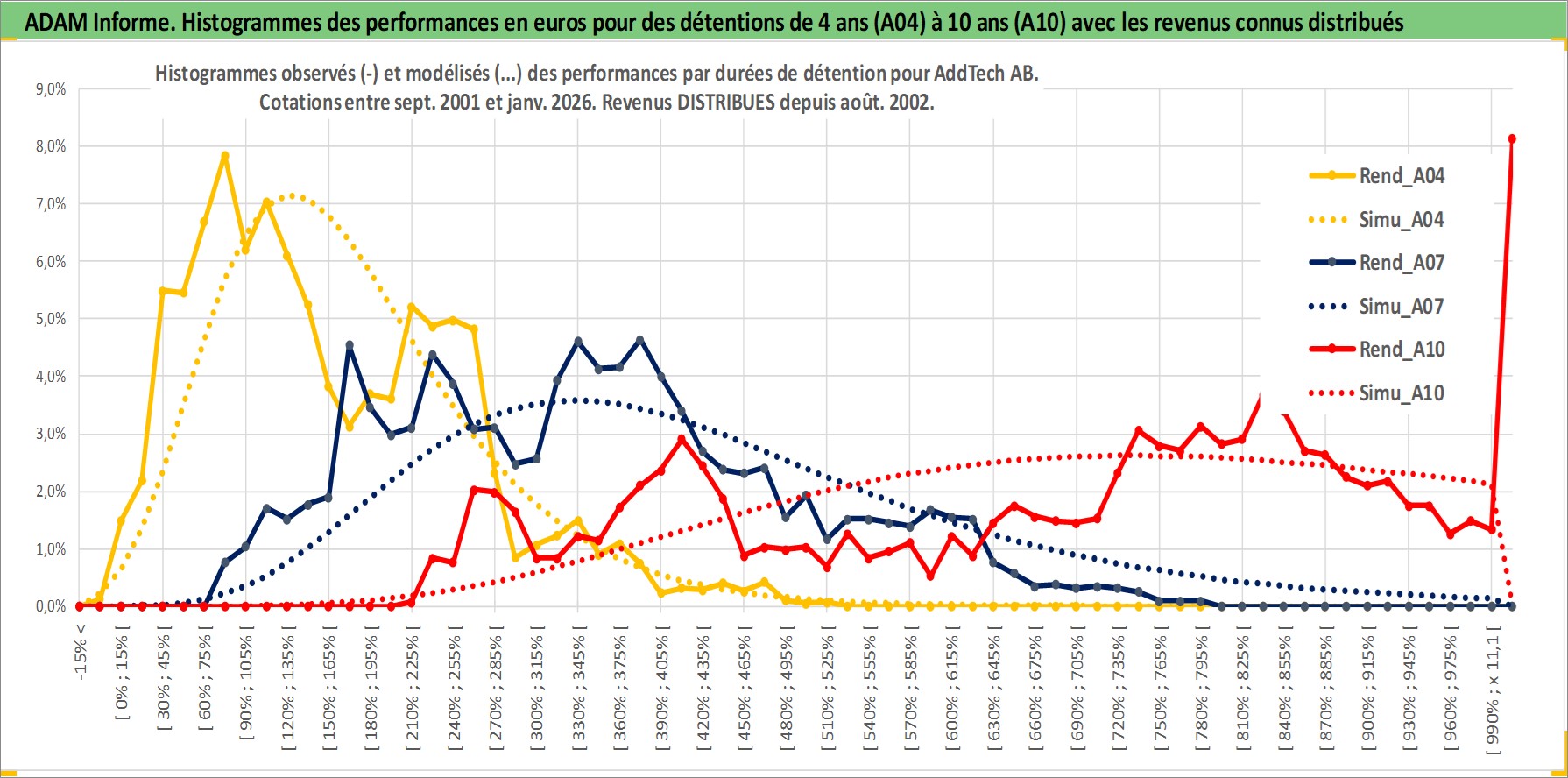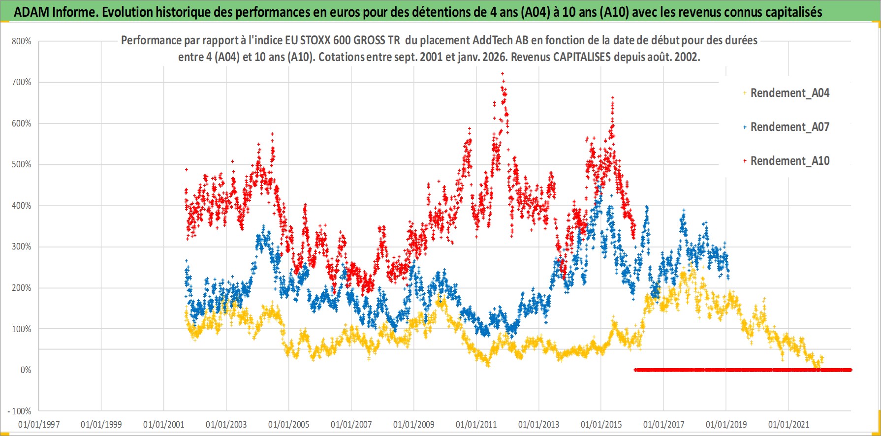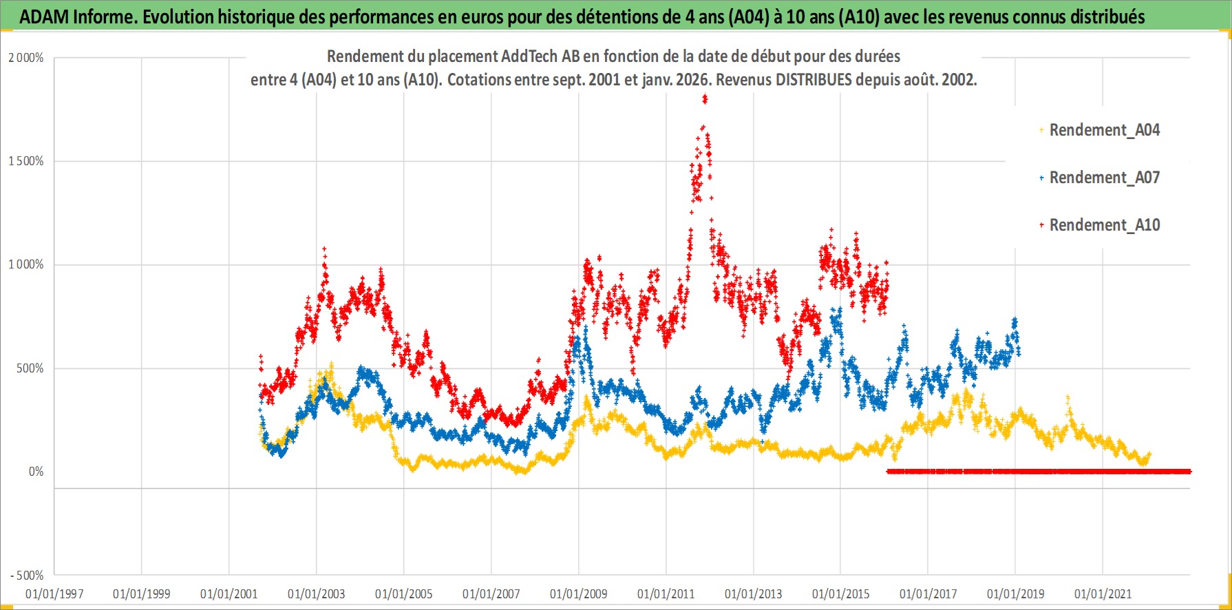 Site dédié aux investisseursPage dédiée sur site financeAnalyse des valorisations hebdomadaires de l'action AddTech AB. Cet actif est cote en SEK. Les valorisations sont en contrevaleur EURO et couvrent les semaines 2001W36 a 2026W05. Les revenus de cet actif financier sont pris en compte depuis la semaine 2002W34. La note ESG de cet actif n'est pas connue.