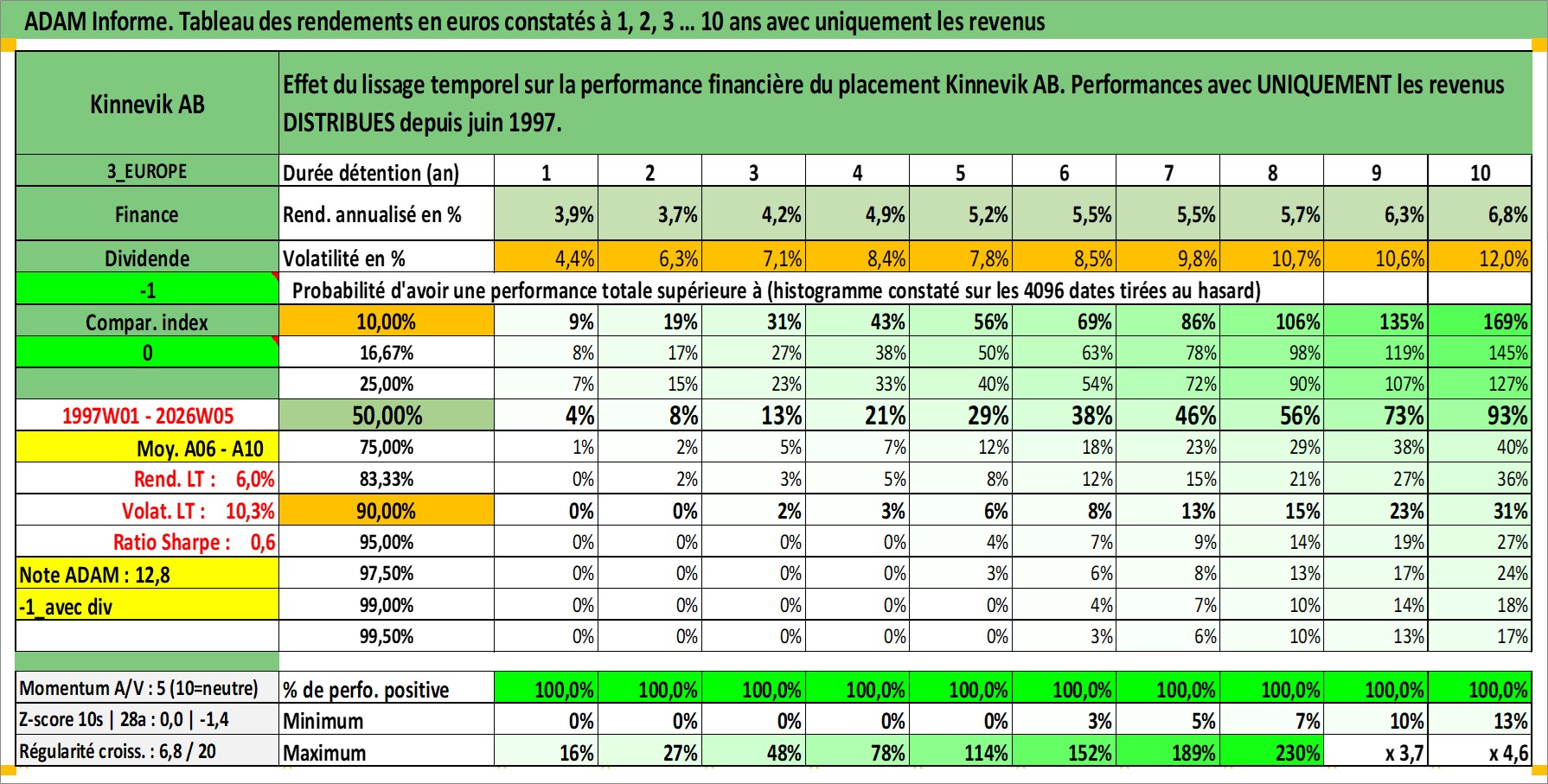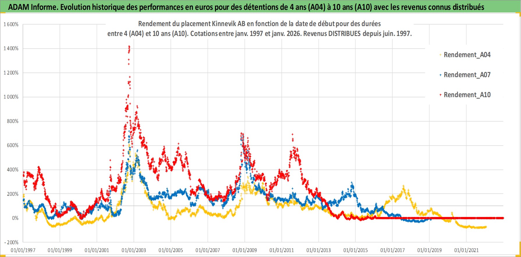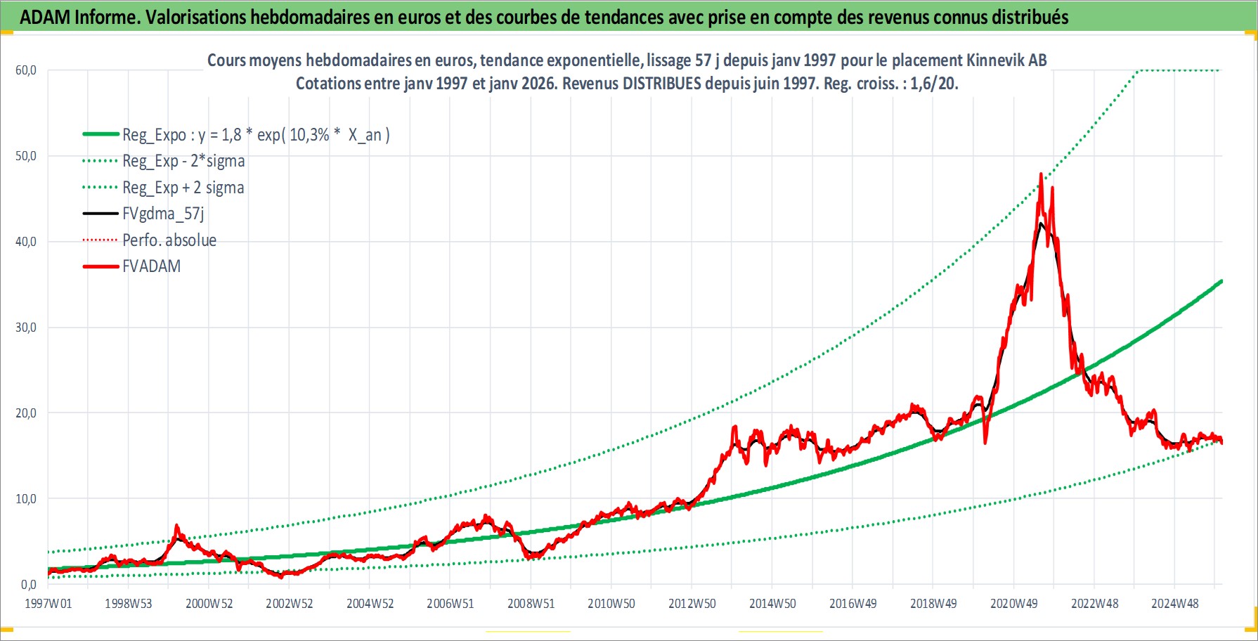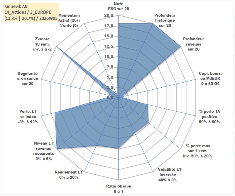 Site dédié aux investisseursPage dédiée sur site financeAnalyse des valorisations hebdomadaires de l'action Kinnevik AB. Cet actif est cote en SEK. Les valorisations sont en contrevaleur EURO et couvrent les semaines 1997W01 a 2026W05. Les revenus de cet actif financier sont pris en compte depuis la semaine 1997W26. La note globale ESG de cet actif est estimee a 18.0 (apres rebasage entre 0 et 20).