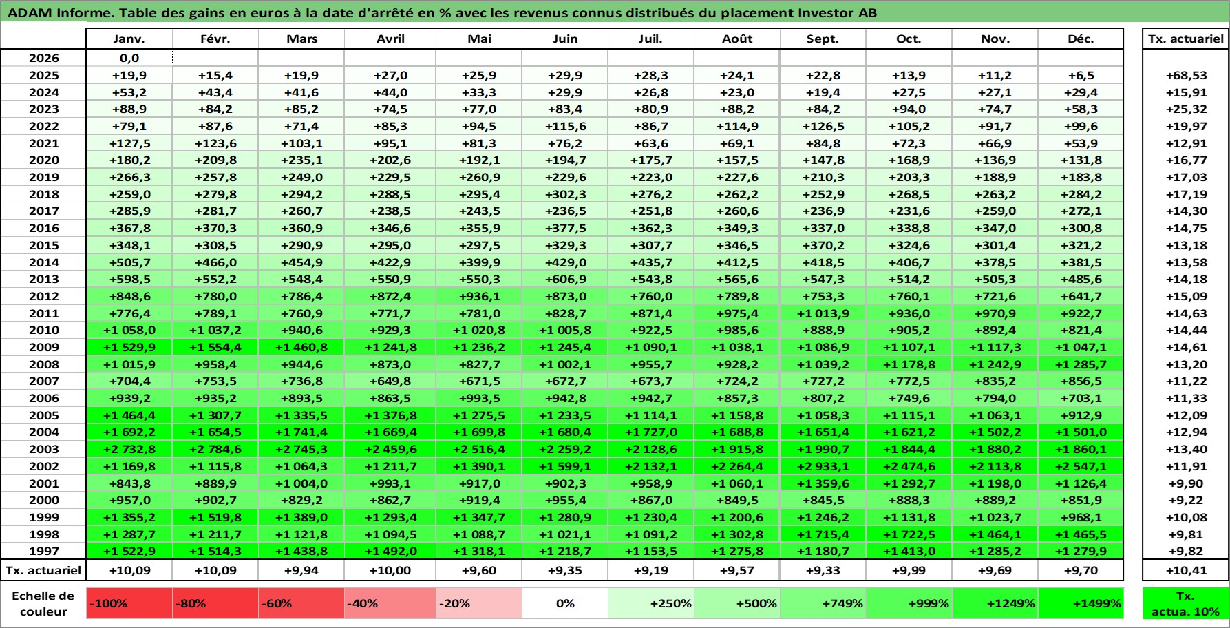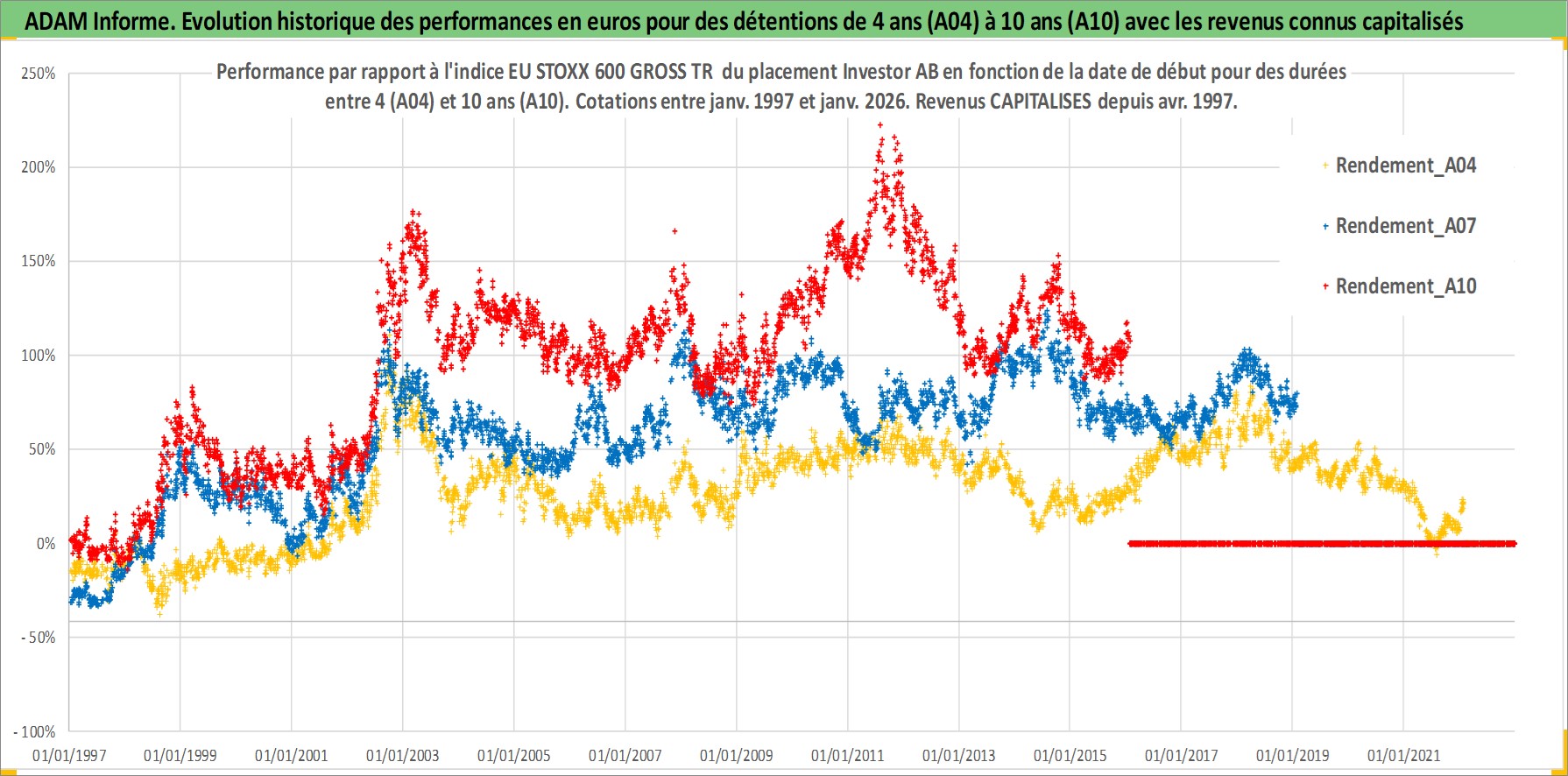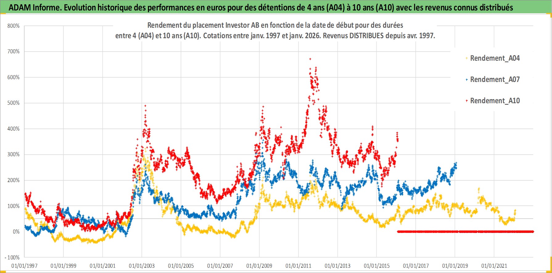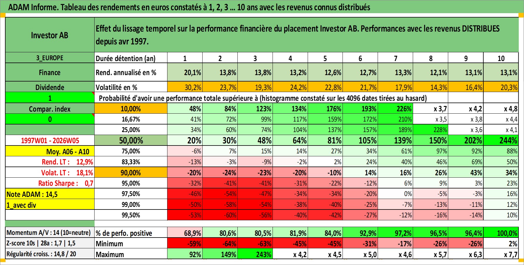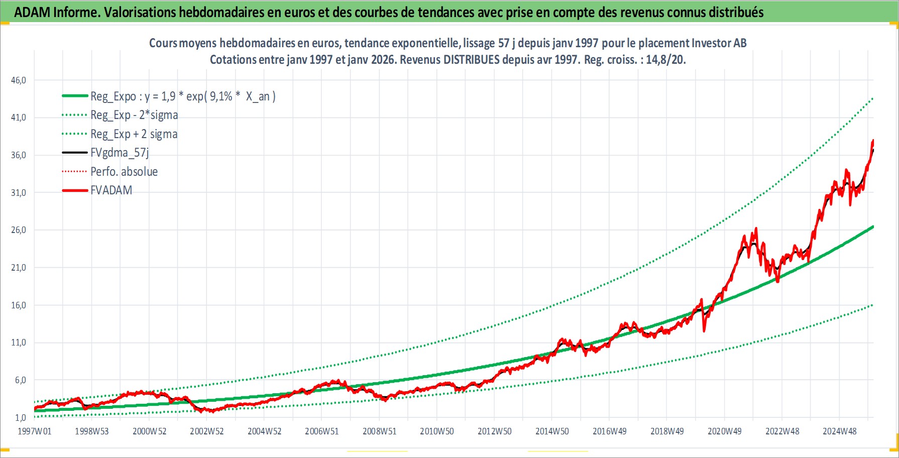 Site dédié aux investisseursPage dédiée sur site financeAnalyse des valorisations hebdomadaires de l'action Investor AB. Cet actif est cote en SEK. Les valorisations sont en contrevaleur EURO et couvrent les semaines 1997W01 a 2026W05. Les revenus de cet actif financier sont pris en compte depuis la semaine 1997W16. La note globale ESG de cet actif est estimee a 18.0 (apres rebasage entre 0 et 20).