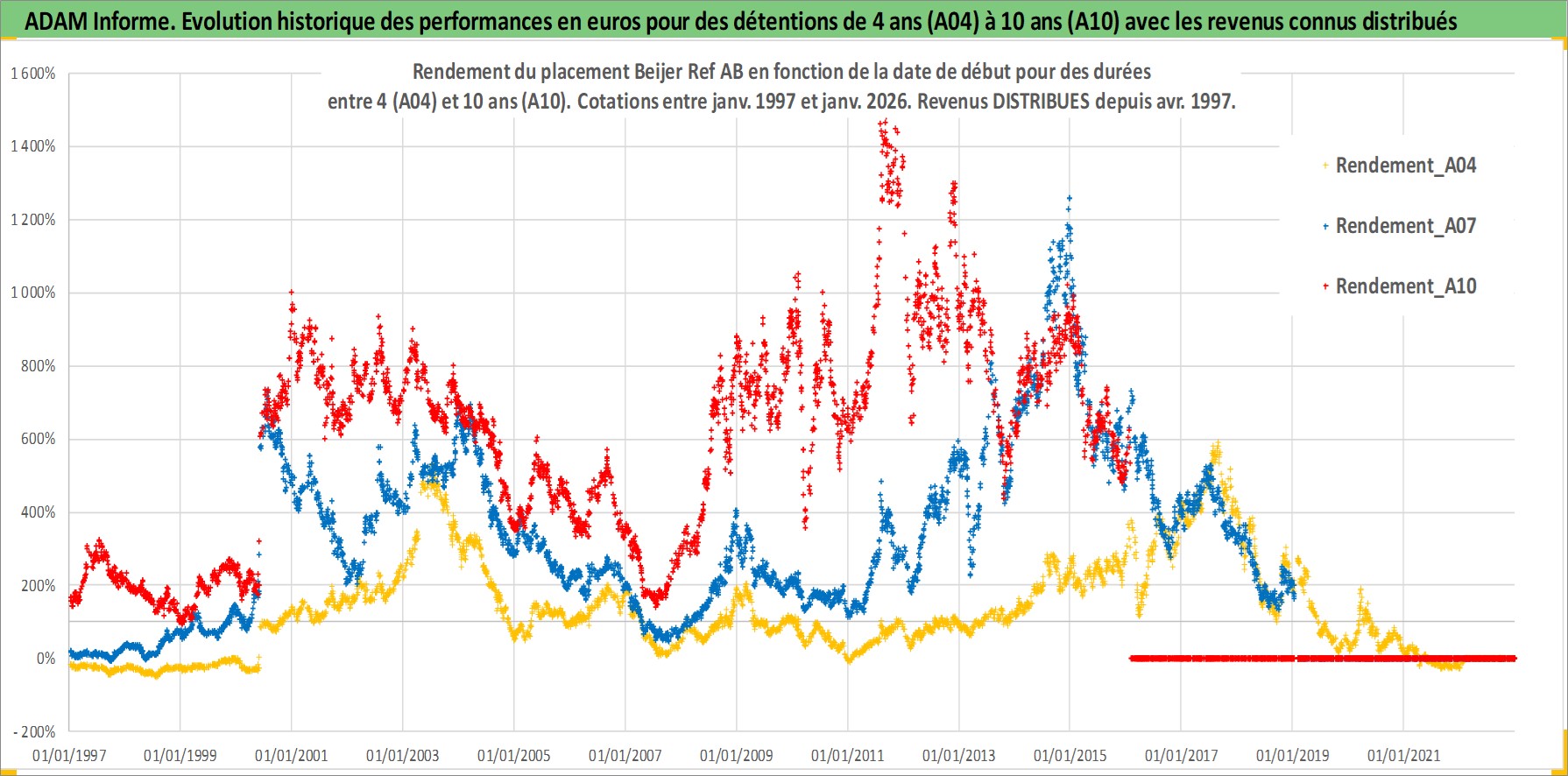 Site dédié aux investisseursPage dédiée sur site financeAnalyse des valorisations hebdomadaires de l'action Beijer Ref AB. Cet actif est cote en SEK. Les valorisations sont en contrevaleur EURO et couvrent les semaines 1997W01 a 2026W05. Les revenus de cet actif financier sont pris en compte depuis la semaine 1997W17. La note globale ESG de cet actif est estimee a 5.0 (apres rebasage entre 0 et 20).
