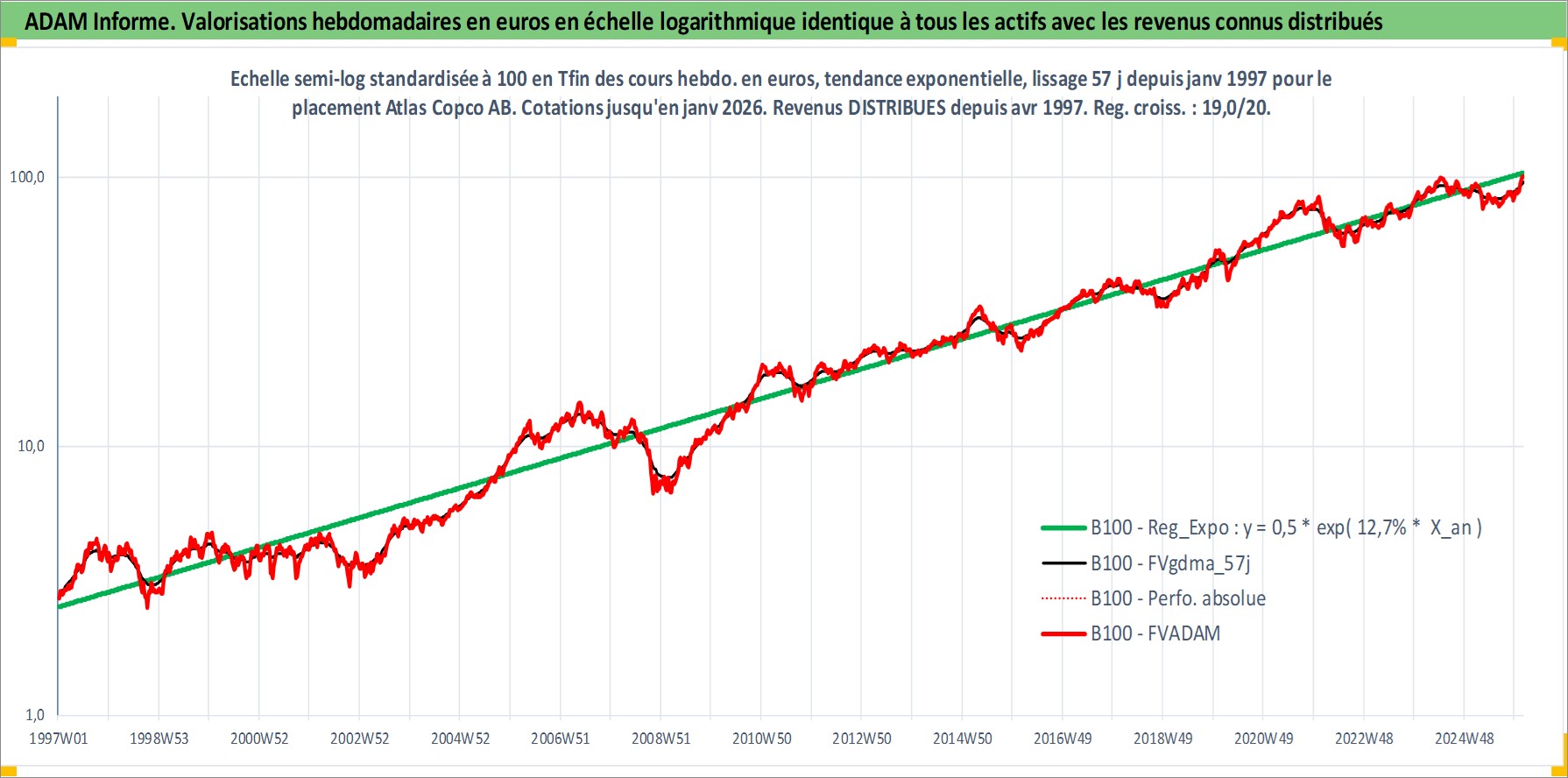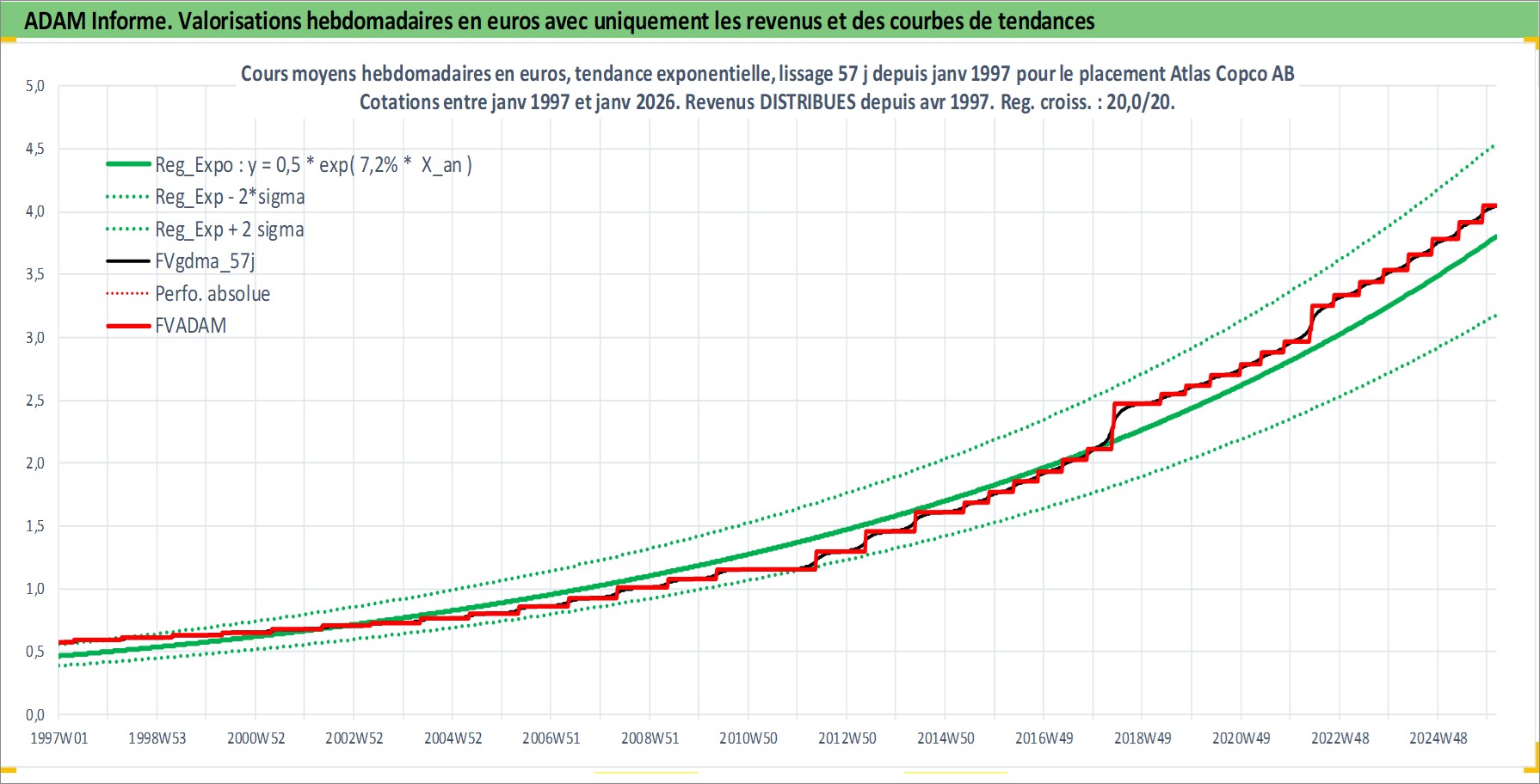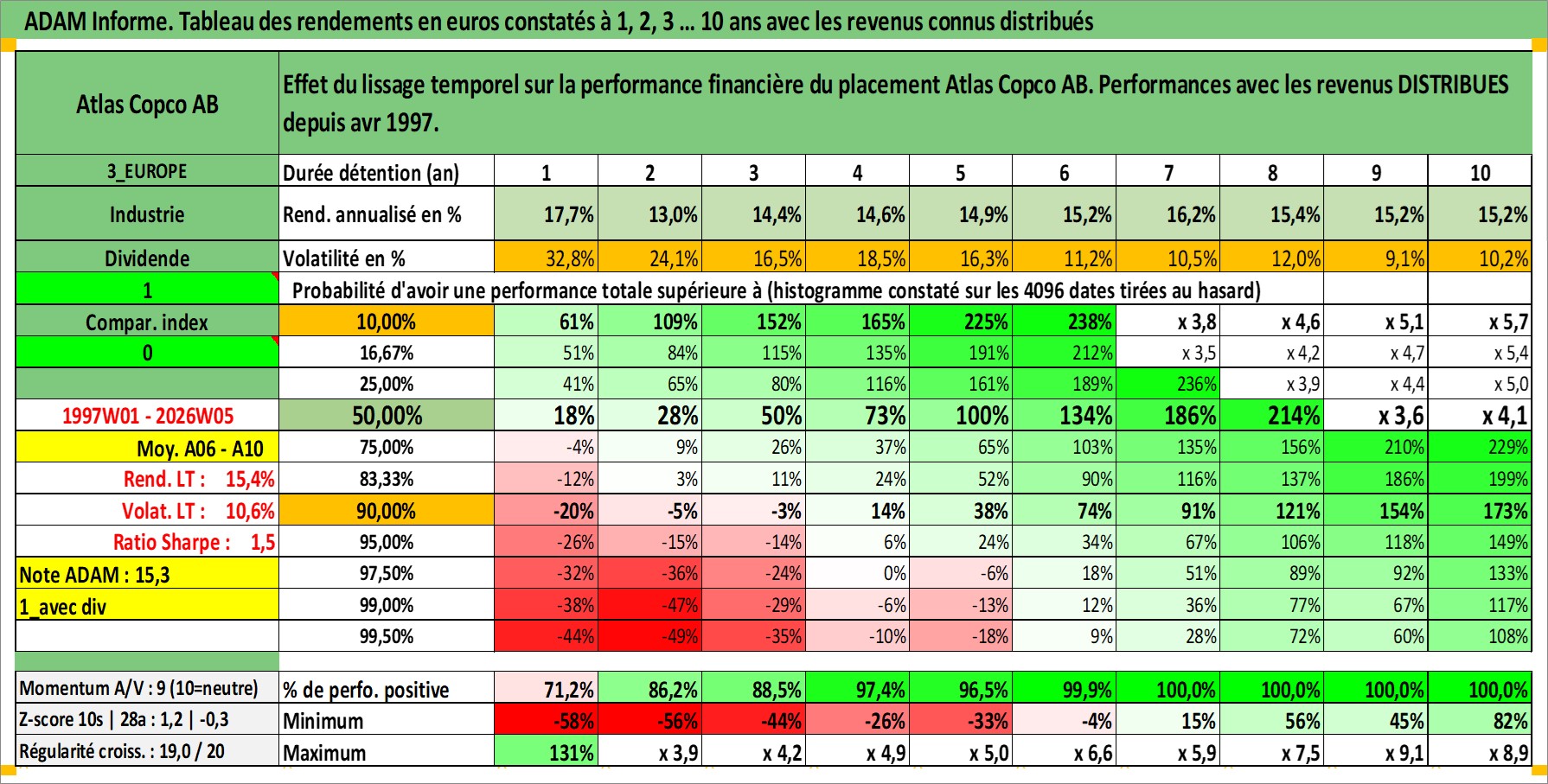 Site dédié aux investisseursPage dédiée sur site financeAnalyse des valorisations hebdomadaires de l'action Atlas Copco AB. Cet actif est cote en SEK. Les valorisations sont en contrevaleur EURO et couvrent les semaines 1997W01 a 2026W05. Les revenus de cet actif financier sont pris en compte depuis la semaine 1997W17. La note globale ESG de cet actif est estimee a 11.0 (apres rebasage entre 0 et 20).