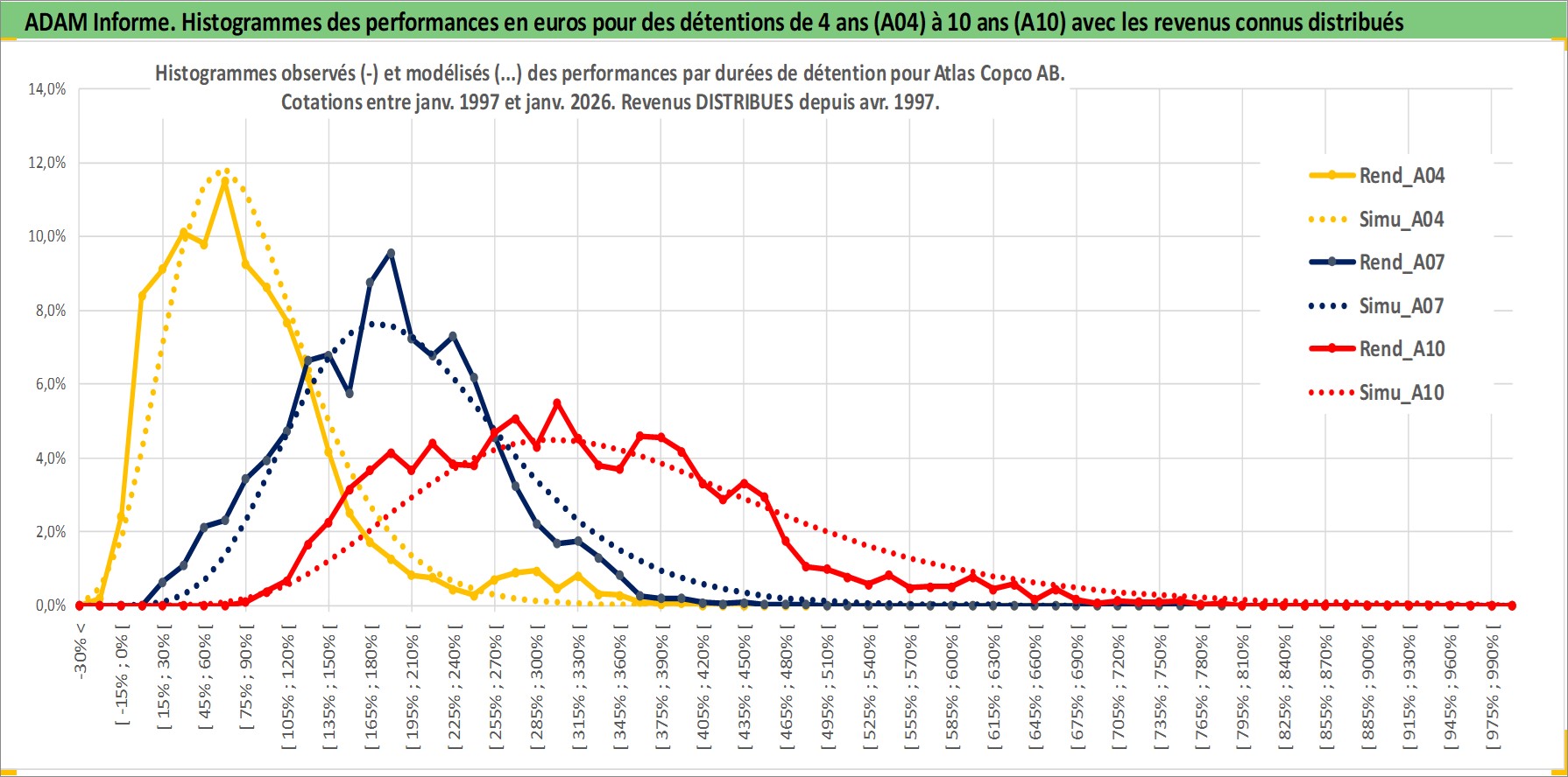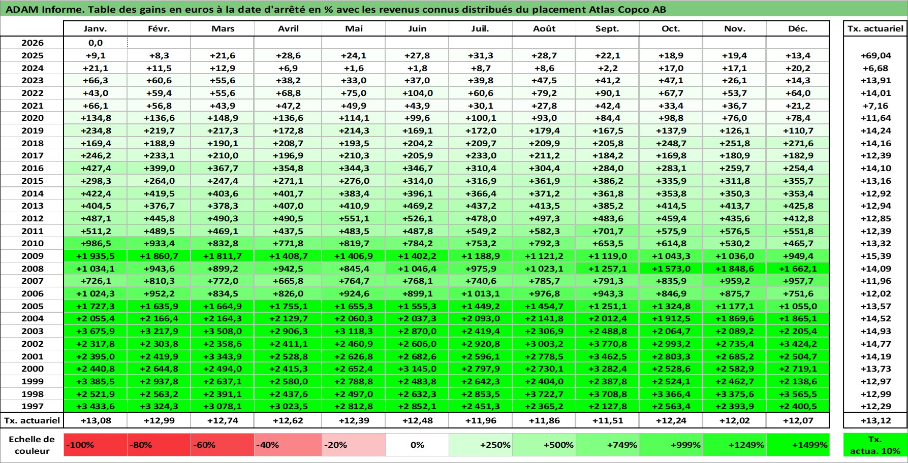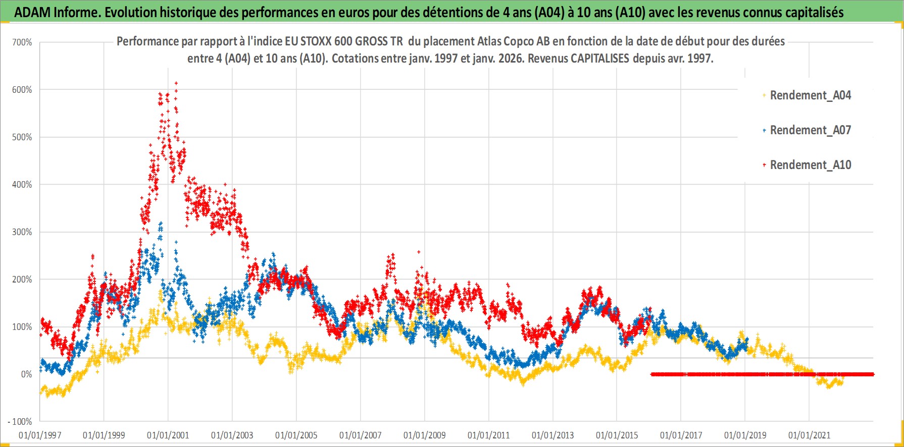 Site dédié aux investisseursPage dédiée sur site financeAnalyse des valorisations hebdomadaires de l'action Atlas Copco AB. Cet actif est cote en SEK. Les valorisations sont en contrevaleur EURO et couvrent les semaines 1997W01 a 2026W05. Les revenus de cet actif financier sont pris en compte depuis la semaine 1997W17. La note globale ESG de cet actif est estimee a 11.0 (apres rebasage entre 0 et 20).