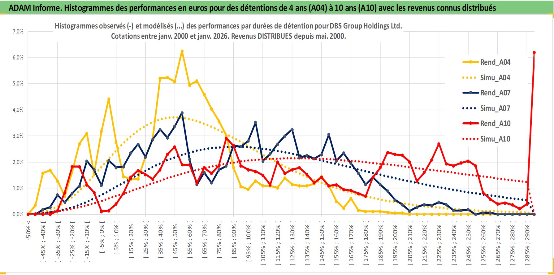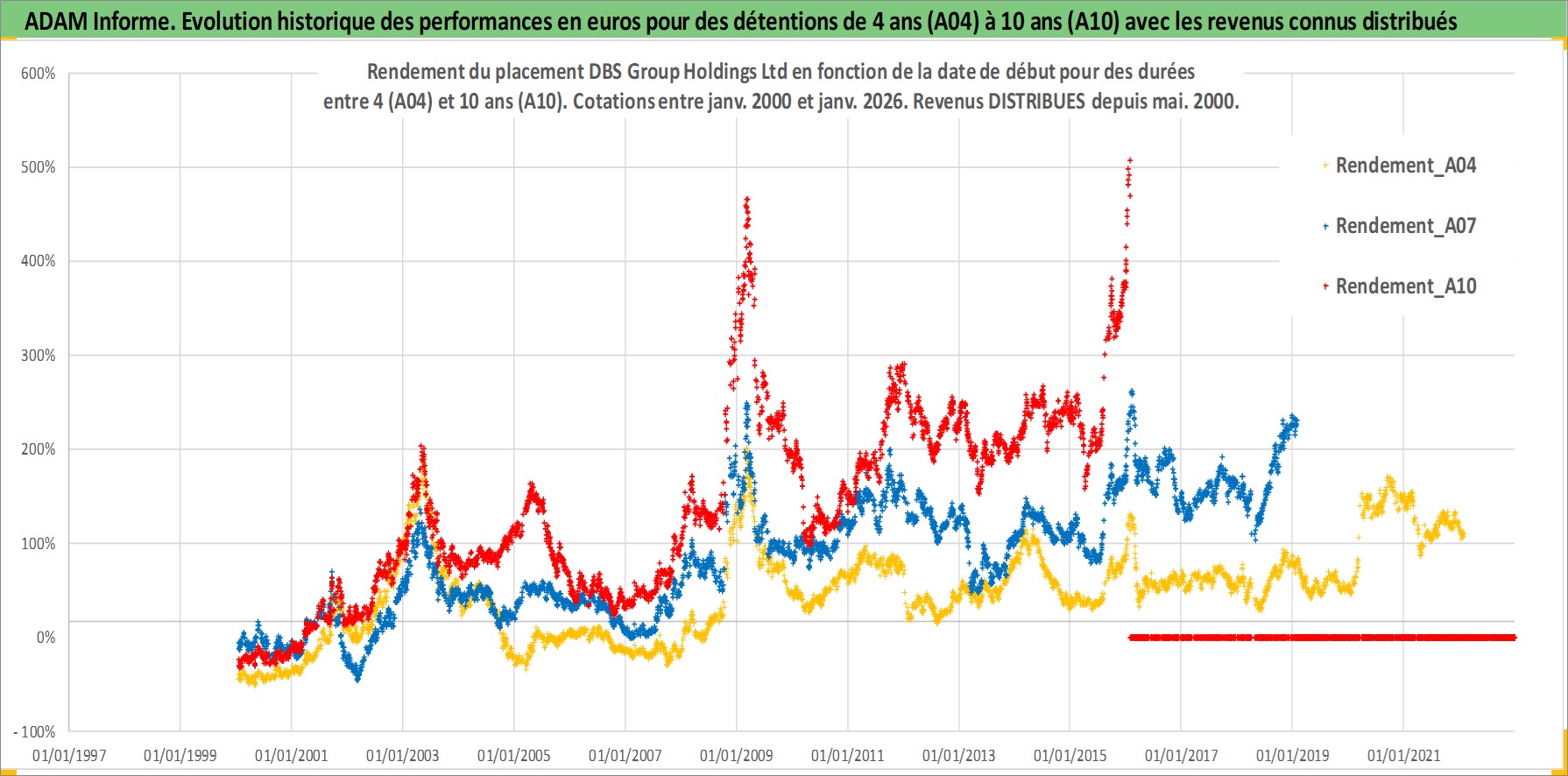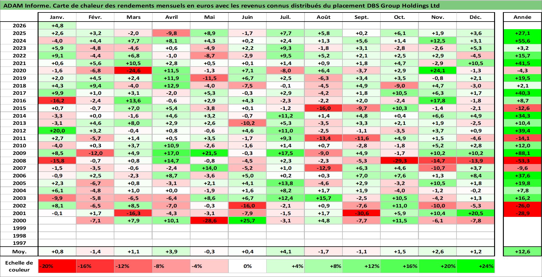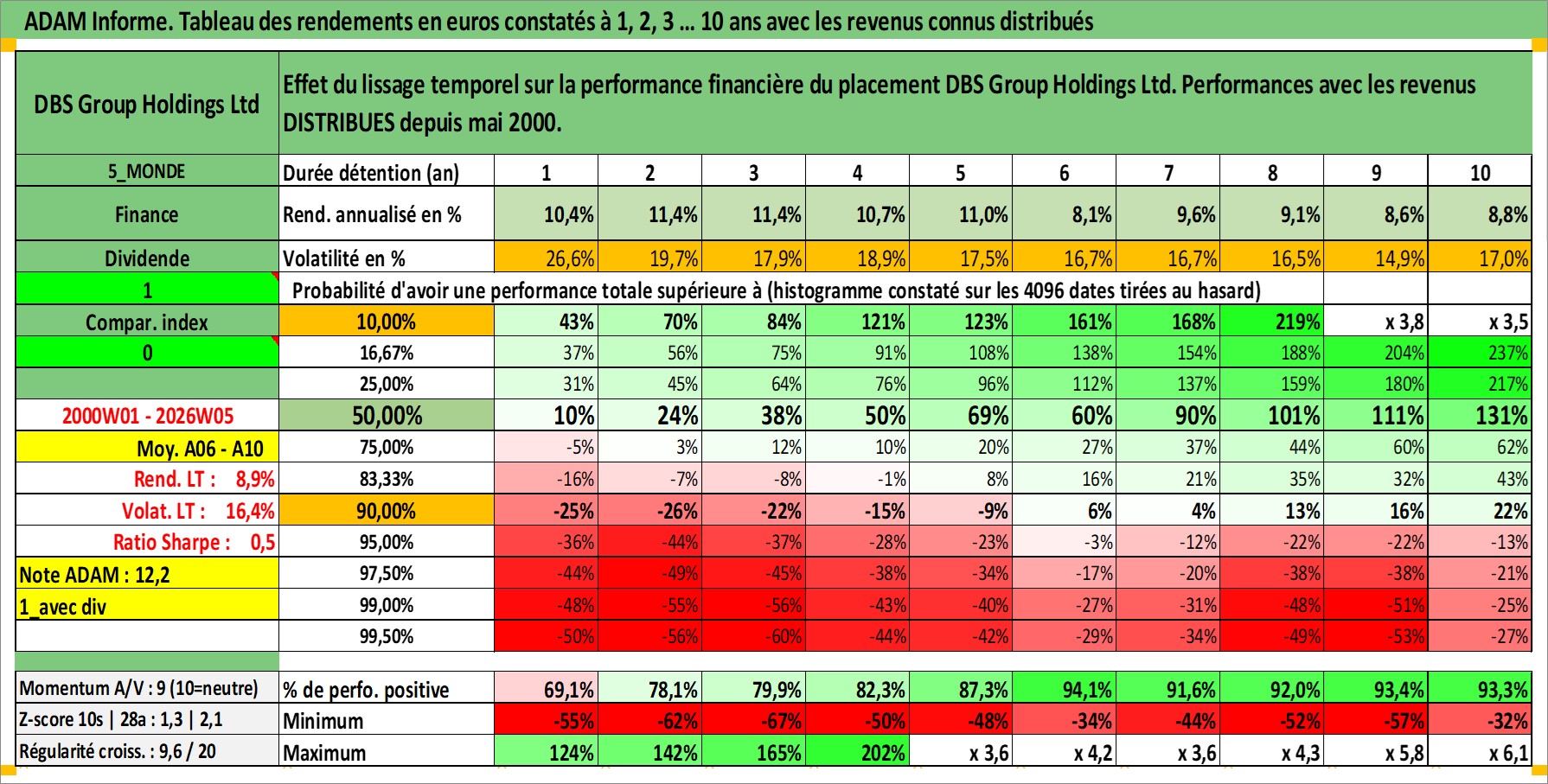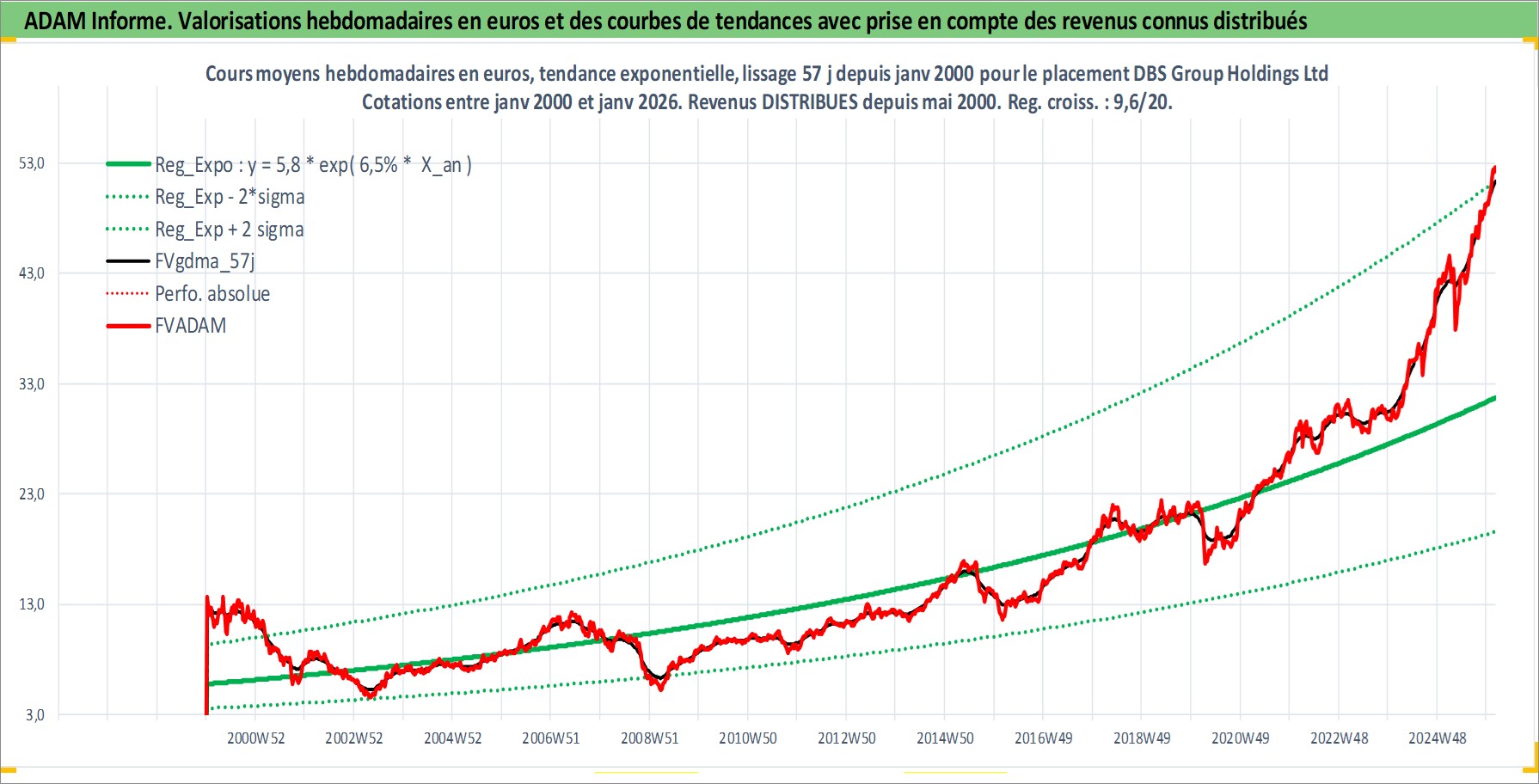Site dédié aux investisseursPage dédiée sur site financeAnalyse des valorisations hebdomadaires de l'action DBS Group Holdings Ltd. Cet actif est cote en SGD. Les valorisations sont en contrevaleur EURO et couvrent les semaines 2000W01 a 2026W05. Les revenus de cet actif financier sont pris en compte depuis la semaine 2000W20. La note globale ESG de cet actif est estimee a 10.0 (apres rebasage entre 0 et 20).