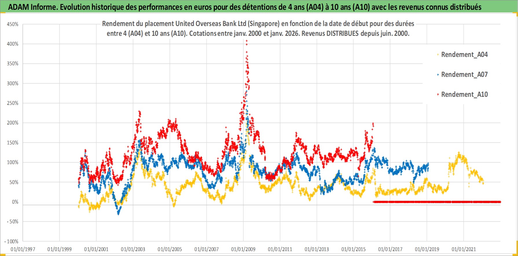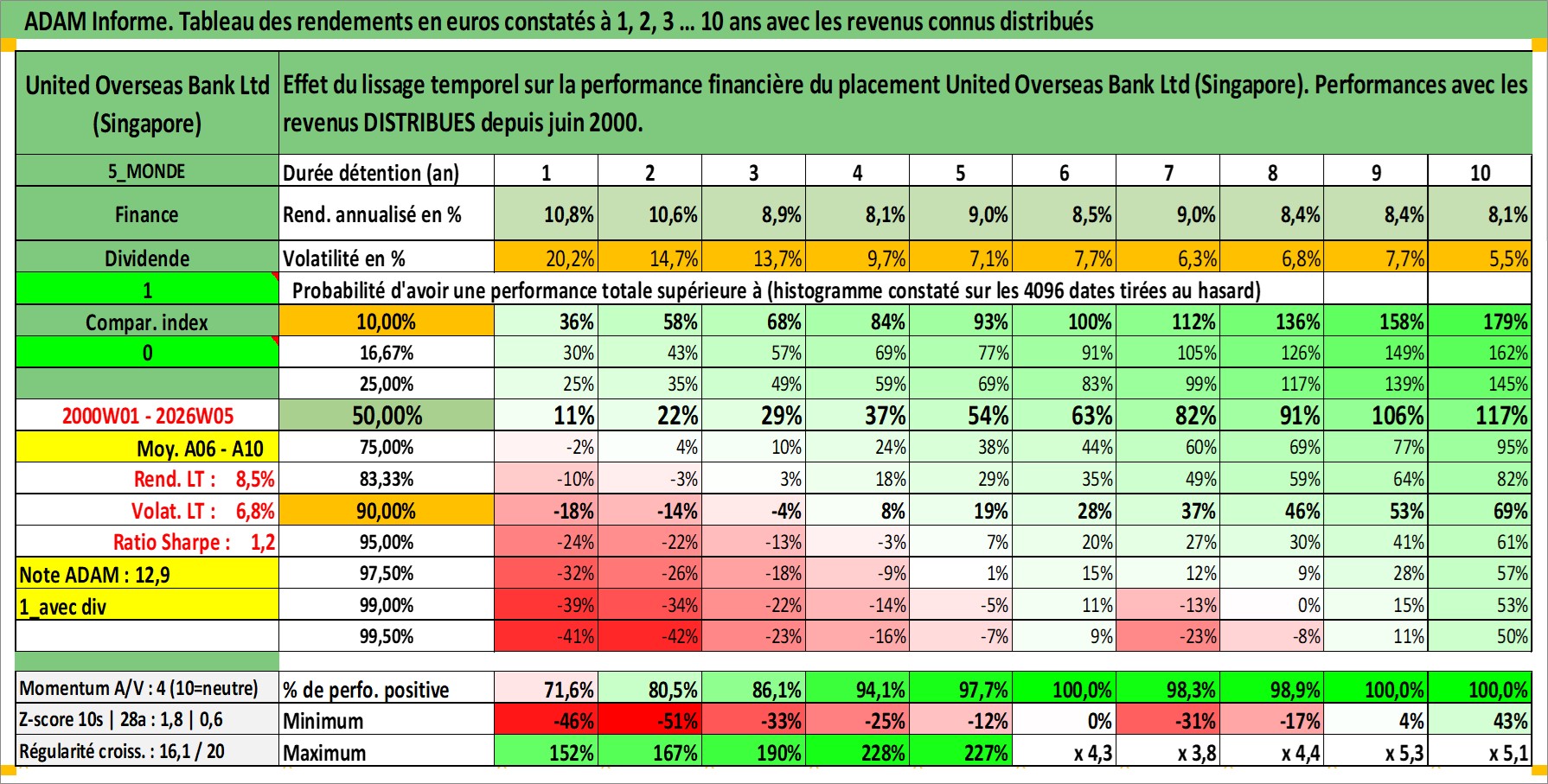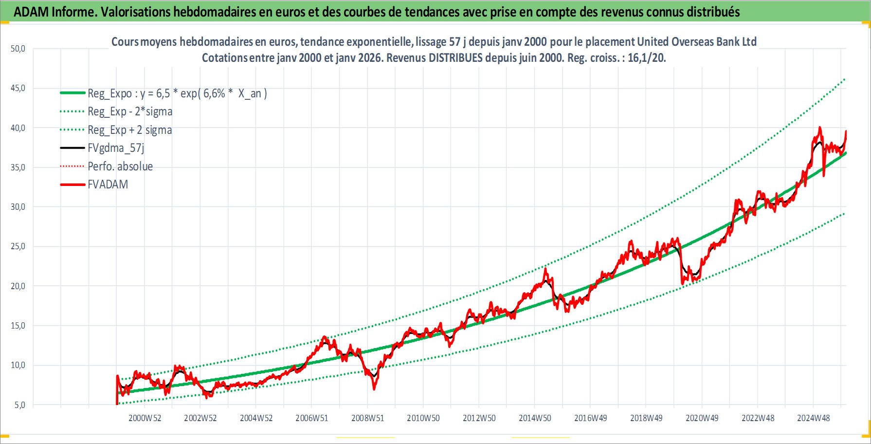 Site dédié aux investisseursPage dédiée sur site financeAnalyse des valorisations hebdomadaires de l'action United Overseas Bank Ltd (Singapore). Cet actif est cote en SGD. Les valorisations sont en contrevaleur EURO et couvrent les semaines 2000W01 a 2026W05. Les revenus de cet actif financier sont pris en compte depuis la semaine 2000W22. La note globale ESG de cet actif est estimee a 10.0 (apres rebasage entre 0 et 20).