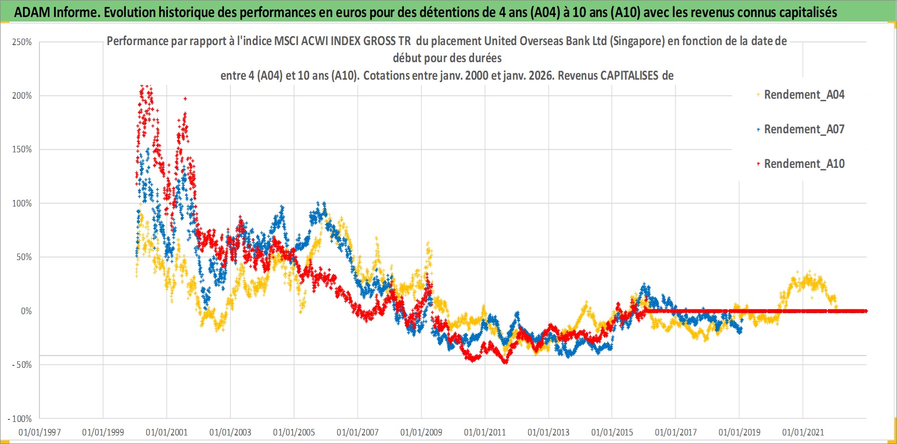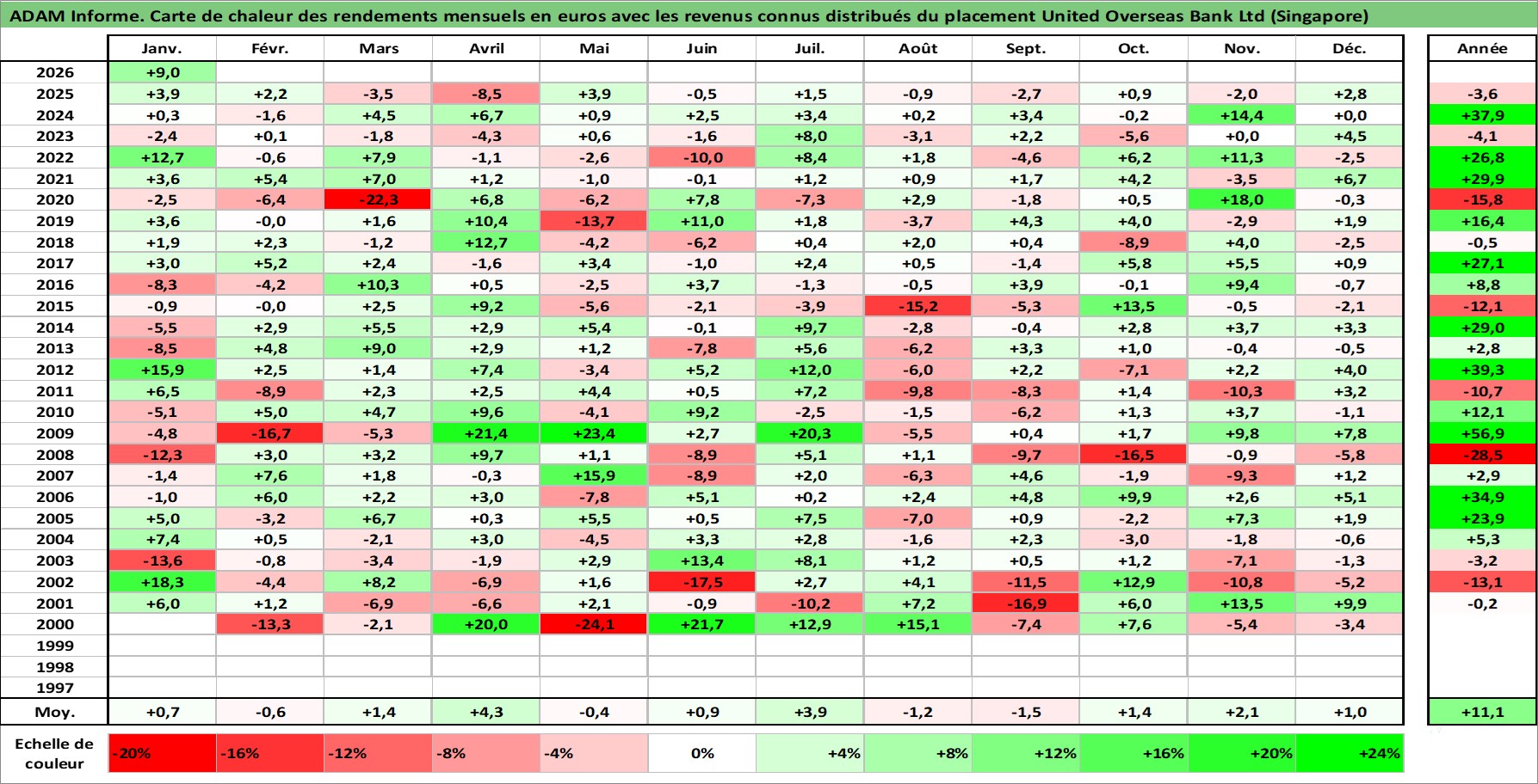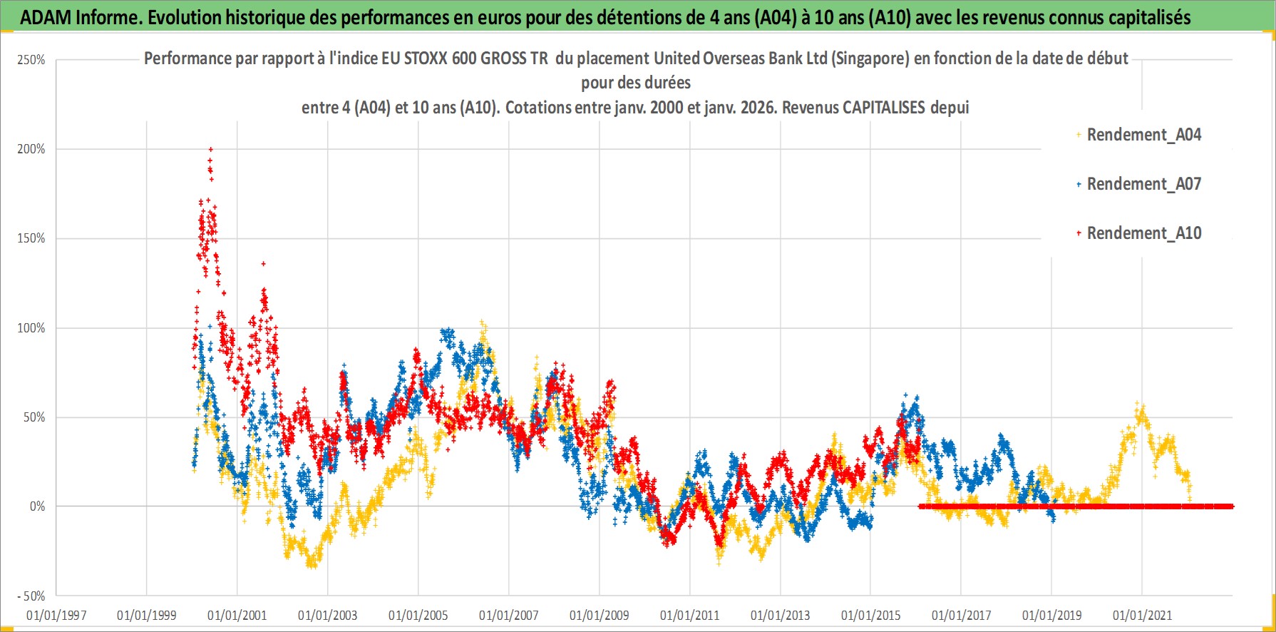 Site dédié aux investisseursPage dédiée sur site financeAnalyse des valorisations hebdomadaires de l'action United Overseas Bank Ltd (Singapore). Cet actif est cote en SGD. Les valorisations sont en contrevaleur EURO et couvrent les semaines 2000W01 a 2026W05. Les revenus de cet actif financier sont pris en compte depuis la semaine 2000W22. La note globale ESG de cet actif est estimee a 10.0 (apres rebasage entre 0 et 20).