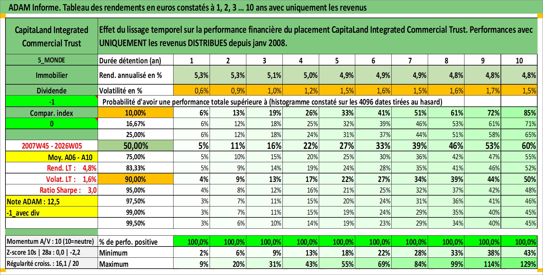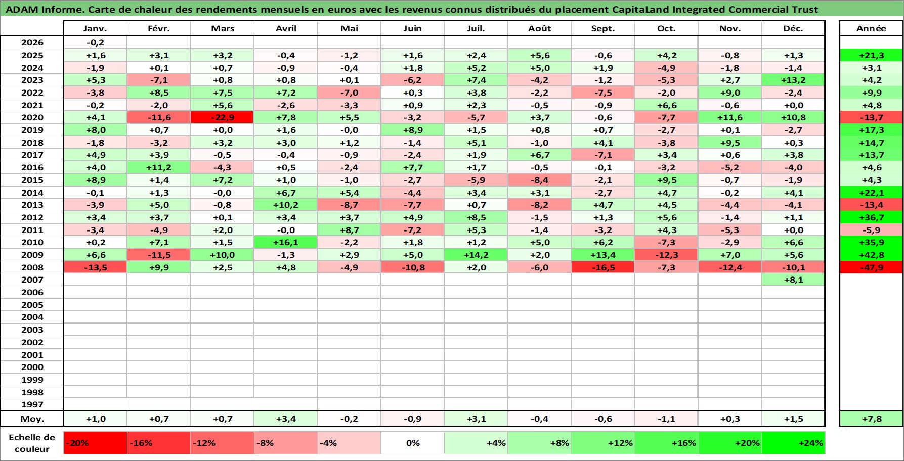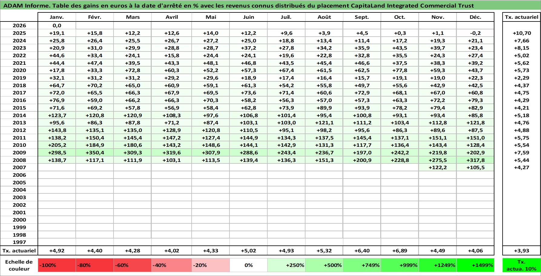 Site dédié aux investisseursPage dédiée sur site financeAnalyse des valorisations hebdomadaires de l'action CapitaLand Integrated Commercial Trust. Cet actif est cote en SGD. Les valorisations sont en contrevaleur EURO et couvrent les semaines 2007W45 a 2026W05. Les revenus de cet actif financier sont pris en compte depuis la semaine 2008W05. La note ESG de cet actif n'est pas connue.