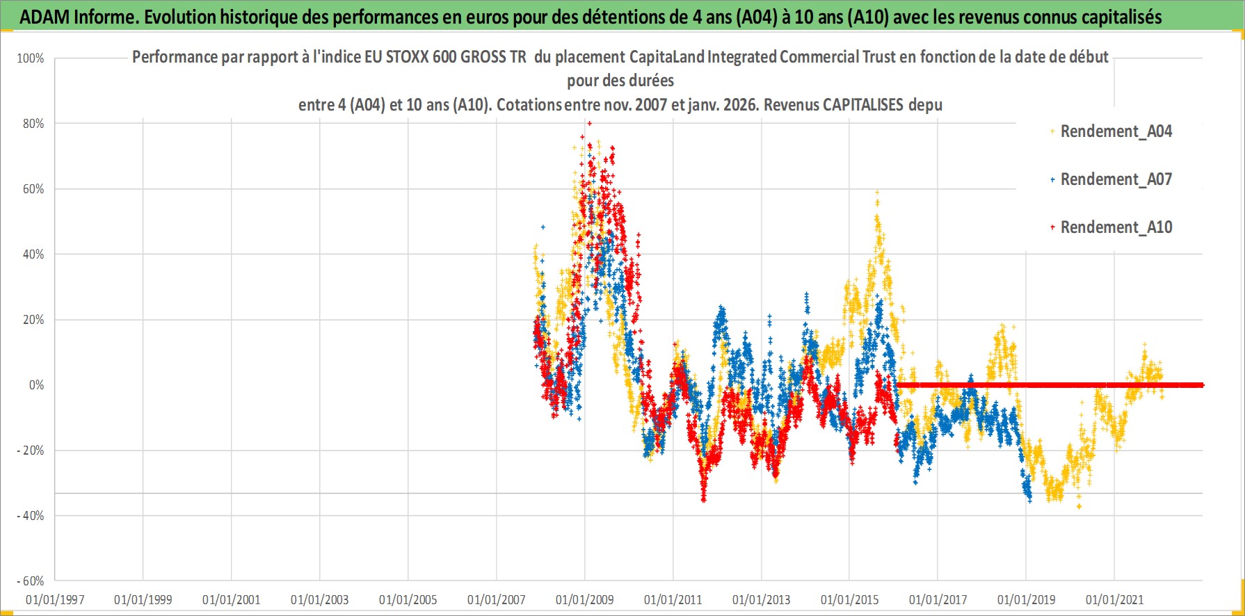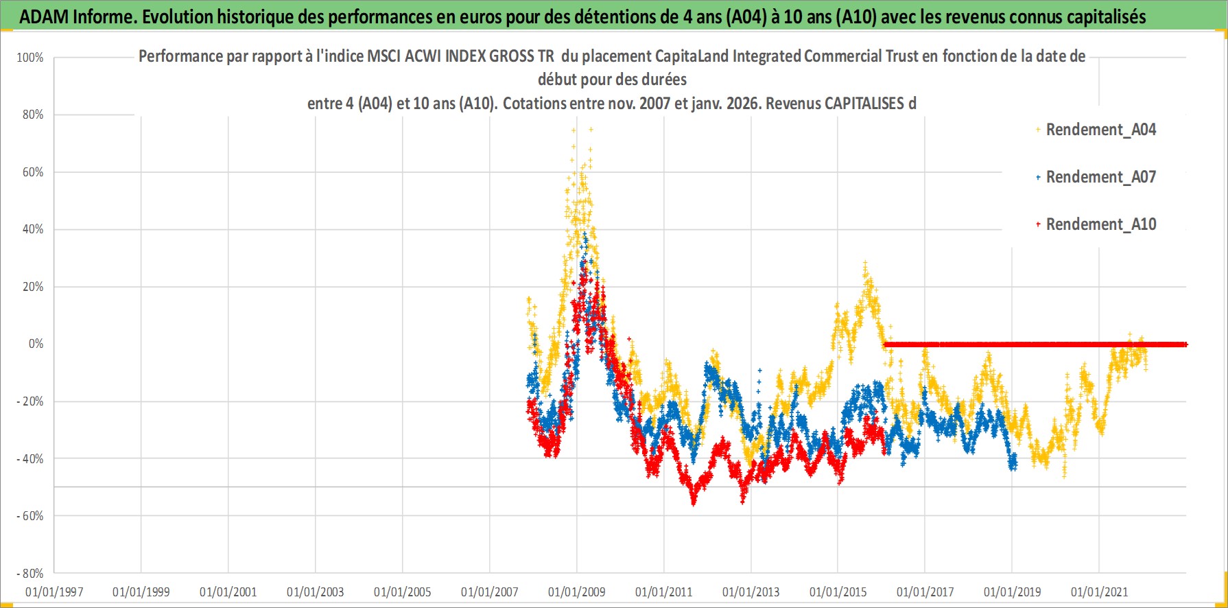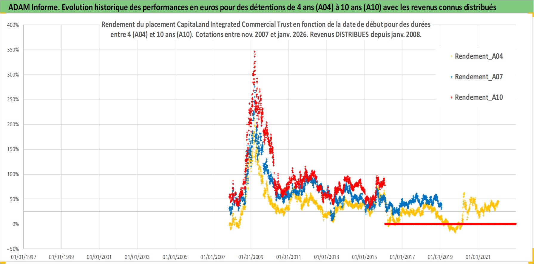 Site dédié aux investisseursPage dédiée sur site financeAnalyse des valorisations hebdomadaires de l'action CapitaLand Integrated Commercial Trust. Cet actif est cote en SGD. Les valorisations sont en contrevaleur EURO et couvrent les semaines 2007W45 a 2026W05. Les revenus de cet actif financier sont pris en compte depuis la semaine 2008W05. La note ESG de cet actif n'est pas connue.