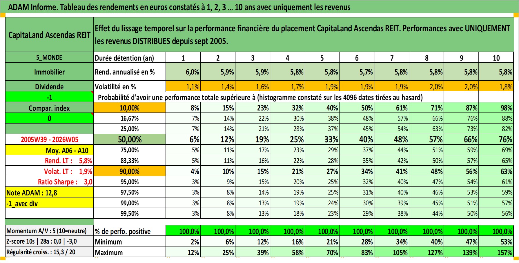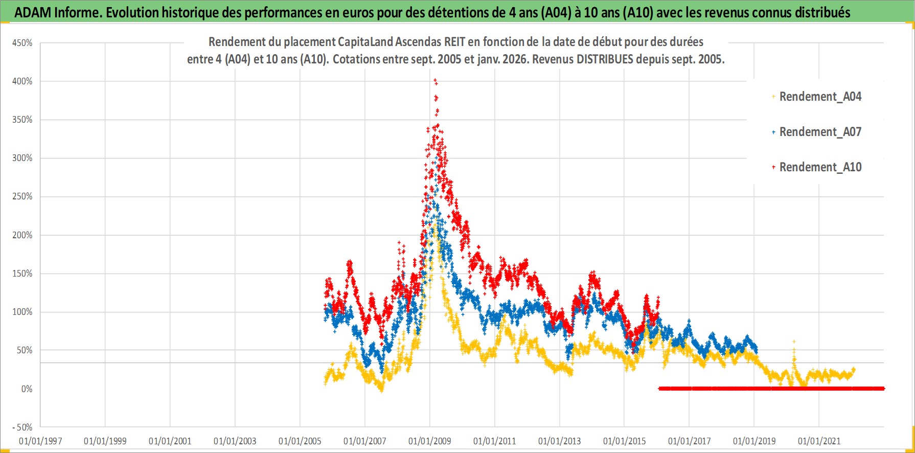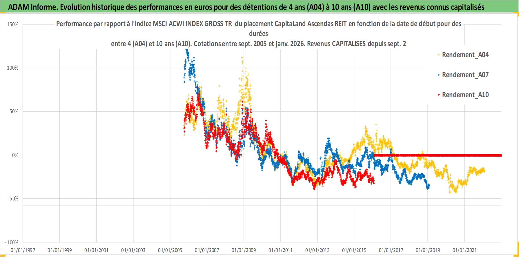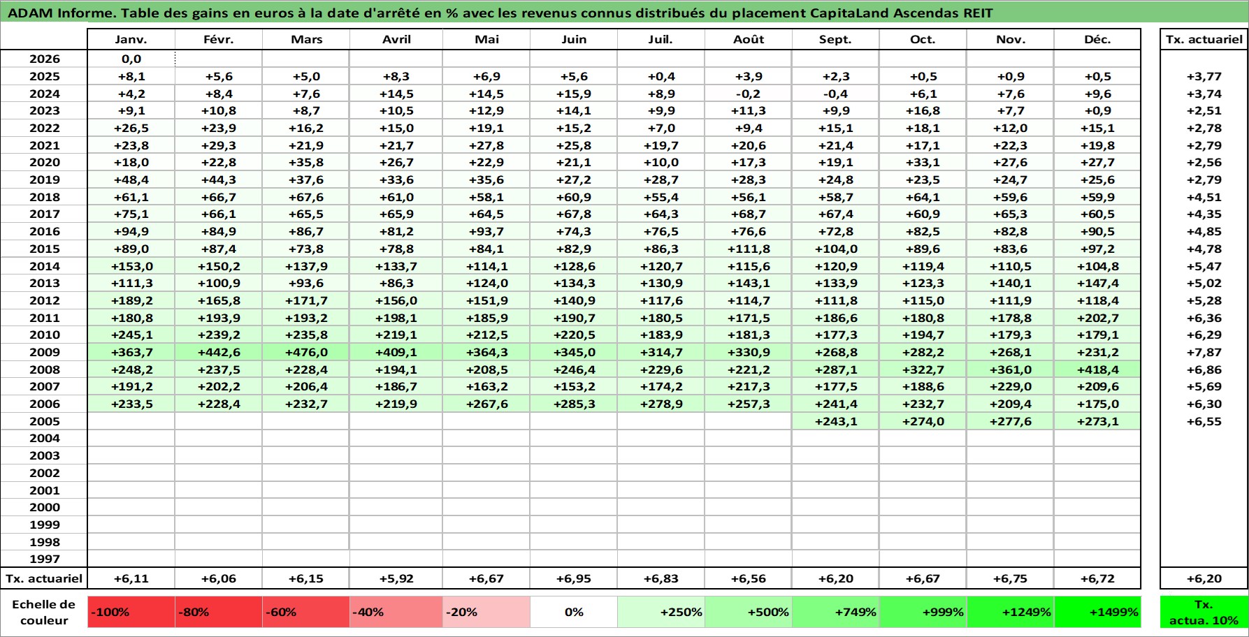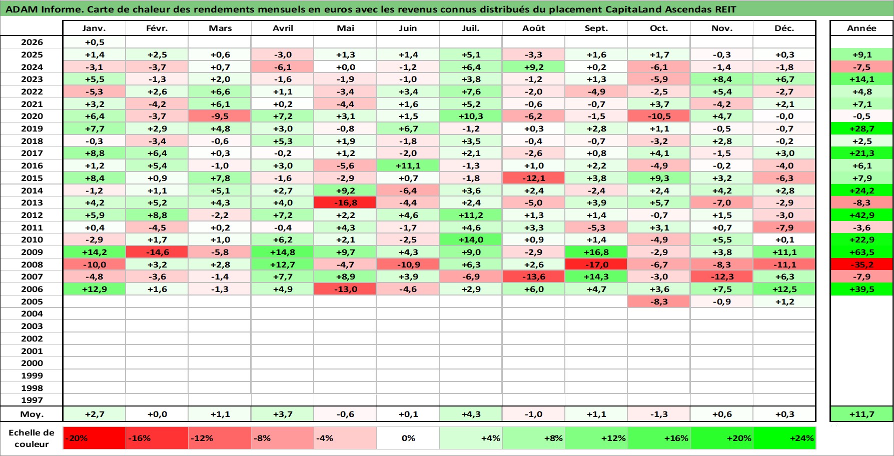 Site dédié aux investisseursPage dédiée sur site financeAnalyse des valorisations hebdomadaires de l'action CapitaLand Ascendas REIT. Cet actif est cote en SGD. Les valorisations sont en contrevaleur EURO et couvrent les semaines 2005W39 a 2026W05. Les revenus de cet actif financier sont pris en compte depuis la semaine 2005W39. La note ESG de cet actif n'est pas connue.