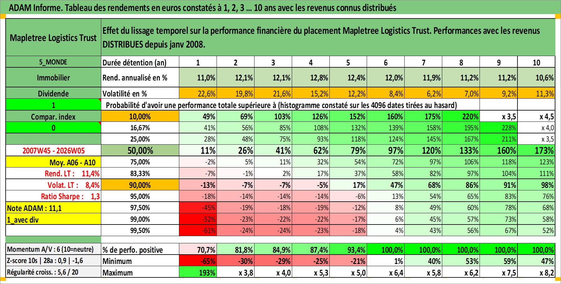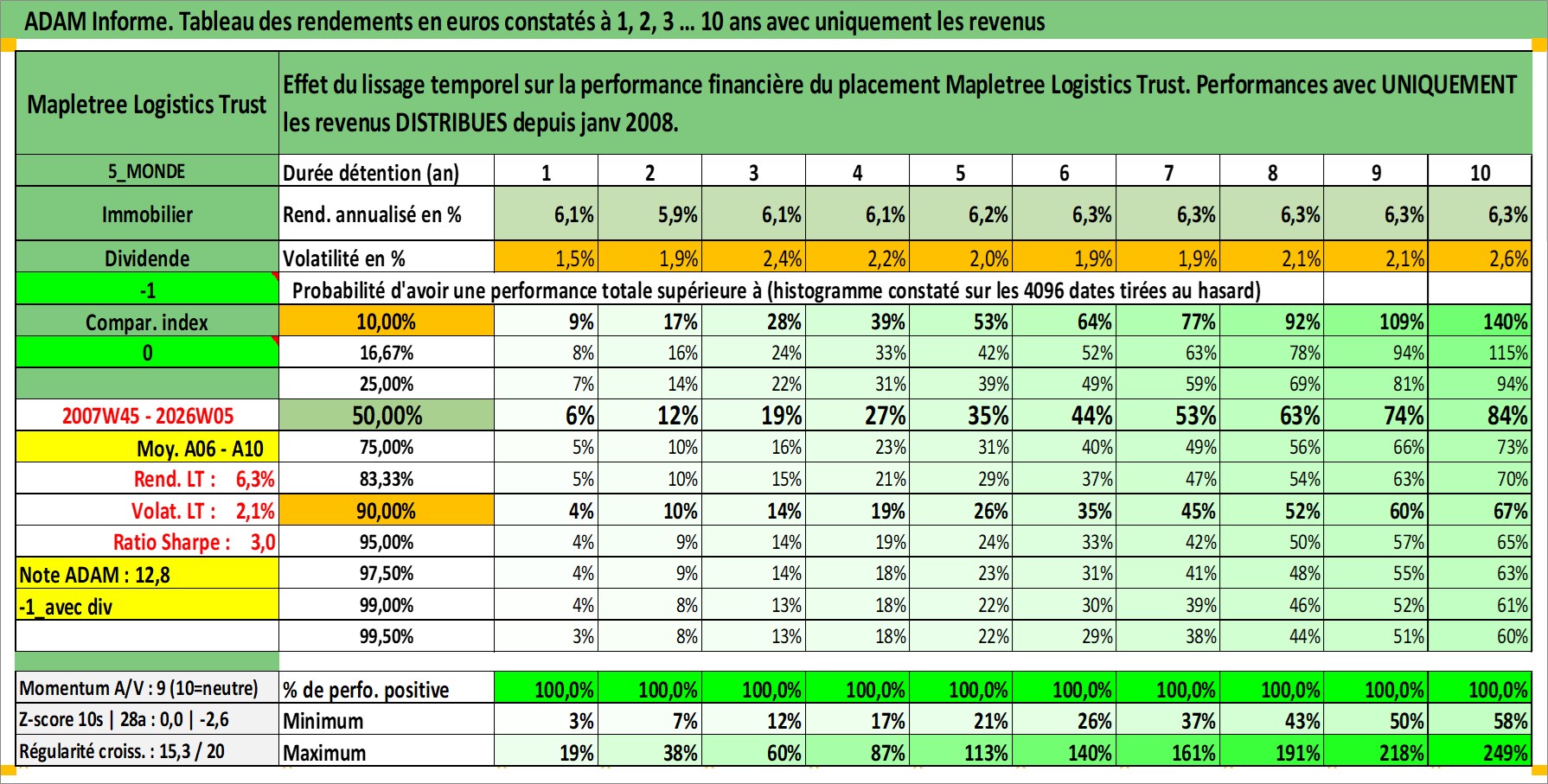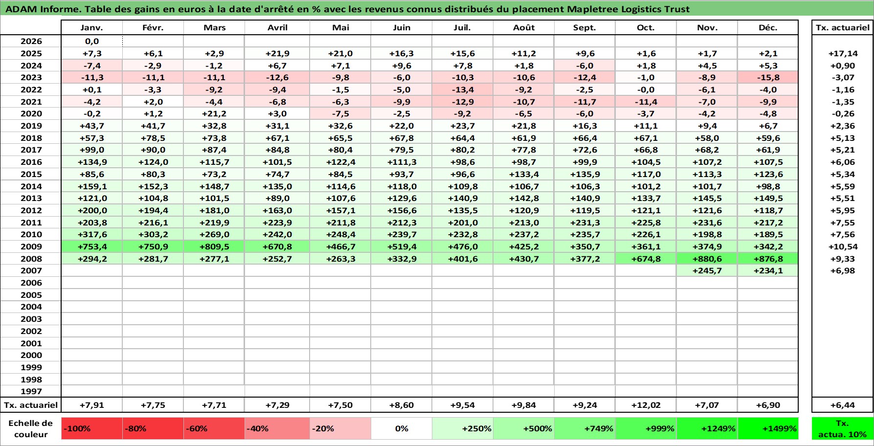 Site dédié aux investisseursPage dédiée sur site financeAnalyse des valorisations hebdomadaires de l'action Mapletree Logistics Trust. Cet actif est cote en SGD. Les valorisations sont en contrevaleur EURO et couvrent les semaines 2007W45 a 2026W05. Les revenus de cet actif financier sont pris en compte depuis la semaine 2008W05. La note ESG de cet actif n'est pas connue.