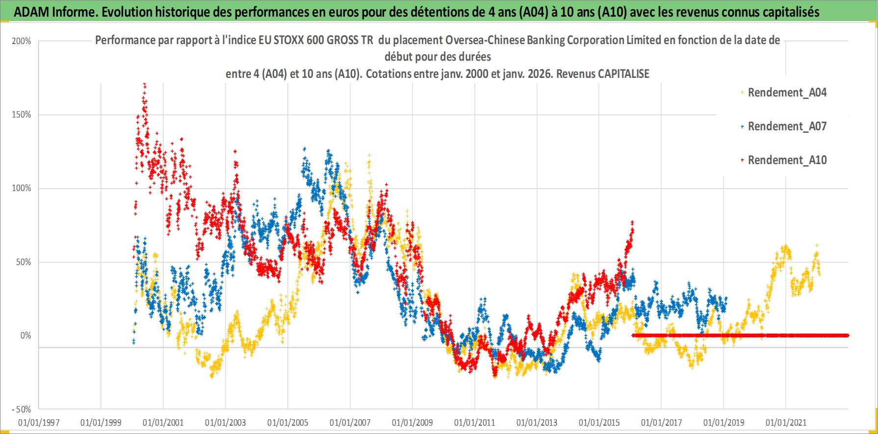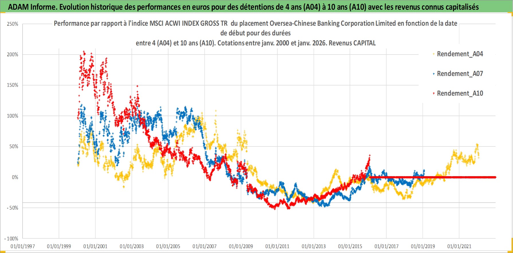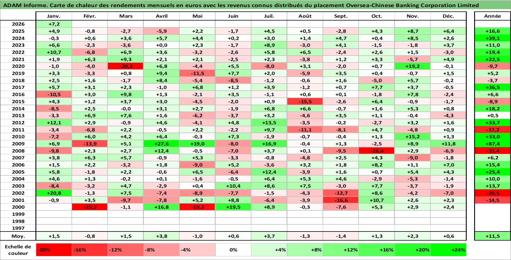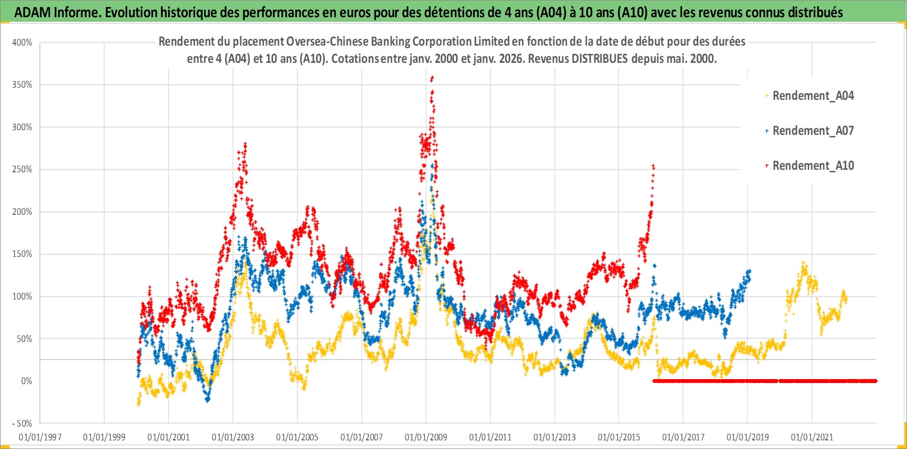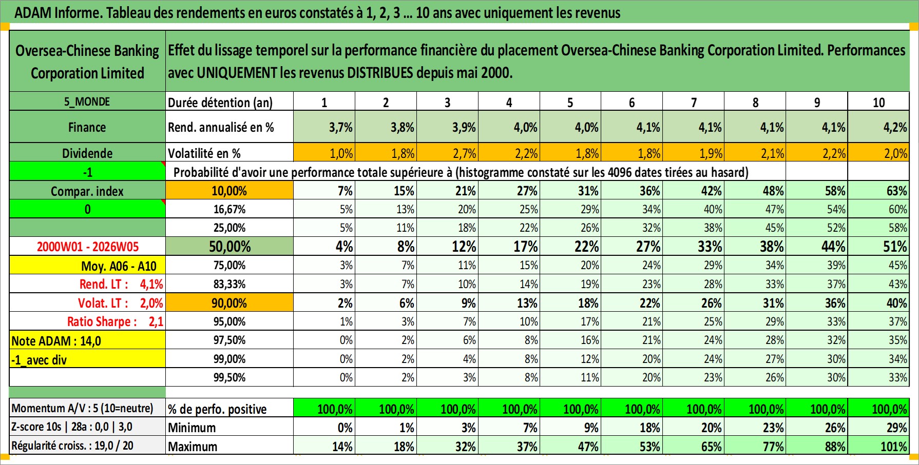 Site dédié aux investisseursPage dédiée sur site financeAnalyse des valorisations hebdomadaires de l'action Oversea-Chinese Banking Corporation Limited. Cet actif est cote en SGD. Les valorisations sont en contrevaleur EURO et couvrent les semaines 2000W01 a 2026W05. Les revenus de cet actif financier sont pris en compte depuis la semaine 2000W18. La note globale ESG de cet actif est estimee a 4.0 (apres rebasage entre 0 et 20).