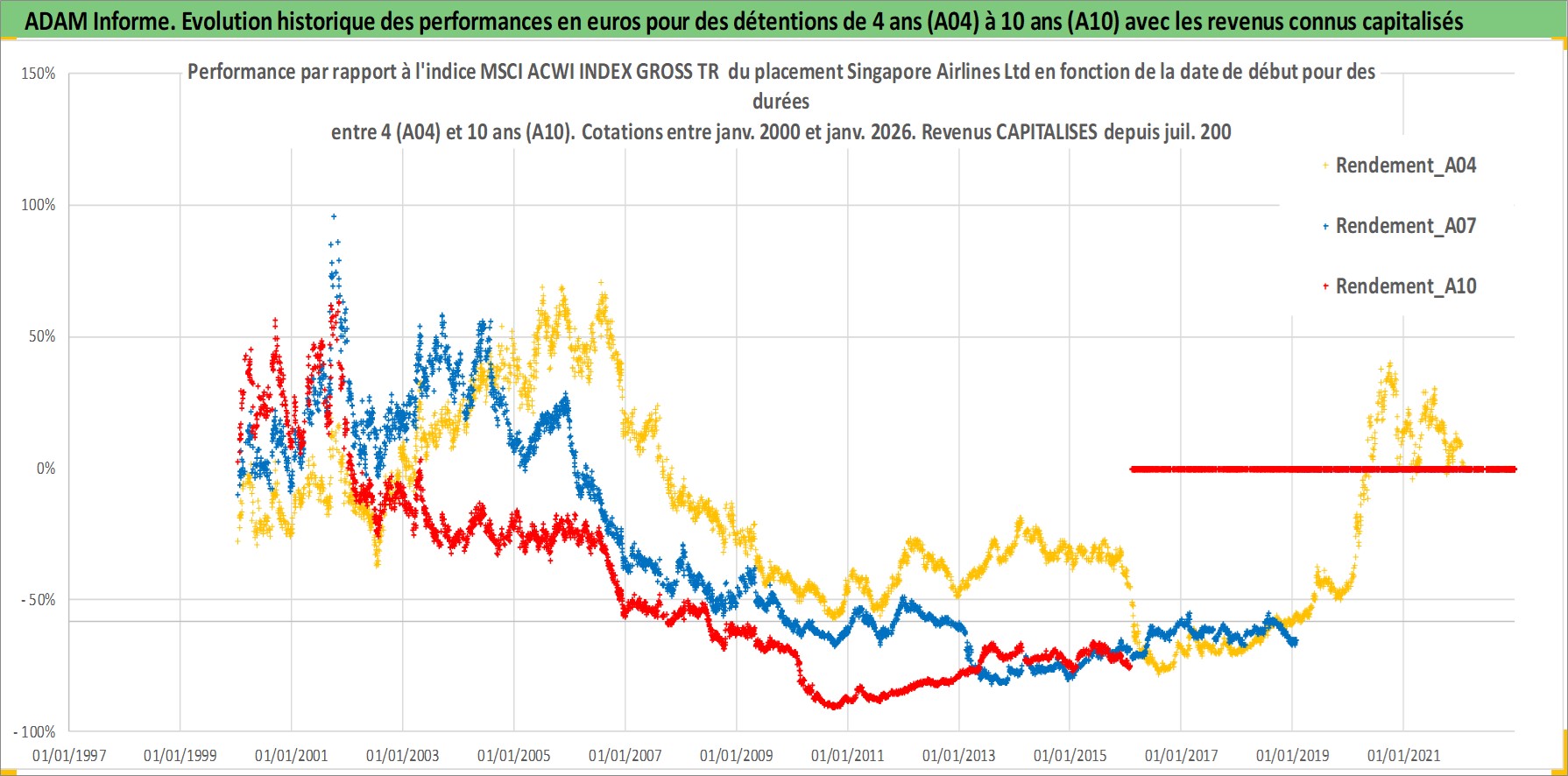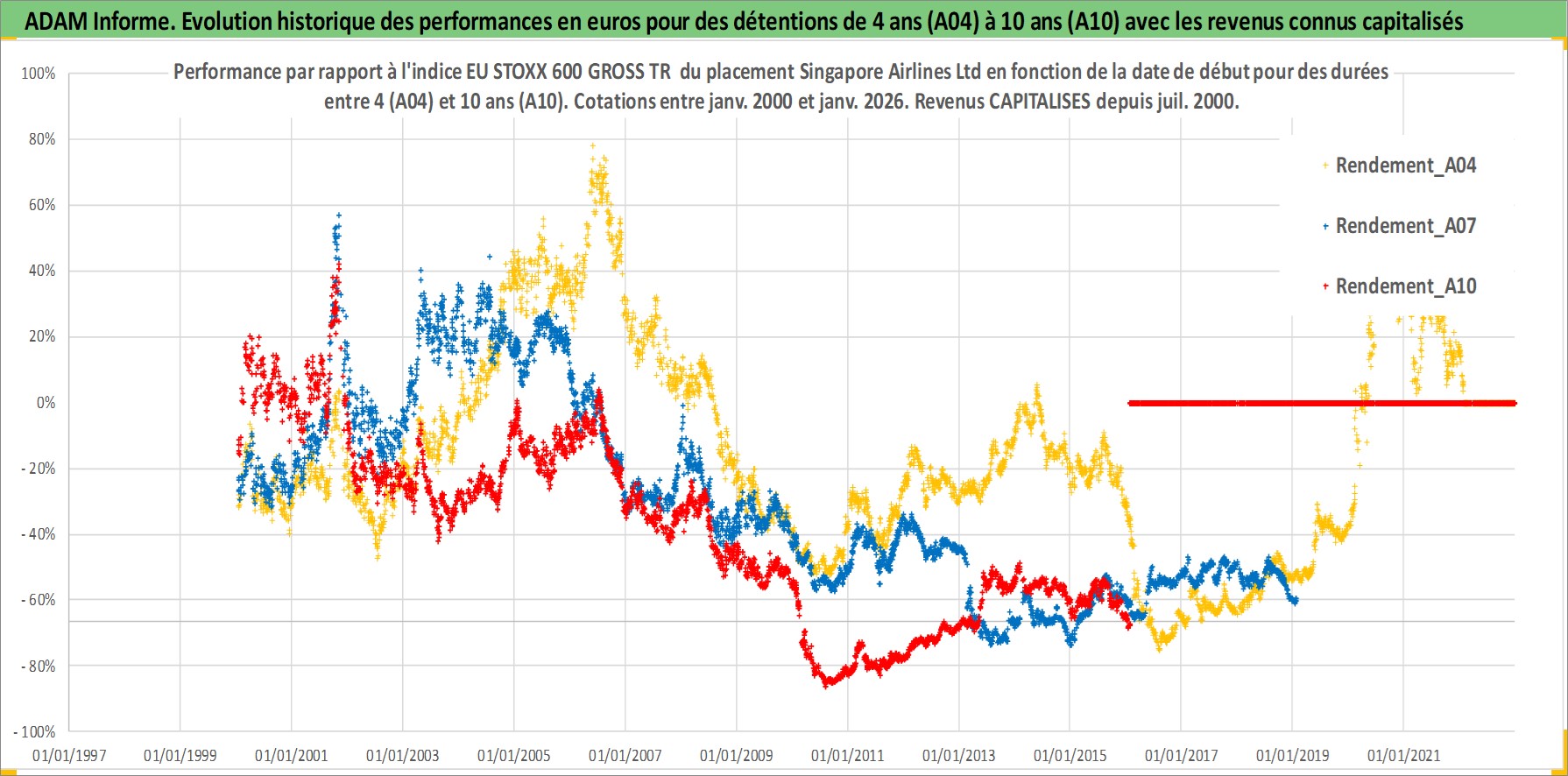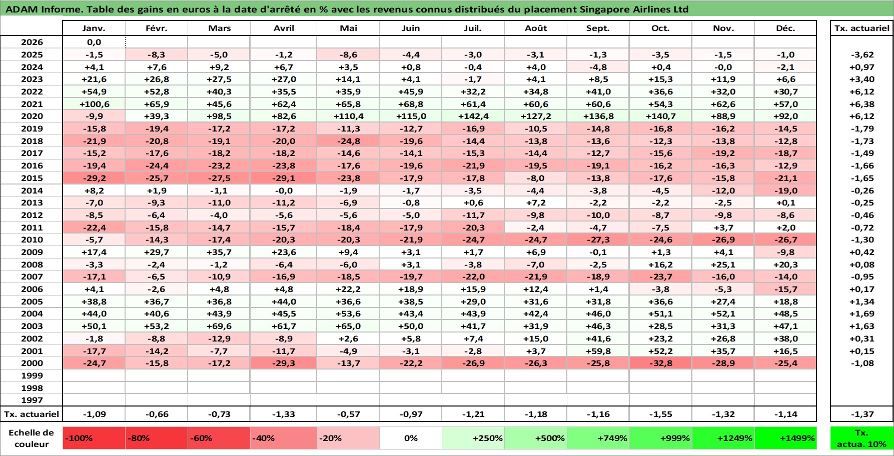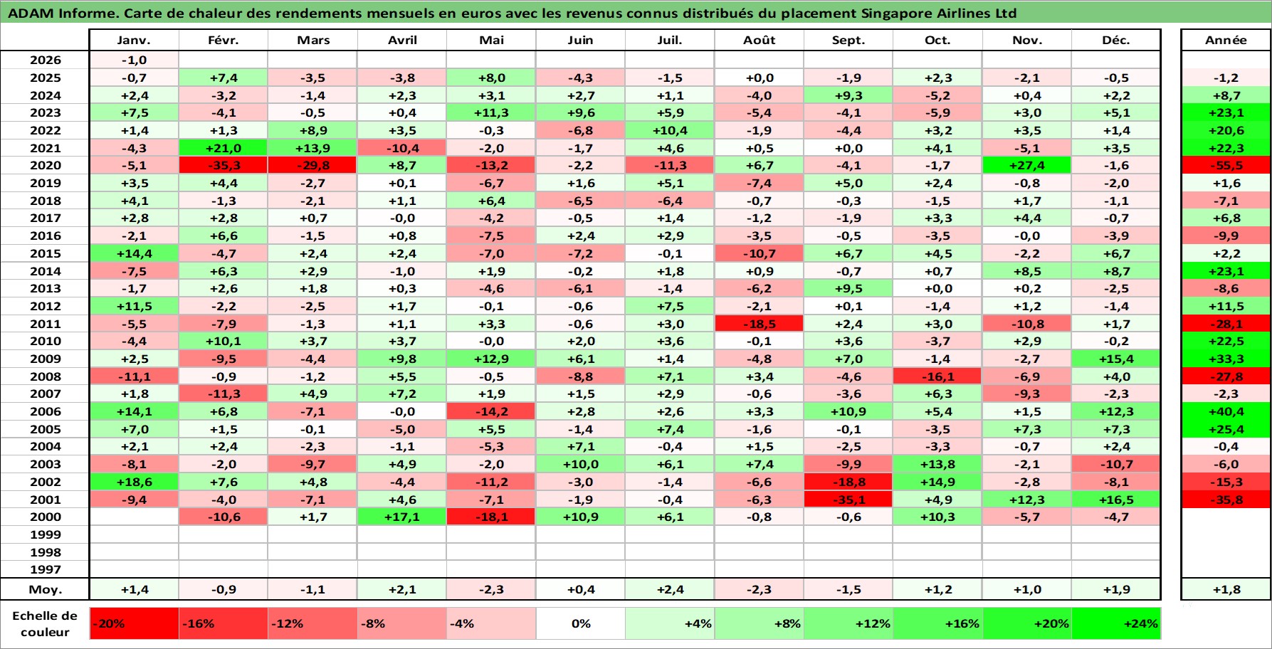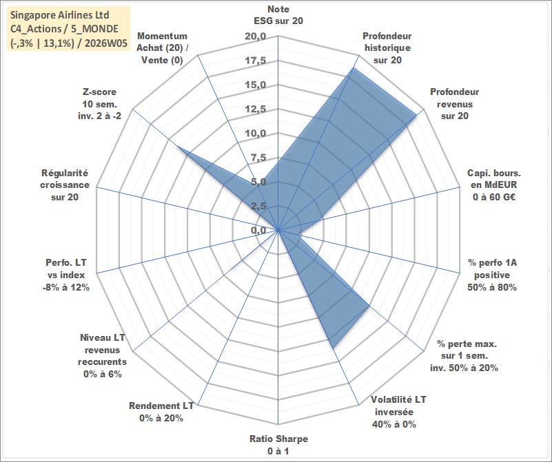 Site dédié aux investisseursPage dédiée sur site financeAnalyse des valorisations hebdomadaires de l'action Singapore Airlines Ltd. Cet actif est cote en SGD. Les valorisations sont en contrevaleur EURO et couvrent les semaines 2000W01 a 2026W05. Les revenus de cet actif financier sont pris en compte depuis la semaine 2000W29. La note globale ESG de cet actif est estimee a 7.0 (apres rebasage entre 0 et 20).