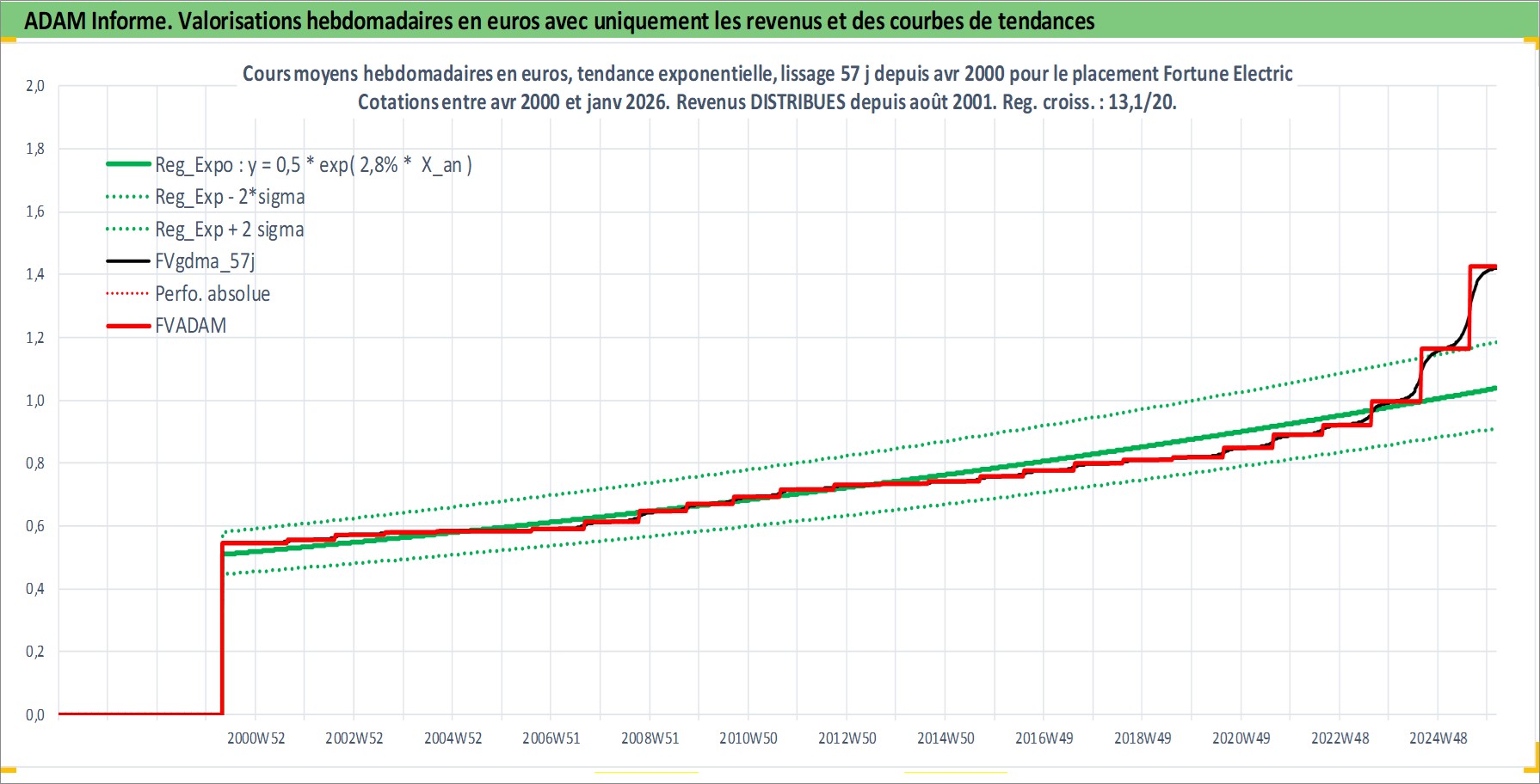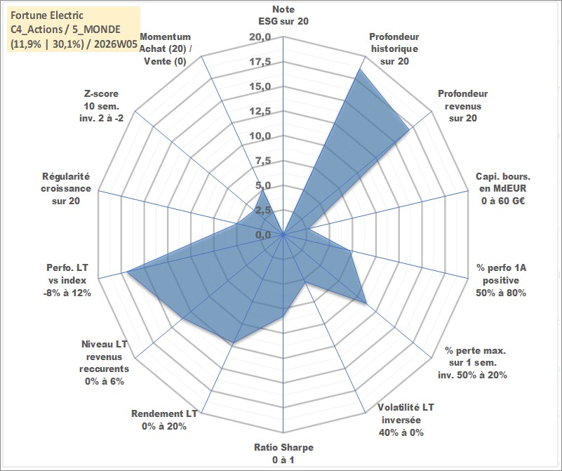 Site dédié aux investisseursPage dédiée sur site financeAnalyse des valorisations hebdomadaires de l'action Fortune Electric . Cet actif est cote en TWD. Les valorisations sont en contrevaleur EURO et couvrent les semaines 2000W17 a 2026W05. Les revenus de cet actif financier sont pris en compte depuis la semaine 2001W34. La note ESG de cet actif n'est pas connue.