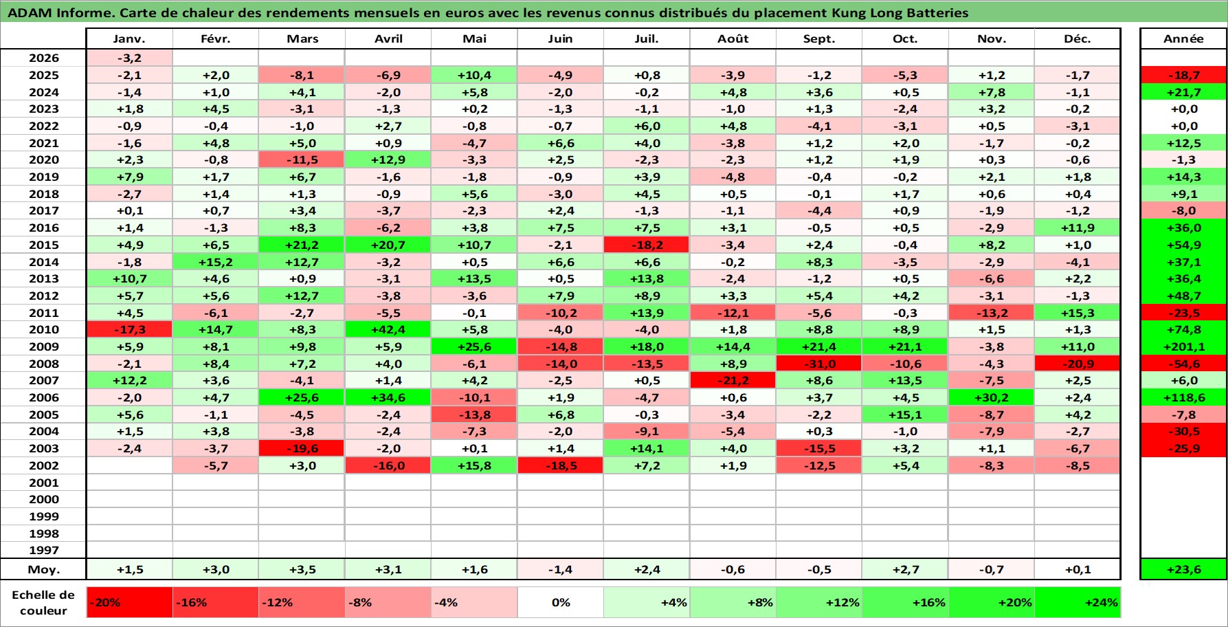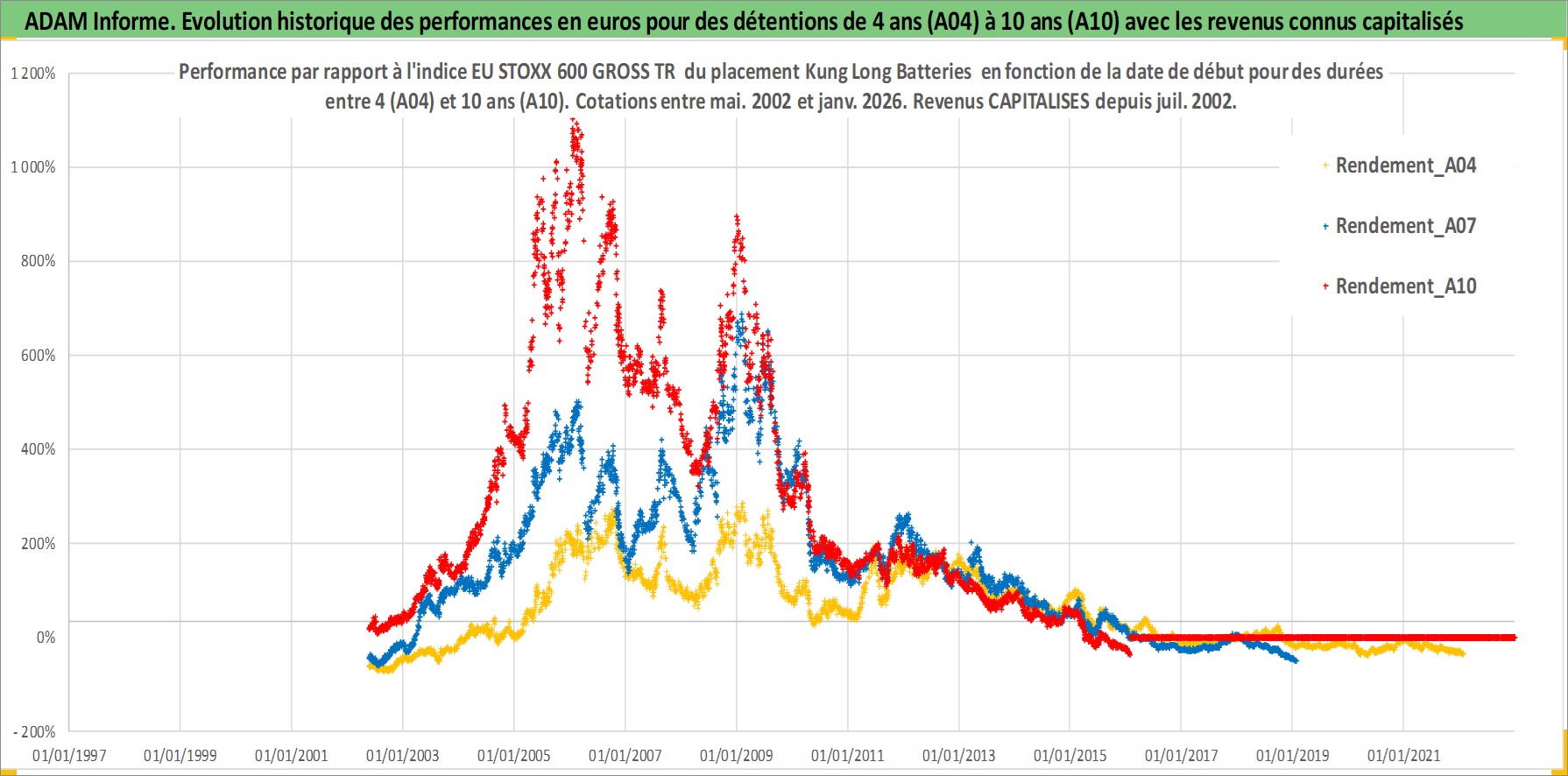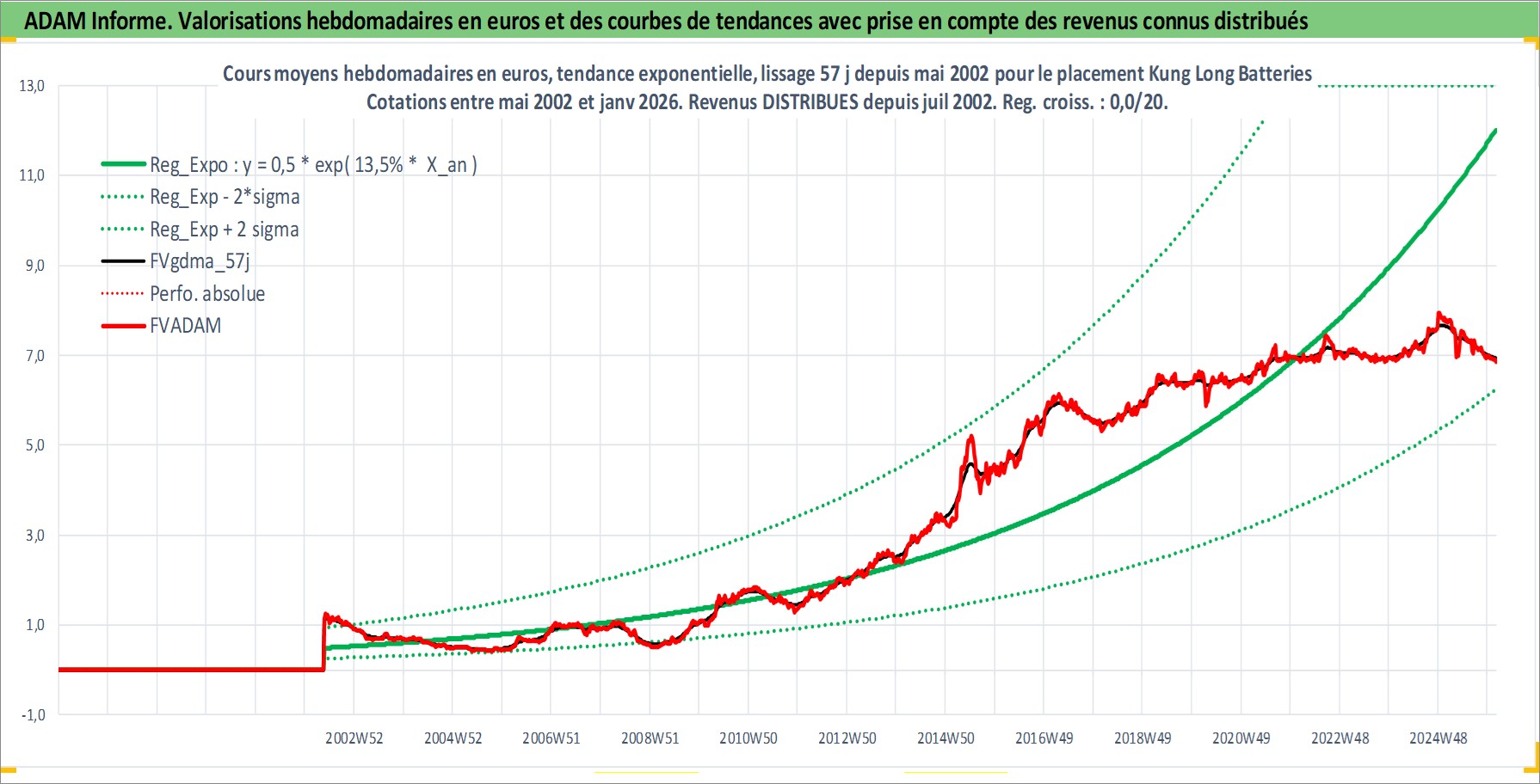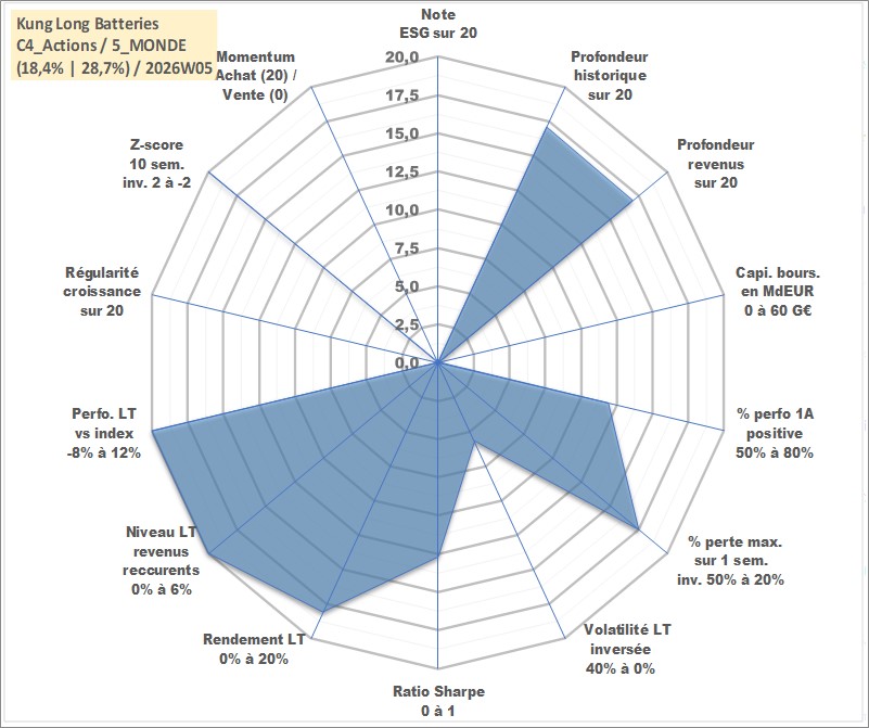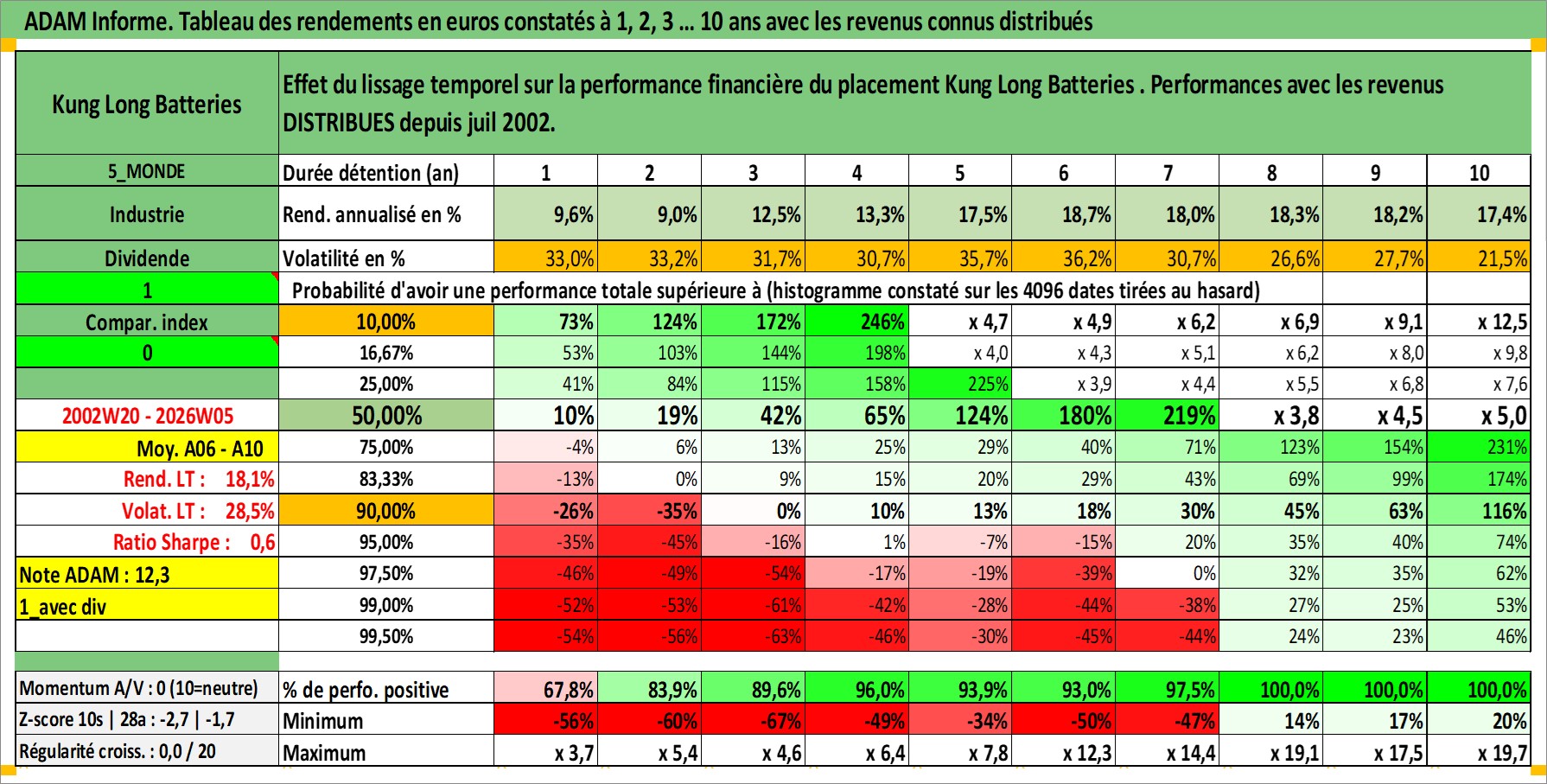 Site dédié aux investisseursPage dédiée sur site financeAnalyse des valorisations hebdomadaires de l'action Kung Long Batteries . Cet actif est cote en TWD. Les valorisations sont en contrevaleur EURO et couvrent les semaines 2002W20 a 2026W05. Les revenus de cet actif financier sont pris en compte depuis la semaine 2002W28. La note ESG de cet actif n'est pas connue.