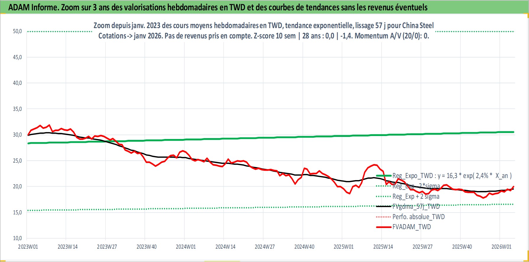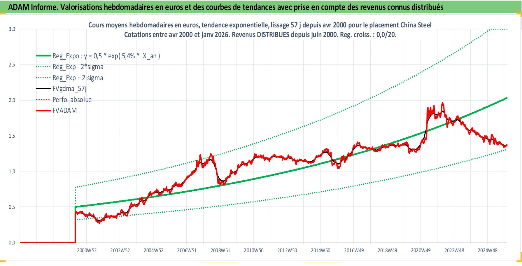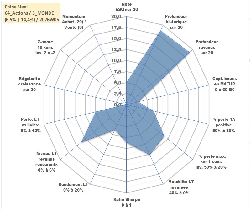 Site dédié aux investisseursPage dédiée sur site financeAnalyse des valorisations hebdomadaires de l'action China Steel . Cet actif est cote en TWD. Les valorisations sont en contrevaleur EURO et couvrent les semaines 2000W17 a 2026W05. Les revenus de cet actif financier sont pris en compte depuis la semaine 2000W25. La note globale ESG de cet actif est estimee a 5.0 (apres rebasage entre 0 et 20).