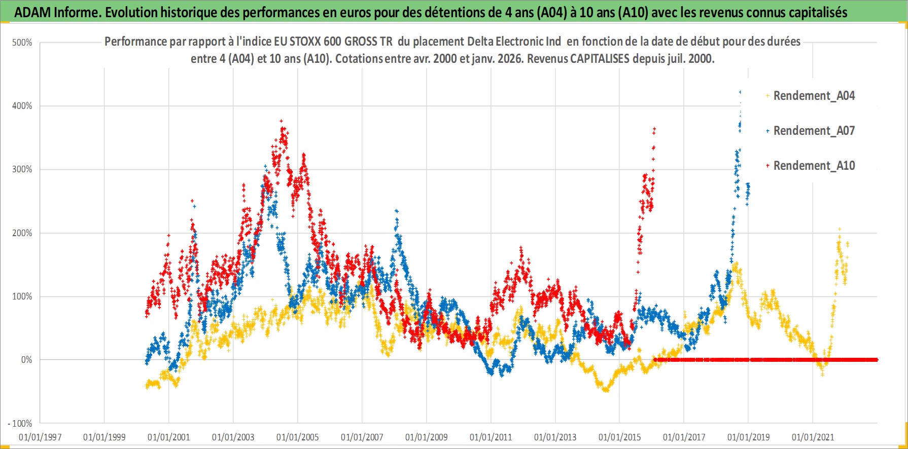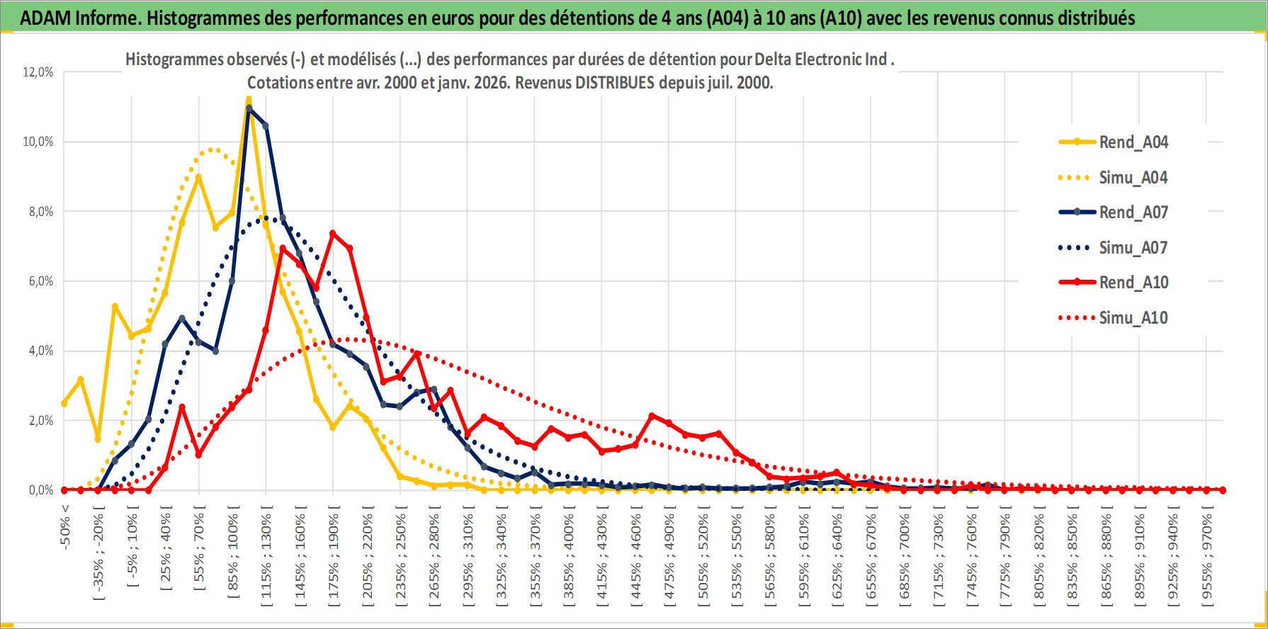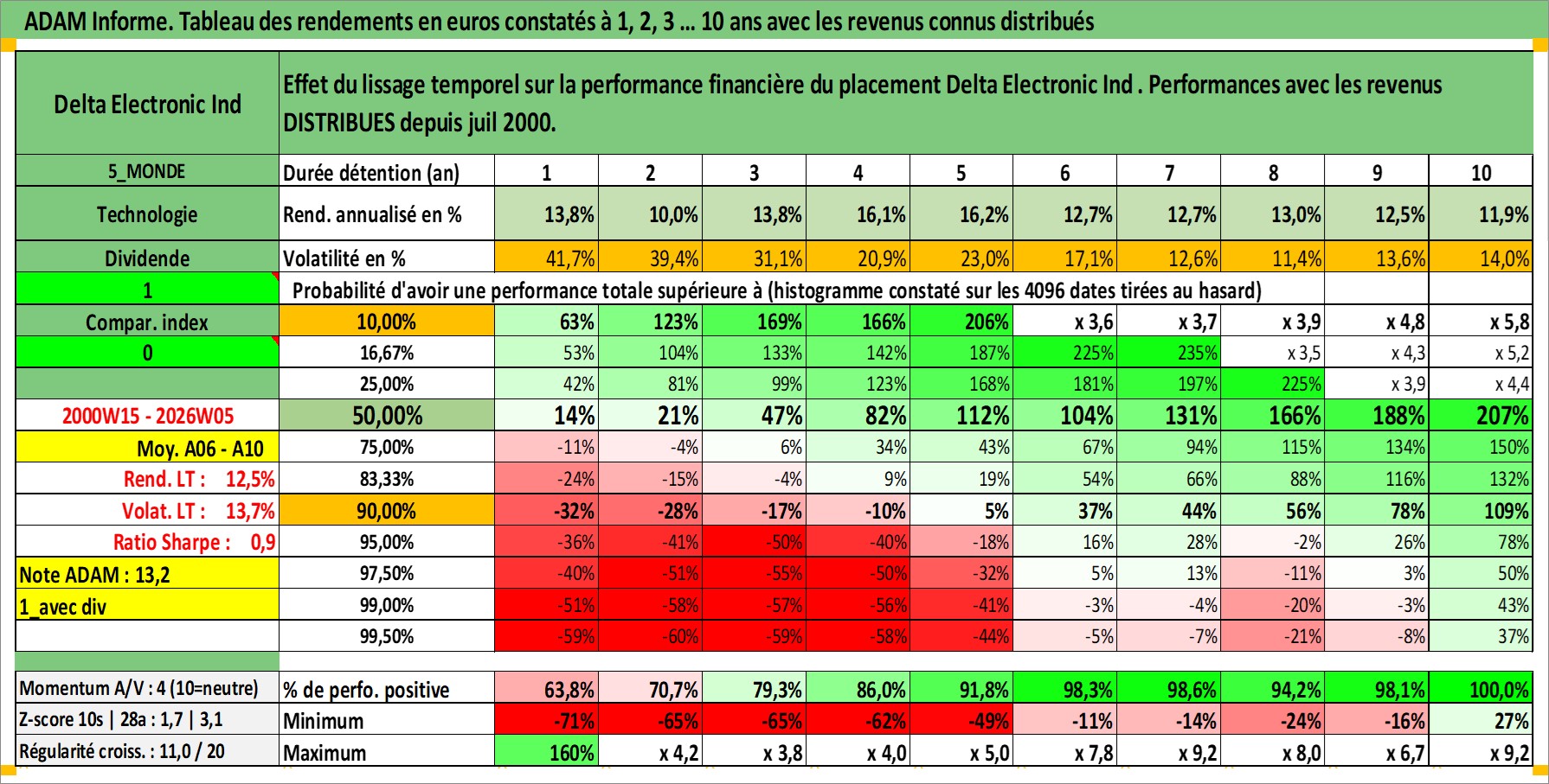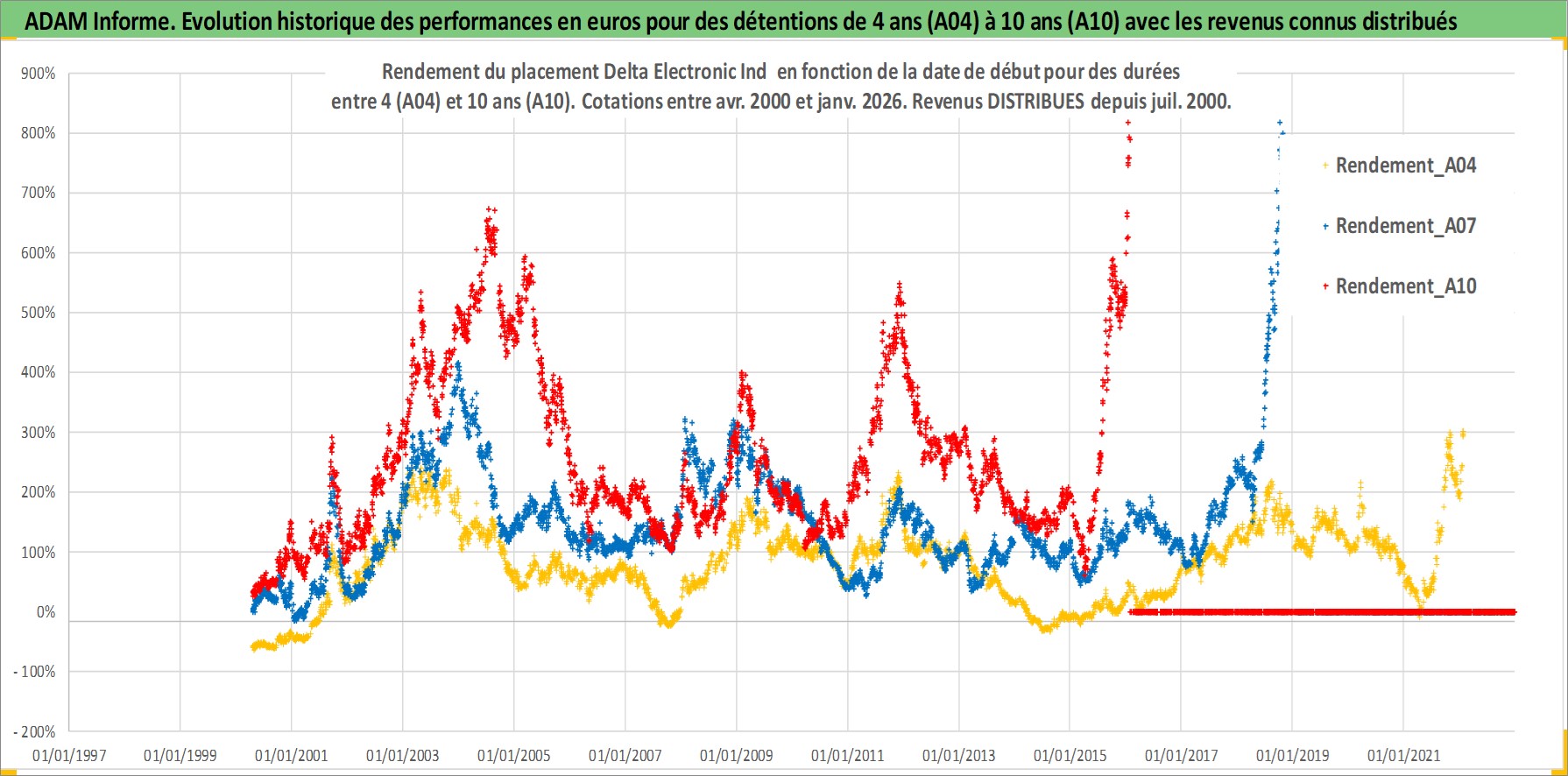 Site dédié aux investisseursPage dédiée sur site financeAnalyse des valorisations hebdomadaires de l'action Delta Electronic Ind . Cet actif est cote en TWD. Les valorisations sont en contrevaleur EURO et couvrent les semaines 2000W15 a 2026W05. Les revenus de cet actif financier sont pris en compte depuis la semaine 2000W28. La note globale ESG de cet actif est estimee a 11.0 (apres rebasage entre 0 et 20).