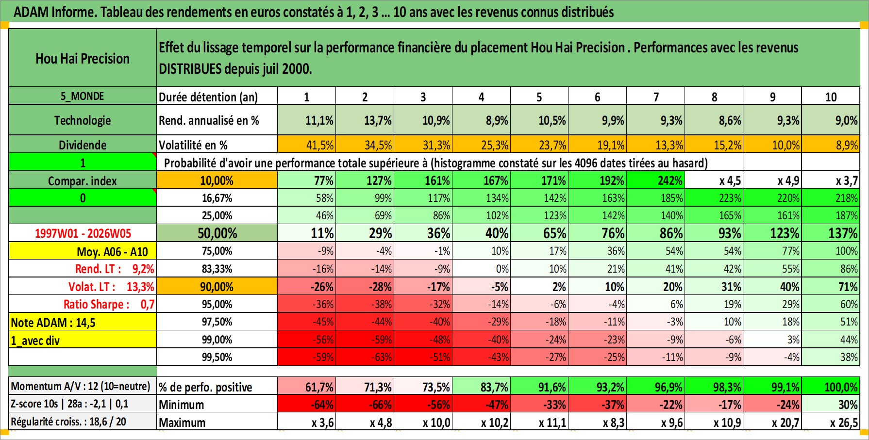 Site dédié aux investisseursPage dédiée sur site financeAnalyse des valorisations hebdomadaires de l'action Hou Hai Precision . Cet actif est cote en TWD. Les valorisations sont en contrevaleur EURO et couvrent les semaines 1997W01 a 2026W05. Les revenus de cet actif financier sont pris en compte depuis la semaine 2000W28. La note globale ESG de cet actif est estimee a 17.0 (apres rebasage entre 0 et 20).