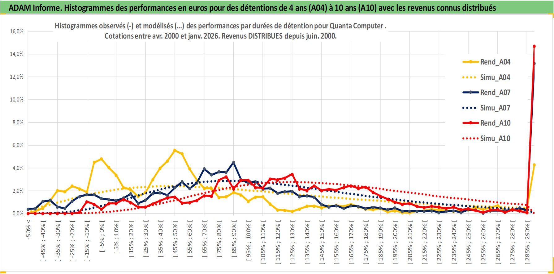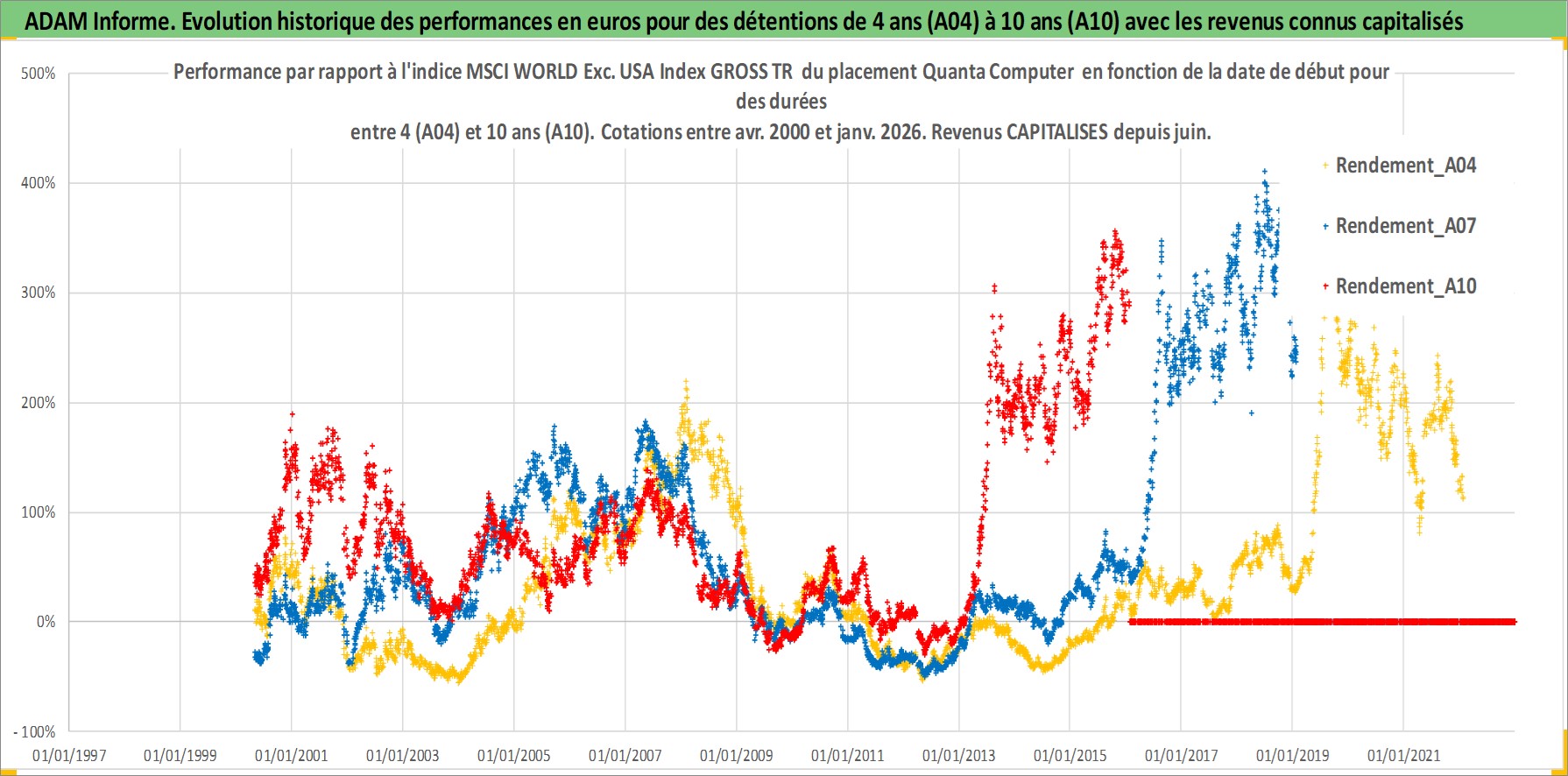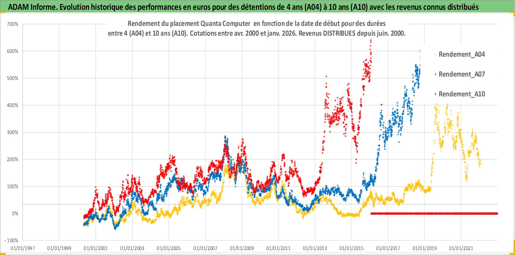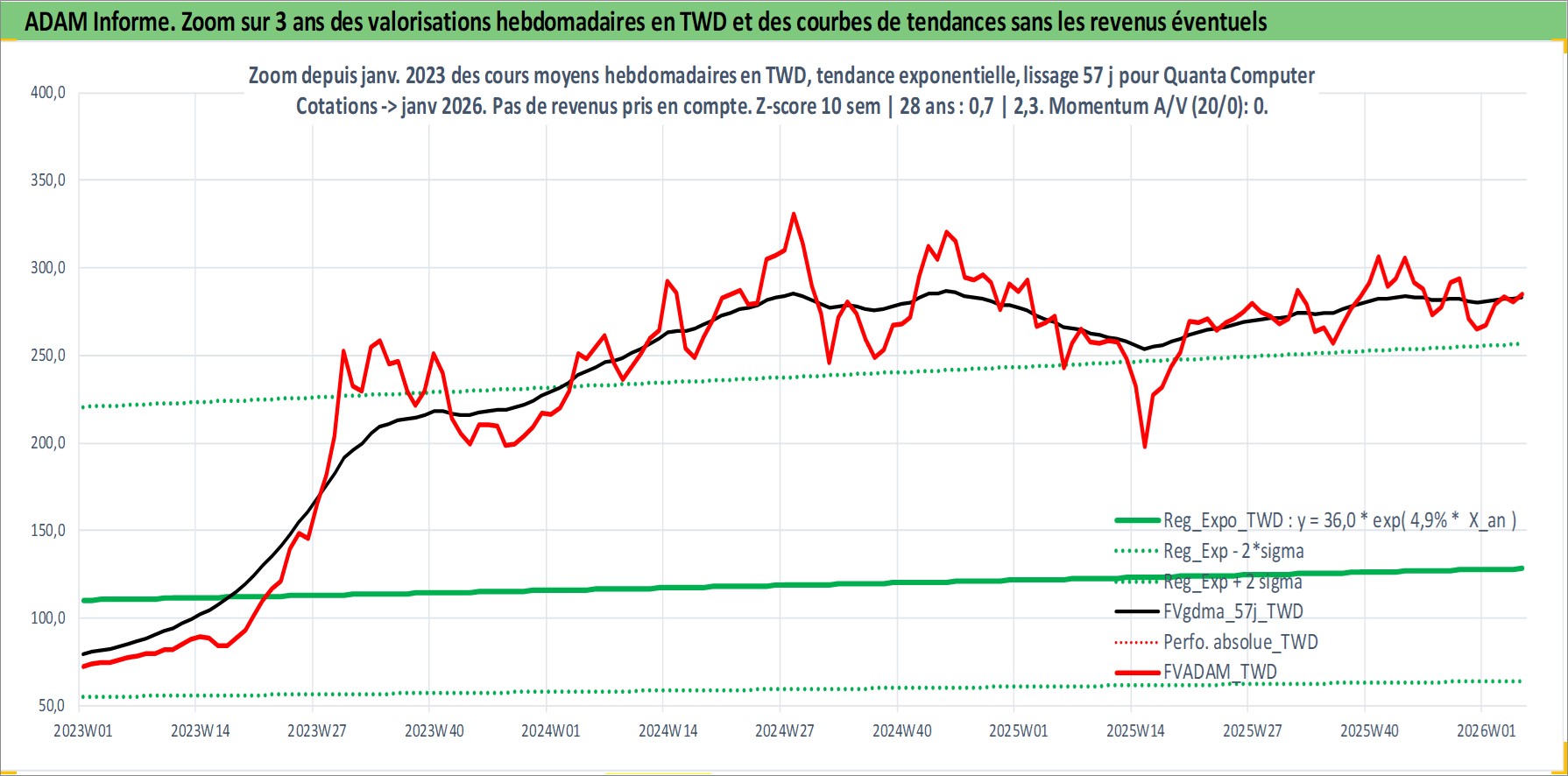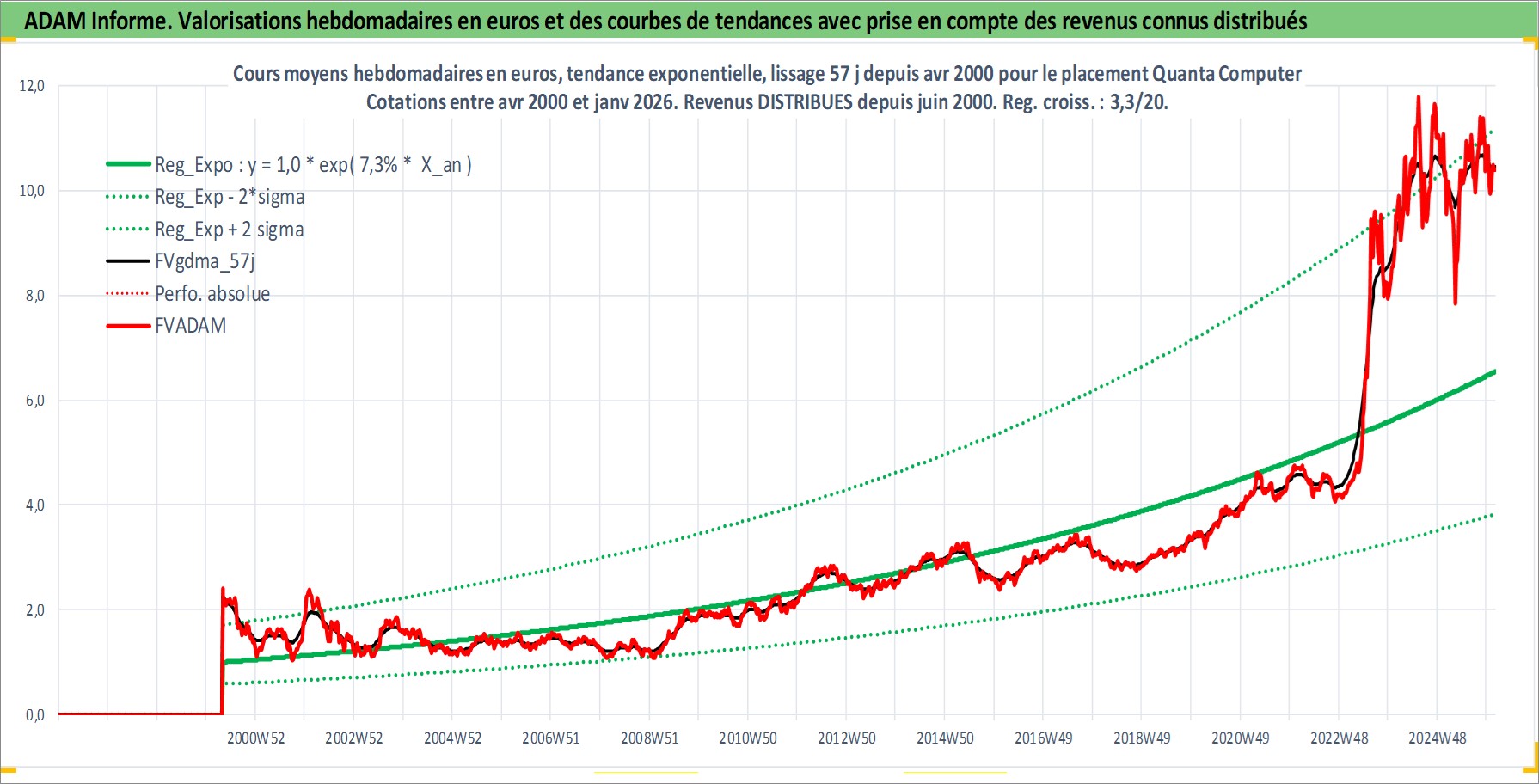 Site dédié aux investisseursPage dédiée sur site financeAnalyse des valorisations hebdomadaires de l'action Quanta Computer . Cet actif est cote en TWD. Les valorisations sont en contrevaleur EURO et couvrent les semaines 2000W17 a 2026W05. Les revenus de cet actif financier sont pris en compte depuis la semaine 2000W24. La note globale ESG de cet actif est estimee a 9.0 (apres rebasage entre 0 et 20).
