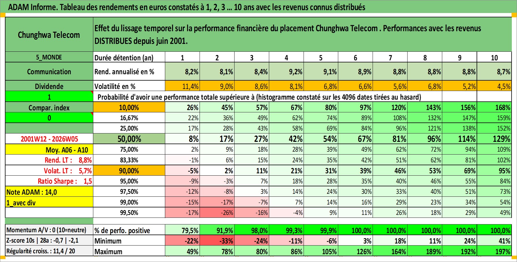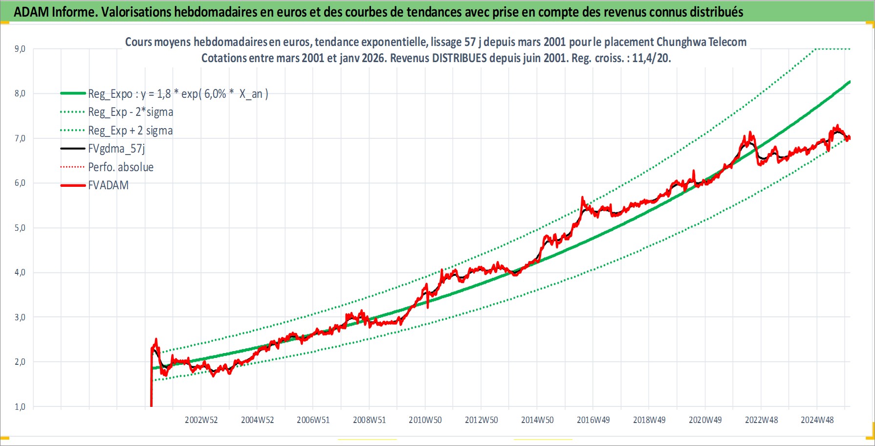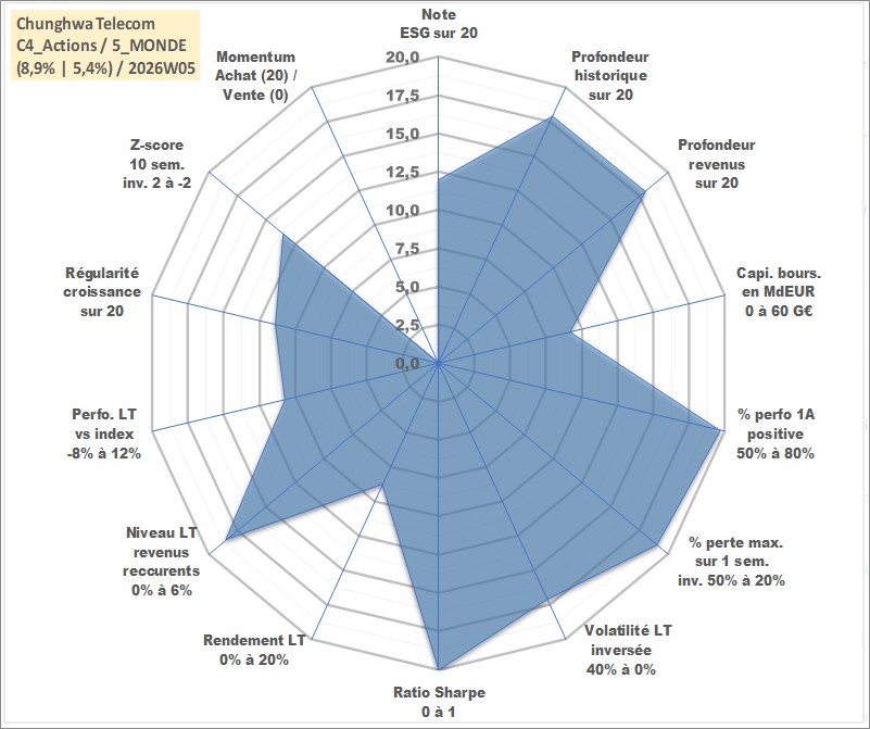 Site dédié aux investisseursPage dédiée sur site financeAnalyse des valorisations hebdomadaires de l'action Chunghwa Telecom . Cet actif est cote en TWD. Les valorisations sont en contrevaleur EURO et couvrent les semaines 2001W12 a 2026W05. Les revenus de cet actif financier sont pris en compte depuis la semaine 2001W25. La note globale ESG de cet actif est estimee a 12.0 (apres rebasage entre 0 et 20).