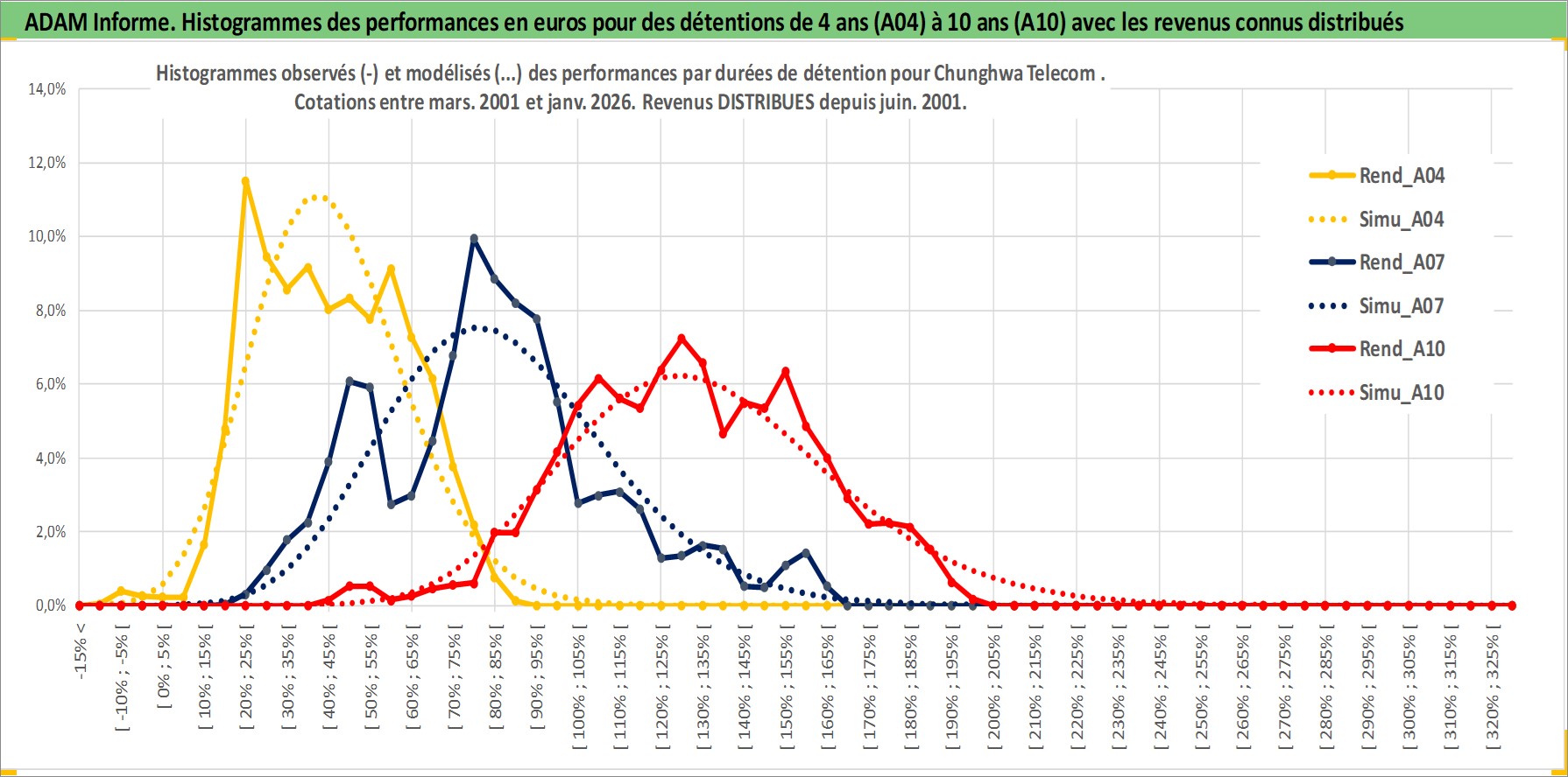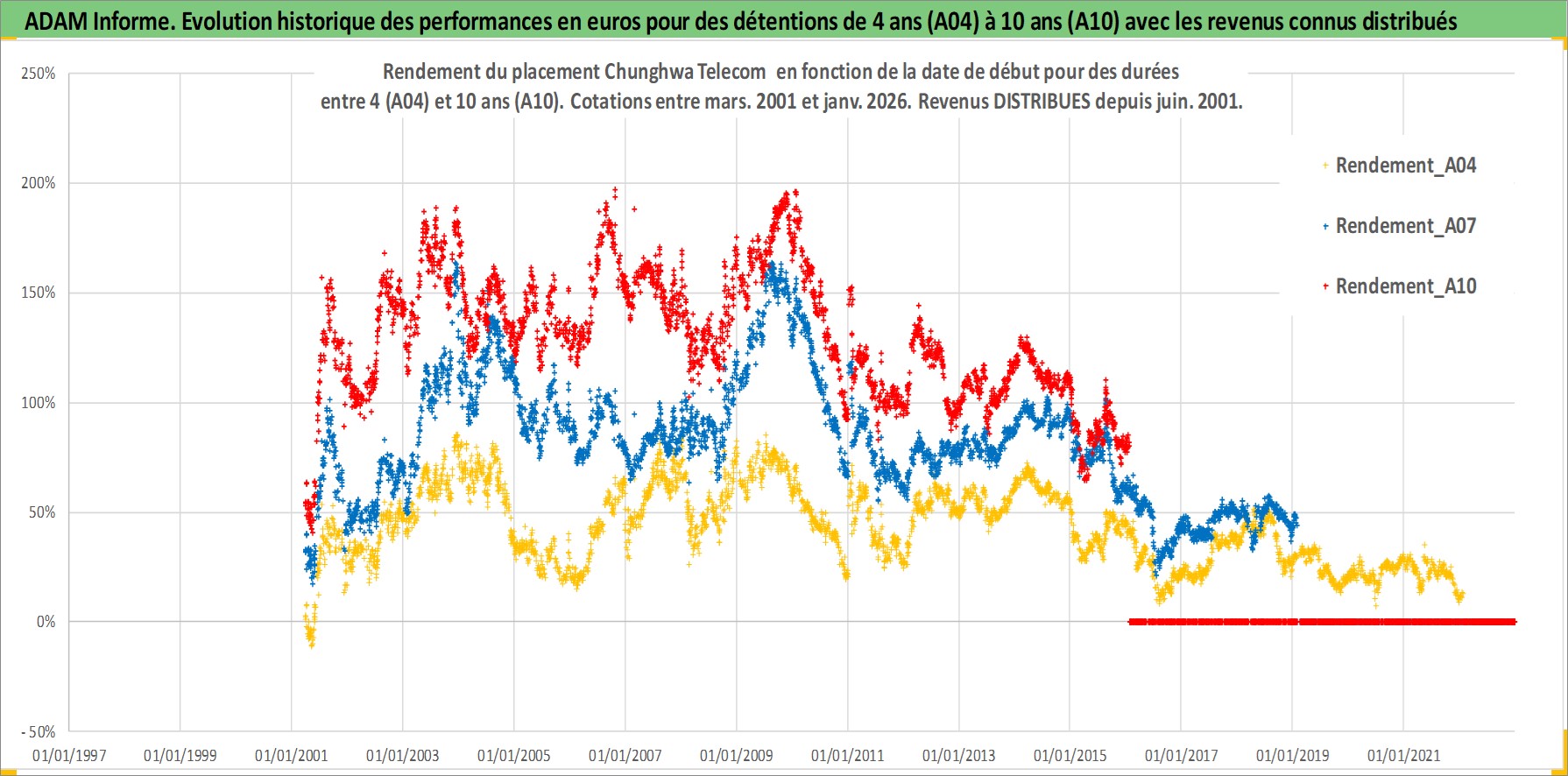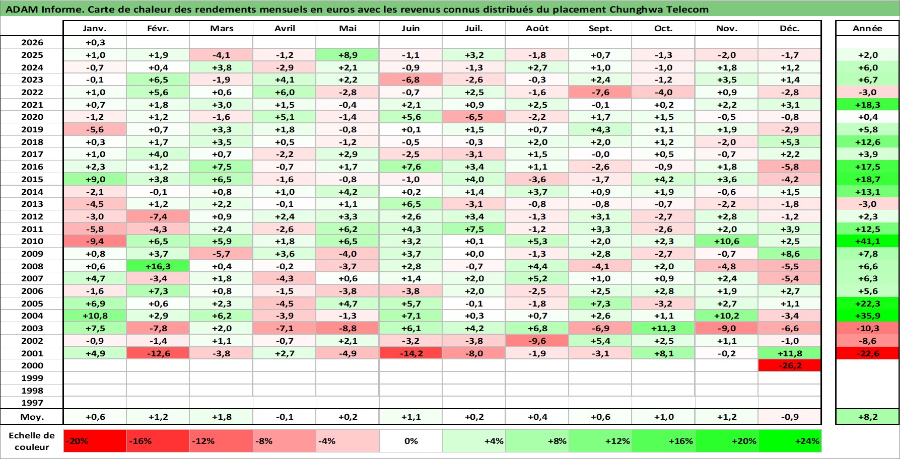 Site dédié aux investisseursPage dédiée sur site financeAnalyse des valorisations hebdomadaires de l'action Chunghwa Telecom . Cet actif est cote en TWD. Les valorisations sont en contrevaleur EURO et couvrent les semaines 2001W12 a 2026W05. Les revenus de cet actif financier sont pris en compte depuis la semaine 2001W25. La note globale ESG de cet actif est estimee a 12.0 (apres rebasage entre 0 et 20).