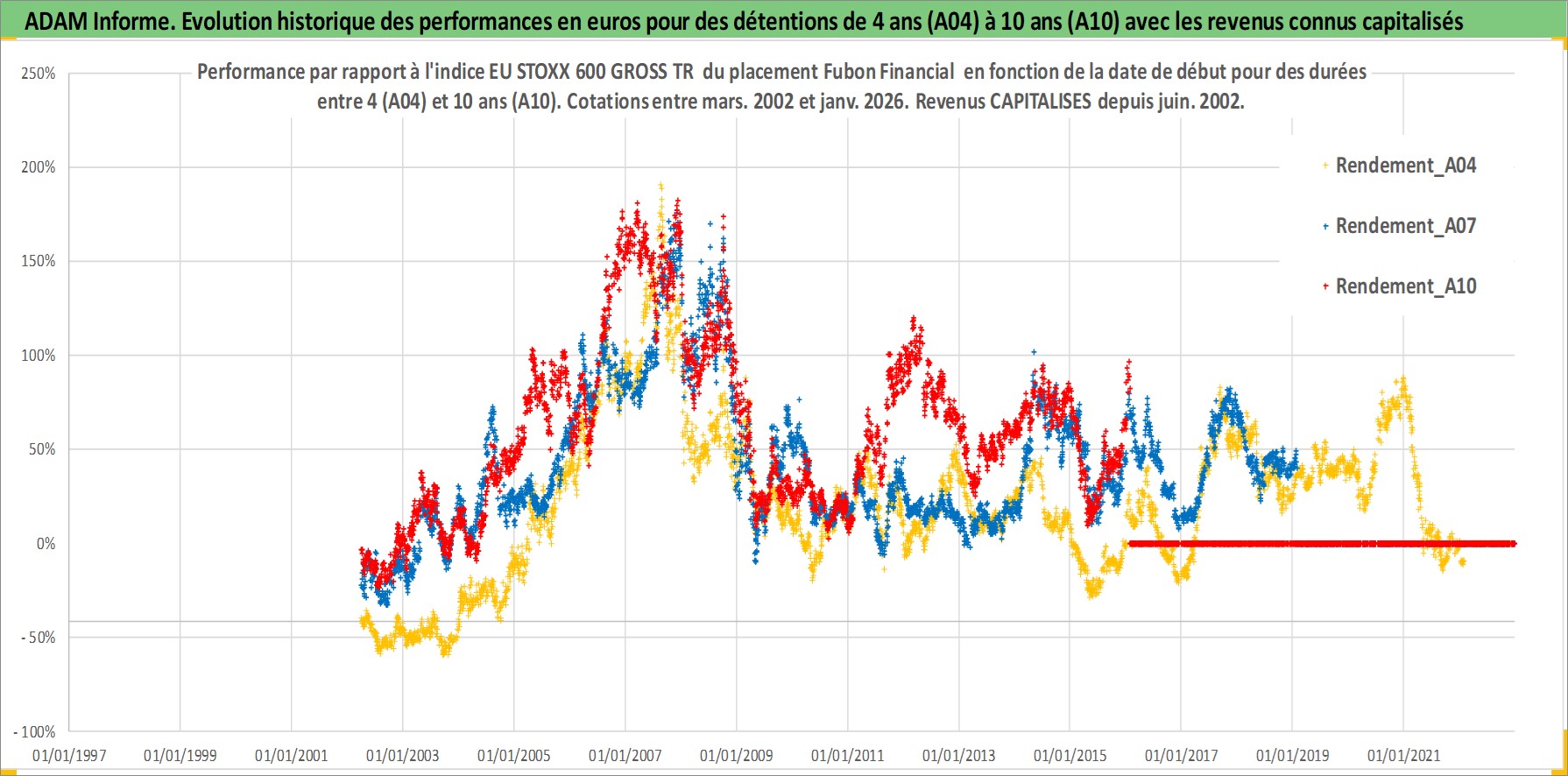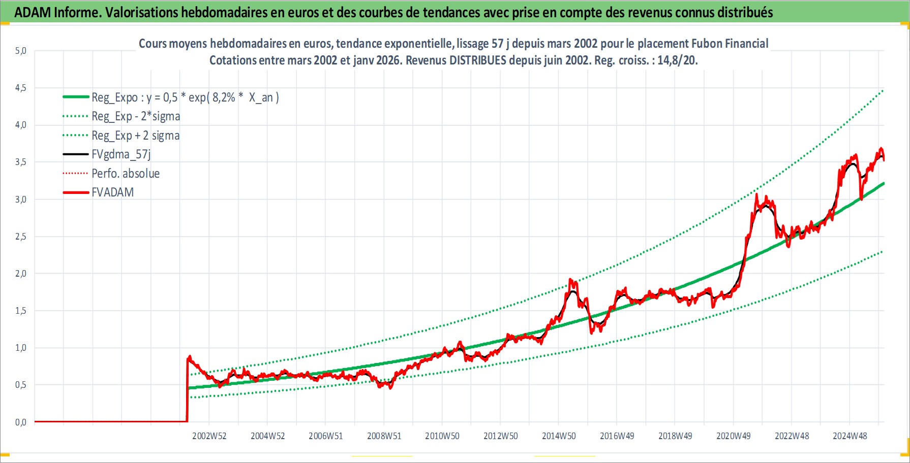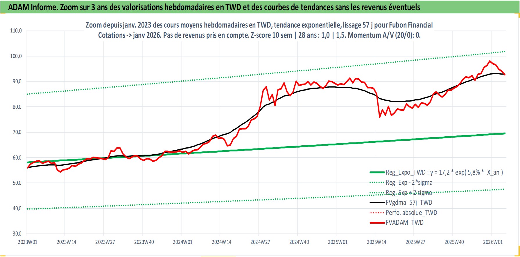 Site dédié aux investisseursPage dédiée sur site financeAnalyse des valorisations hebdomadaires de l'action Fubon Financial . Cet actif est cote en TWD. Les valorisations sont en contrevaleur EURO et couvrent les semaines 2002W13 a 2026W05. Les revenus de cet actif financier sont pris en compte depuis la semaine 2002W25. La note globale ESG de cet actif est estimee a 16.0 (apres rebasage entre 0 et 20).