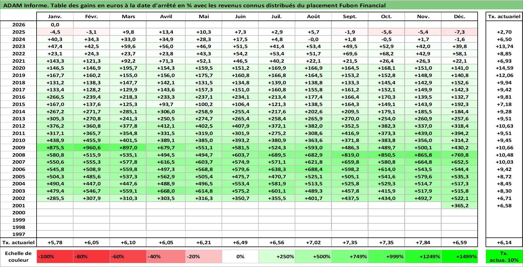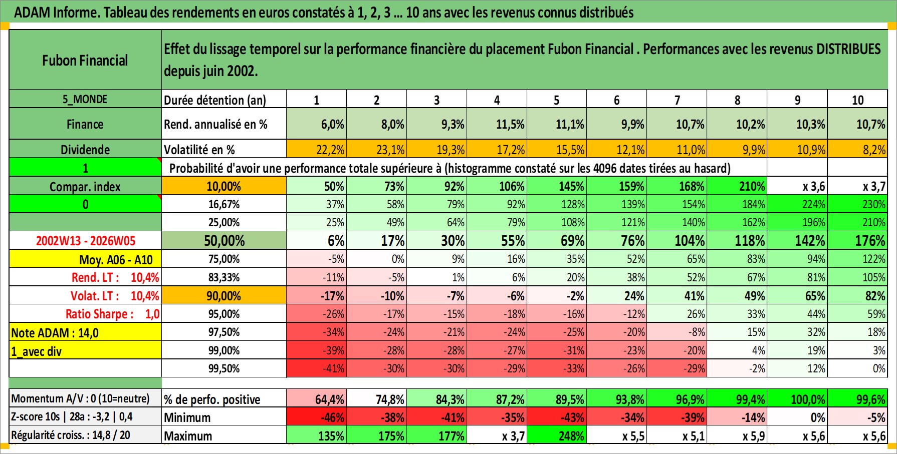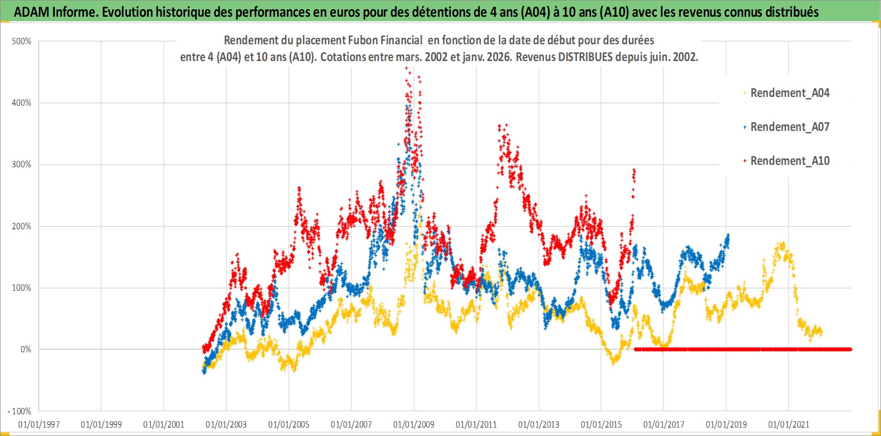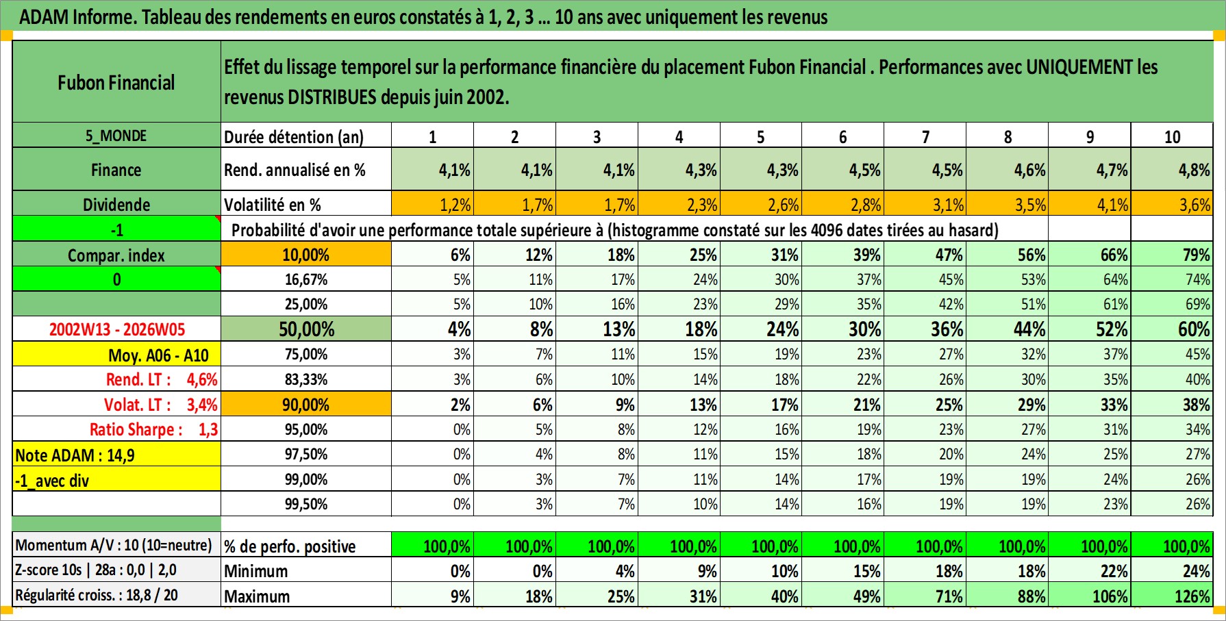 Site dédié aux investisseursPage dédiée sur site financeAnalyse des valorisations hebdomadaires de l'action Fubon Financial . Cet actif est cote en TWD. Les valorisations sont en contrevaleur EURO et couvrent les semaines 2002W13 a 2026W05. Les revenus de cet actif financier sont pris en compte depuis la semaine 2002W25. La note globale ESG de cet actif est estimee a 16.0 (apres rebasage entre 0 et 20).