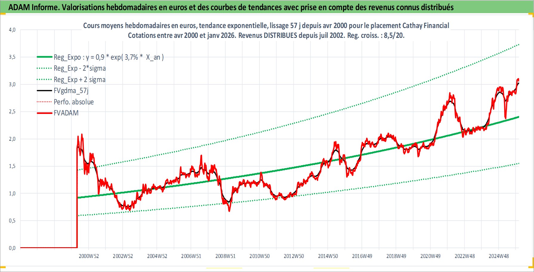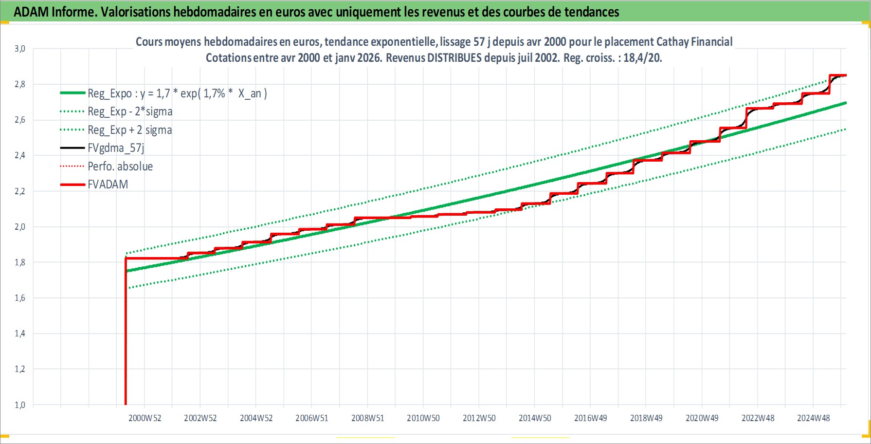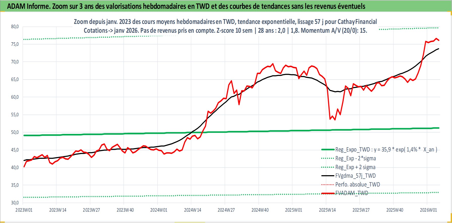 Site dédié aux investisseursPage dédiée sur site financeAnalyse des valorisations hebdomadaires de l'action Cathay Financial . Cet actif est cote en TWD. Les valorisations sont en contrevaleur EURO et couvrent les semaines 2000W17 a 2026W05. Les revenus de cet actif financier sont pris en compte depuis la semaine 2002W29. La note globale ESG de cet actif est estimee a 15.0 (apres rebasage entre 0 et 20).