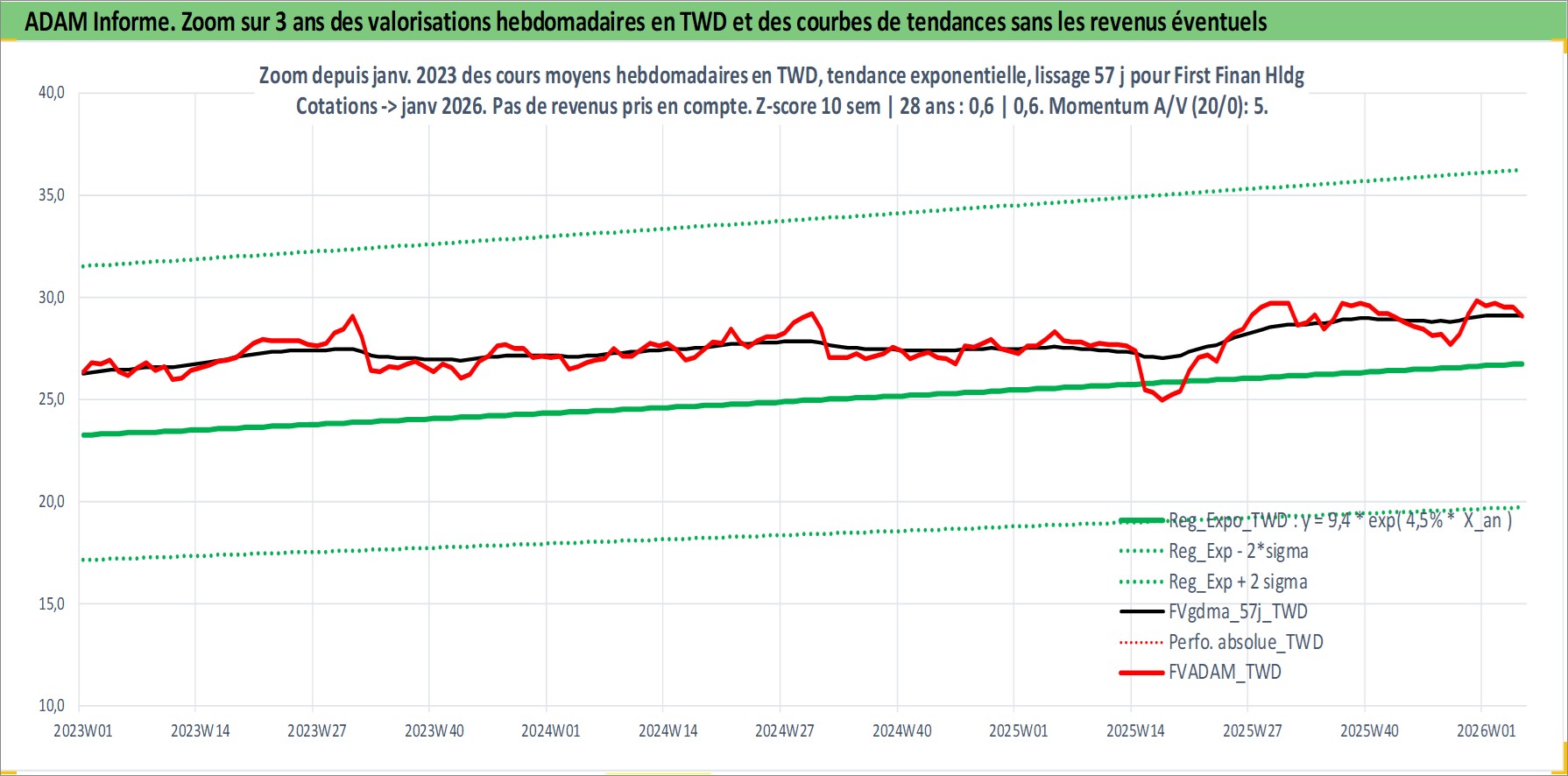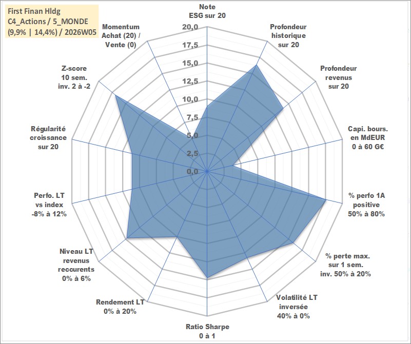 Site dédié aux investisseursPage dédiée sur site financeAnalyse des valorisations hebdomadaires de l'action First Finan Hldg . Cet actif est cote en TWD. Les valorisations sont en contrevaleur EURO et couvrent les semaines 2003W15 a 2026W05. Les revenus de cet actif financier sont pris en compte depuis la semaine 2005W32. La note globale ESG de cet actif est estimee a 9.0 (apres rebasage entre 0 et 20).
