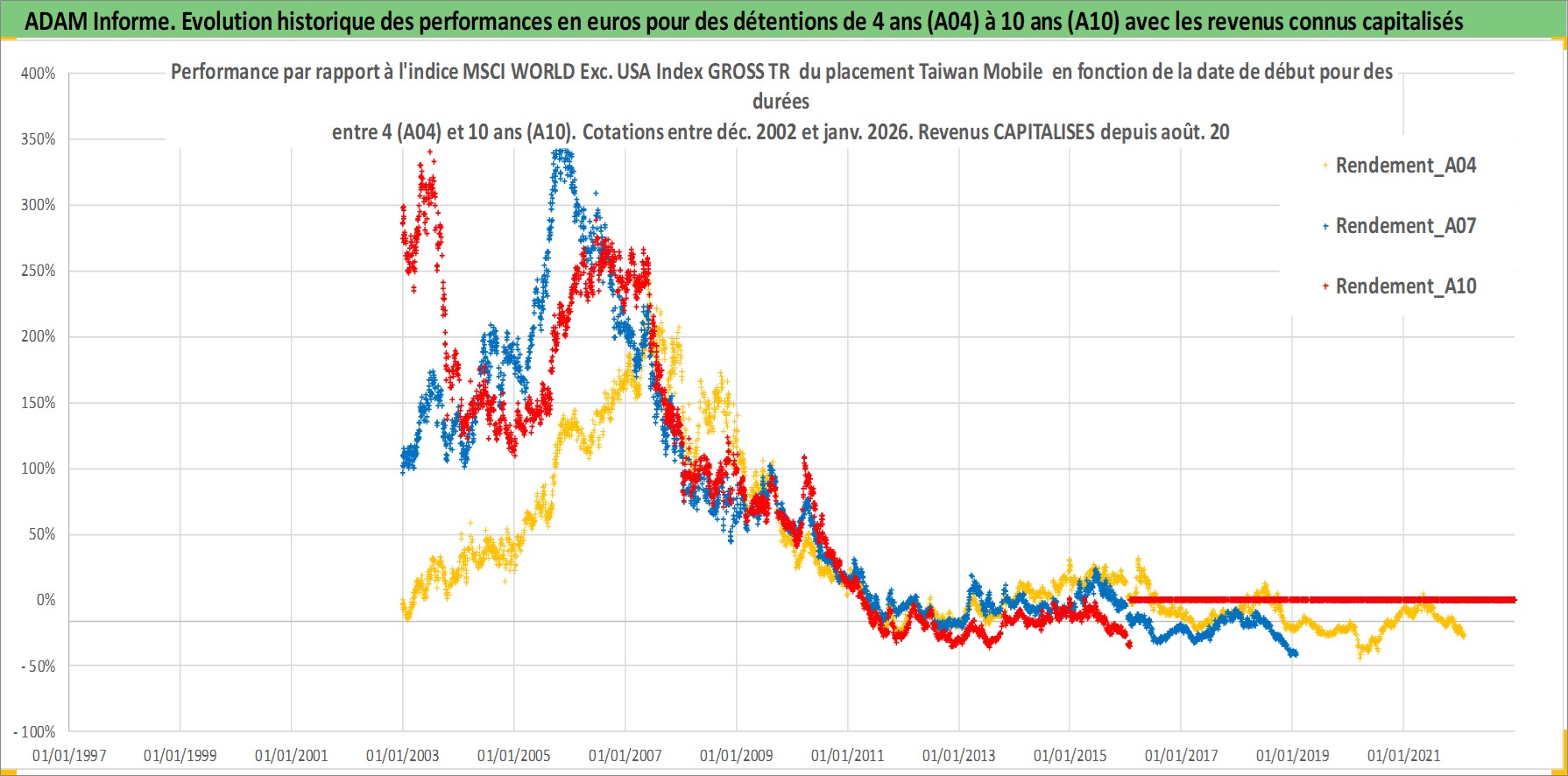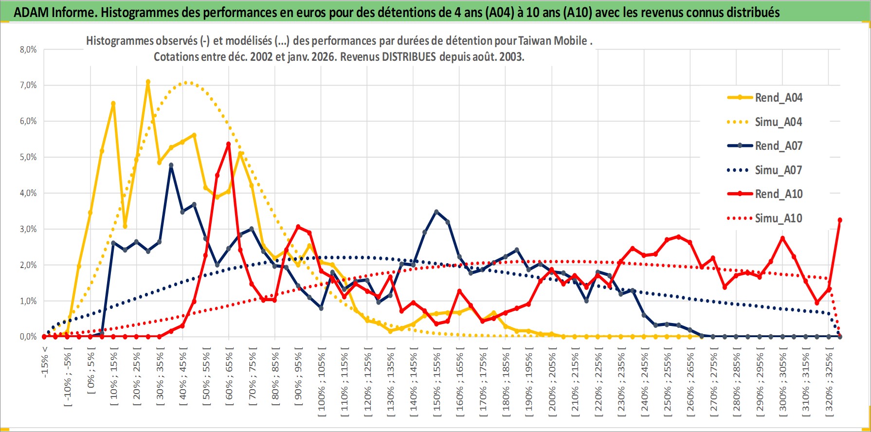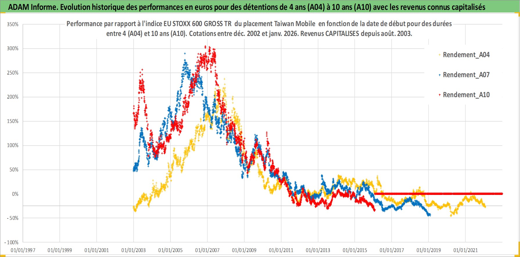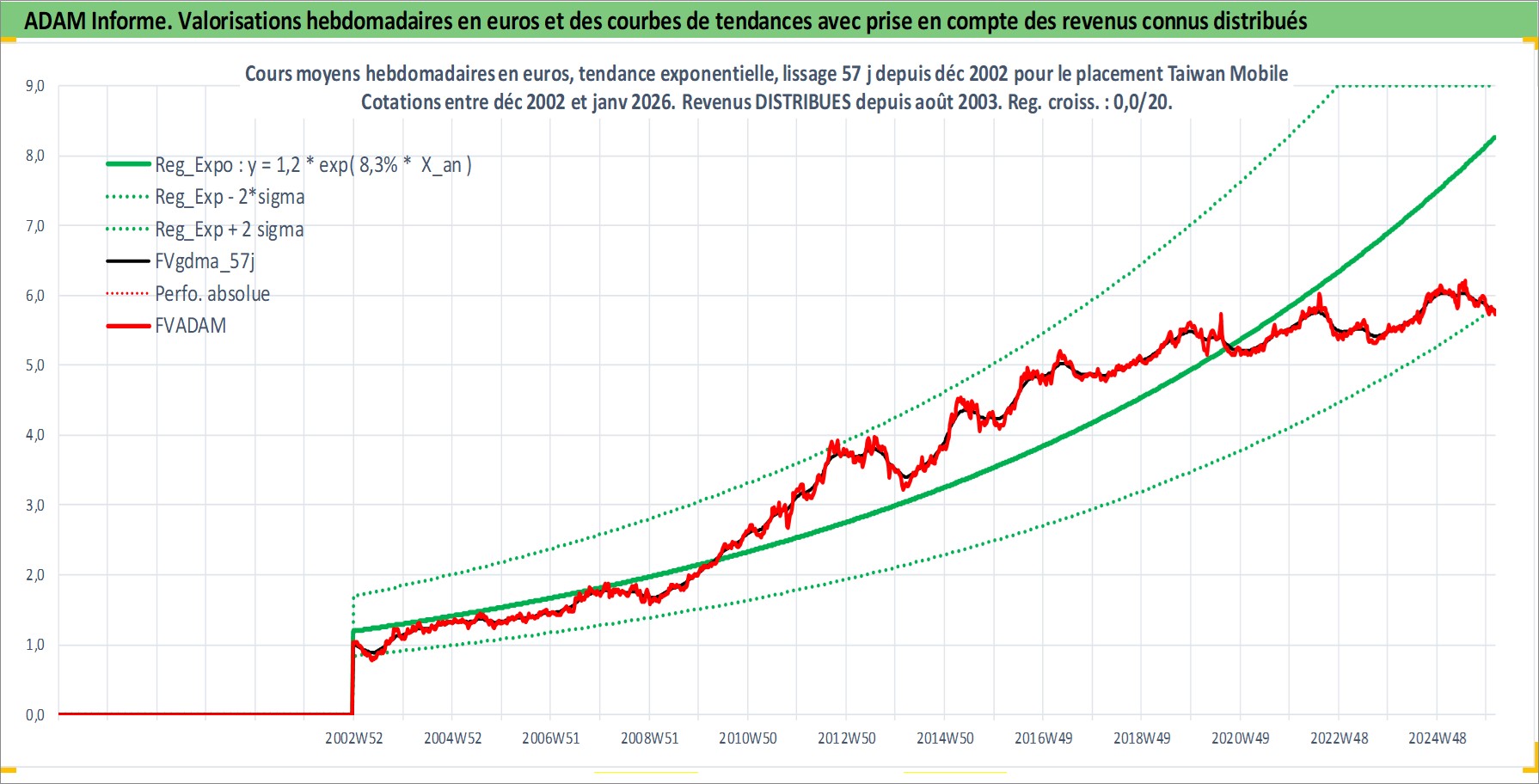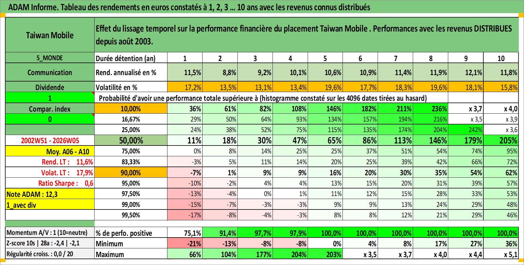 Site dédié aux investisseursPage dédiée sur site financeAnalyse des valorisations hebdomadaires de l'action Taiwan Mobile . Cet actif est cote en TWD. Les valorisations sont en contrevaleur EURO et couvrent les semaines 2002W51 a 2026W05. Les revenus de cet actif financier sont pris en compte depuis la semaine 2003W33. La note globale ESG de cet actif est estimee a 11.0 (apres rebasage entre 0 et 20).