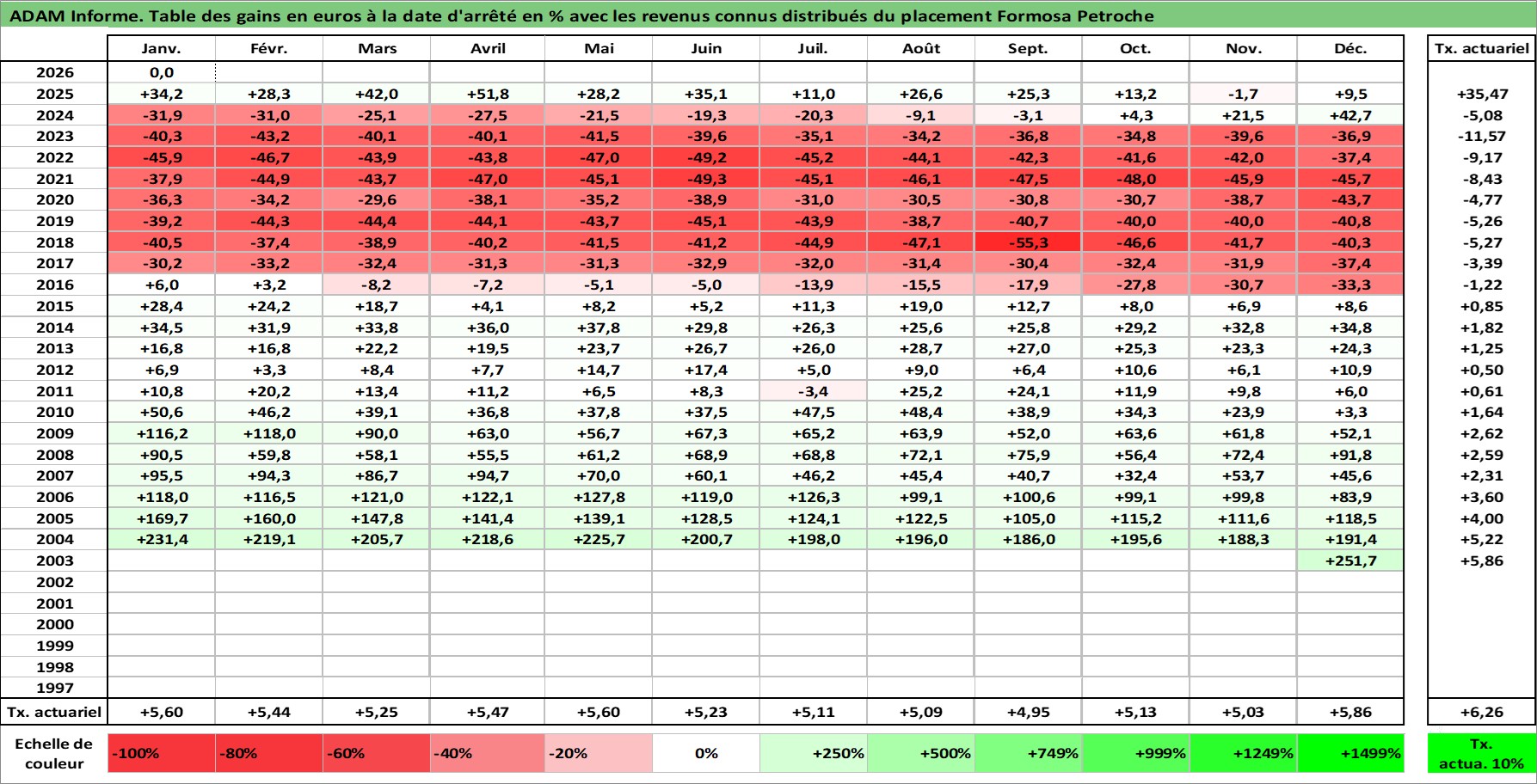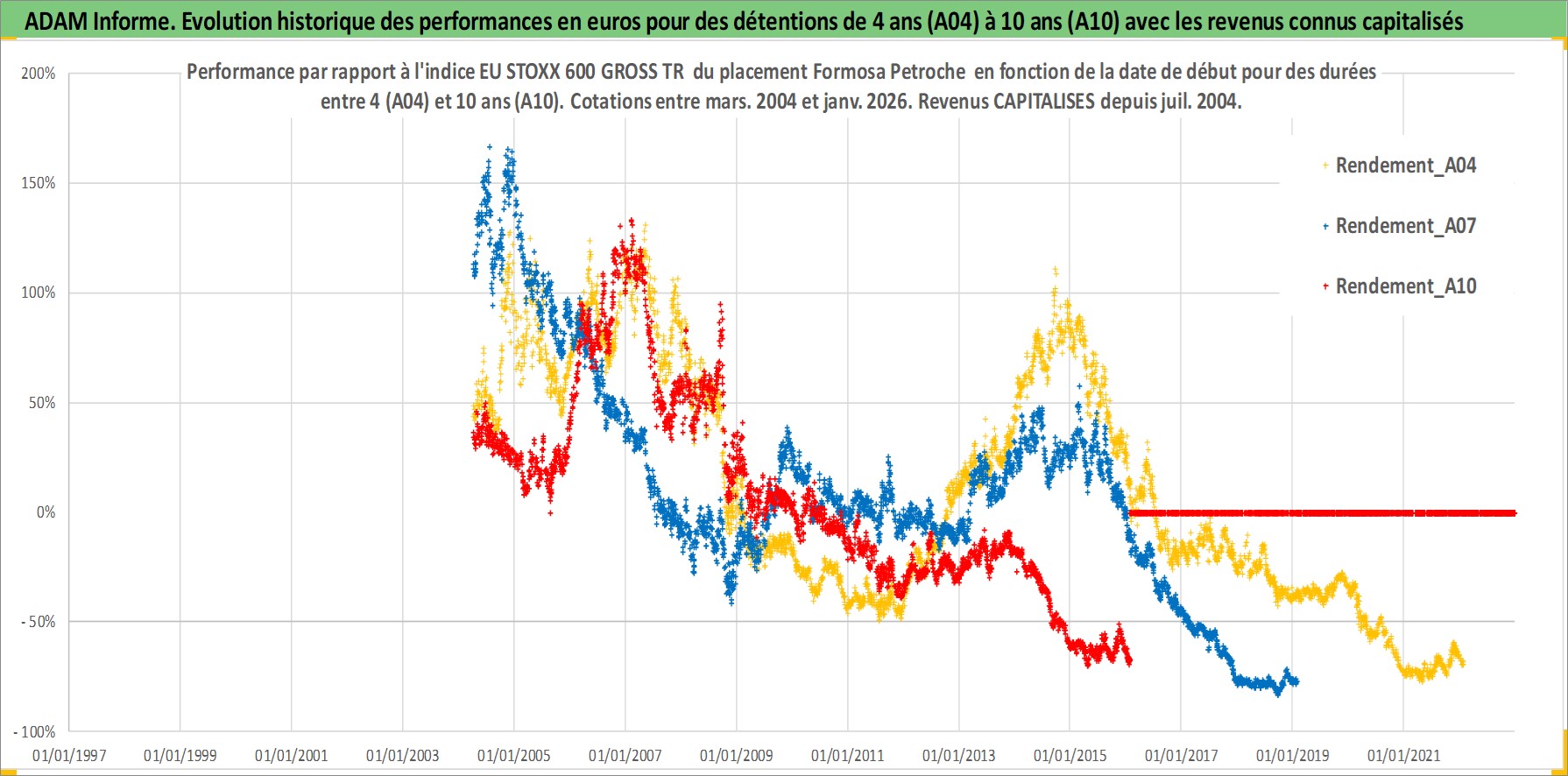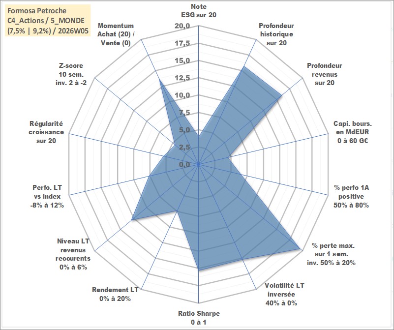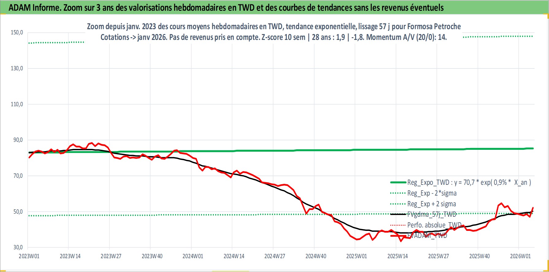 Site dédié aux investisseursPage dédiée sur site financeAnalyse des valorisations hebdomadaires de l'action Formosa Petroche . Cet actif est cote en TWD. Les valorisations sont en contrevaleur EURO et couvrent les semaines 2004W14 a 2026W05. Les revenus de cet actif financier sont pris en compte depuis la semaine 2004W28. La note globale ESG de cet actif est estimee a 4.0 (apres rebasage entre 0 et 20).