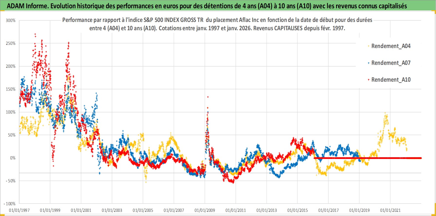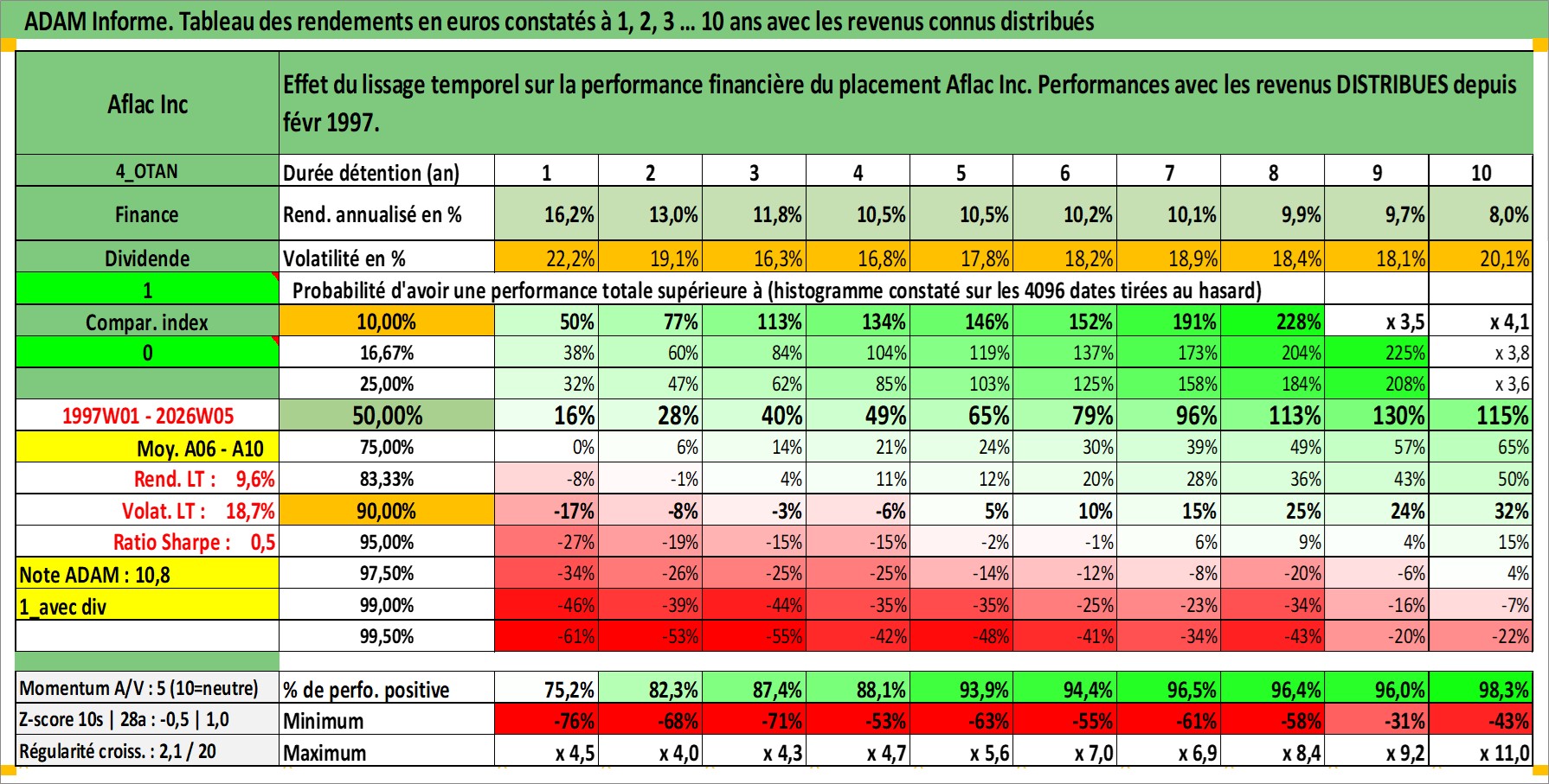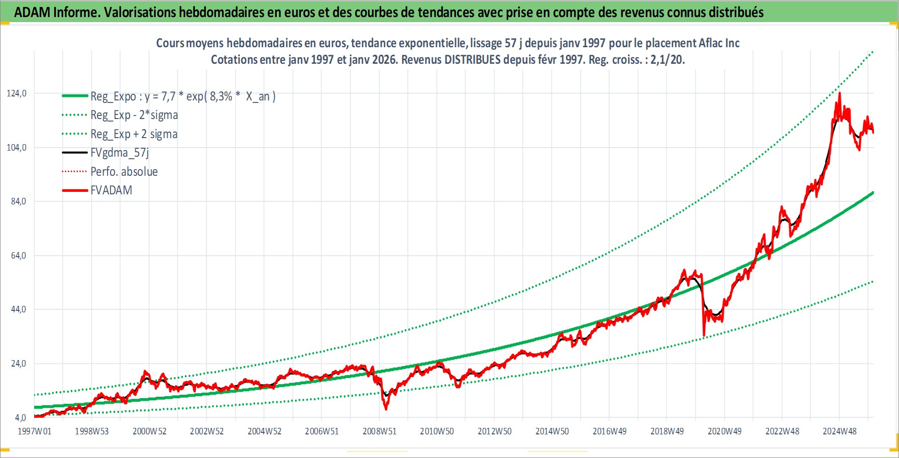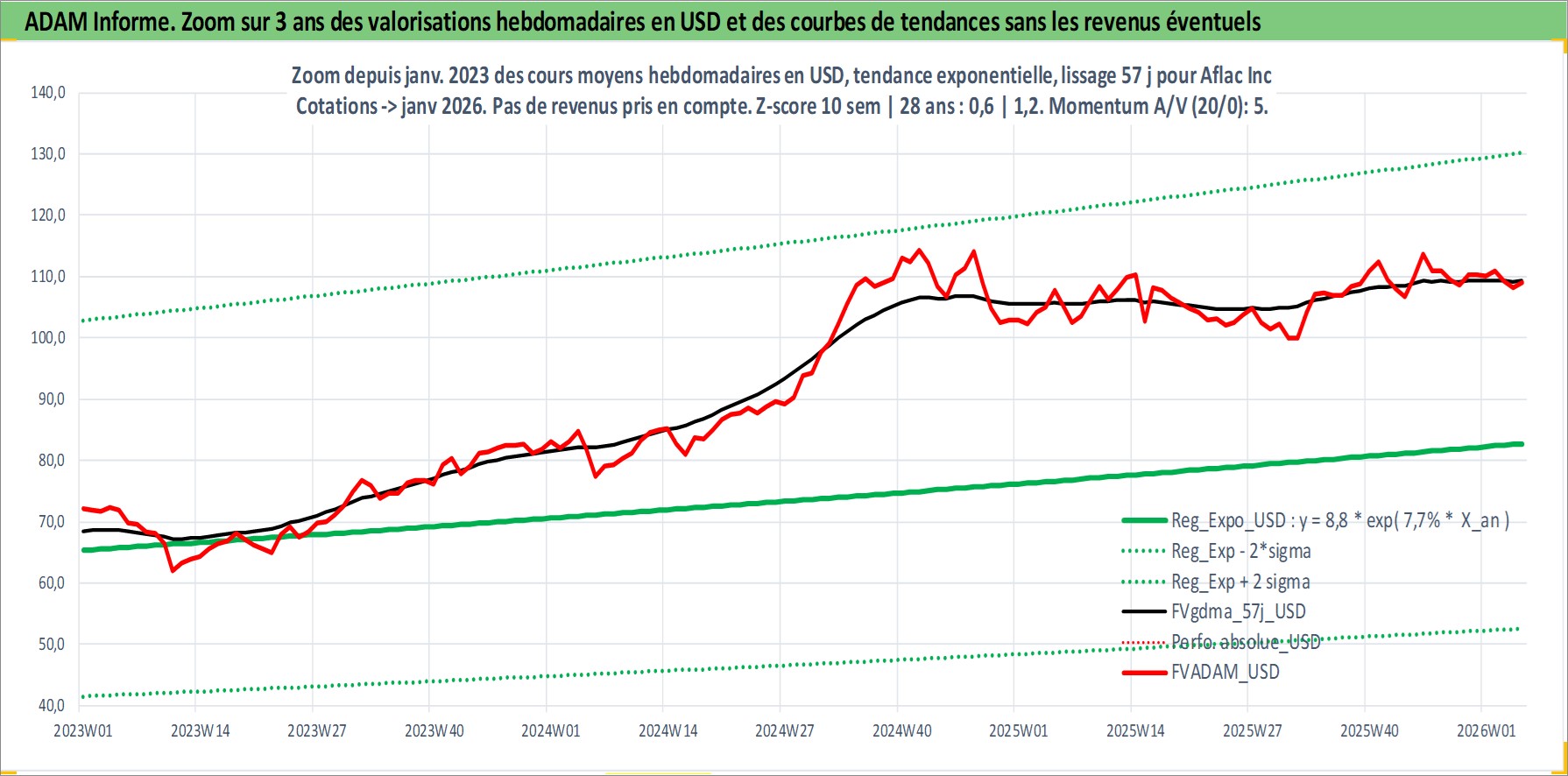 Site dédié aux investisseursPage dédiée sur site financeAnalyse des valorisations hebdomadaires de l'action Aflac Inc. Cet actif est cote en USD. Les valorisations sont en contrevaleur EURO et couvrent les semaines 1997W01 a 2026W05. Les revenus de cet actif financier sont pris en compte depuis la semaine 1997W08. La note globale ESG de cet actif est estimee a 12.0 (apres rebasage entre 0 et 20).