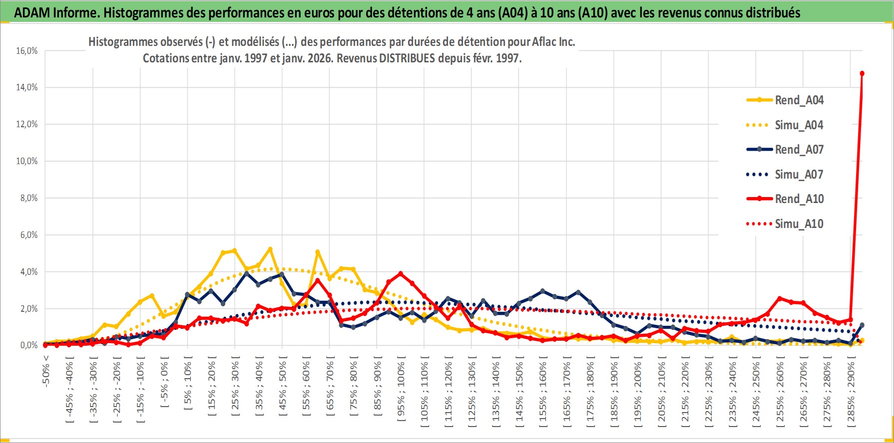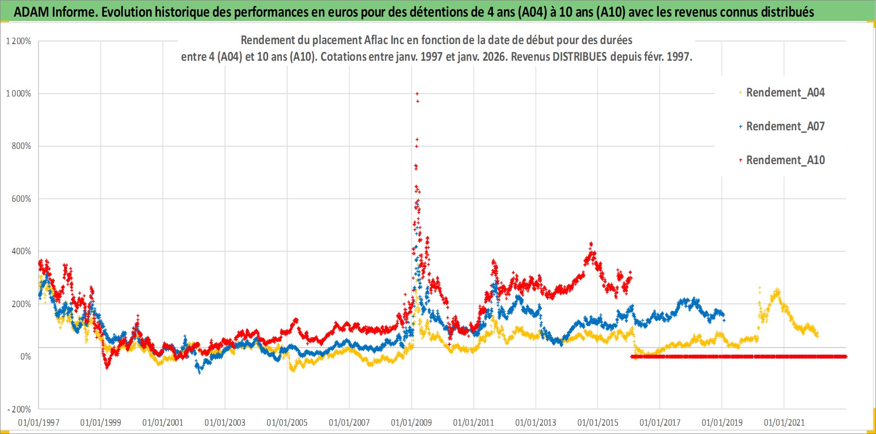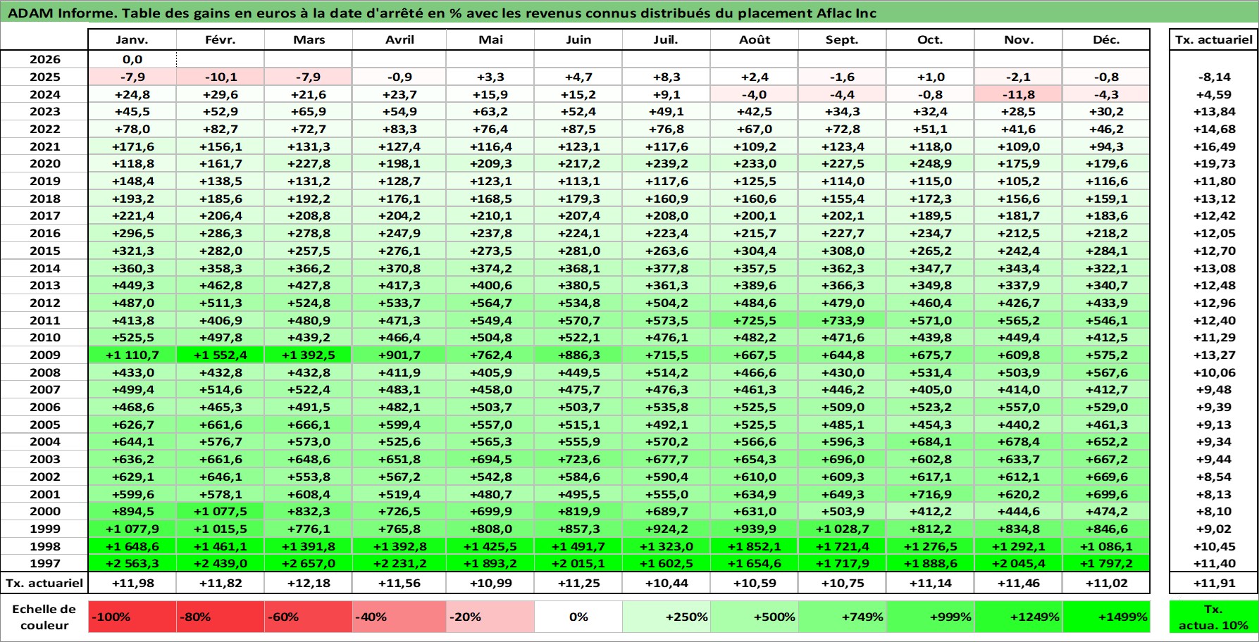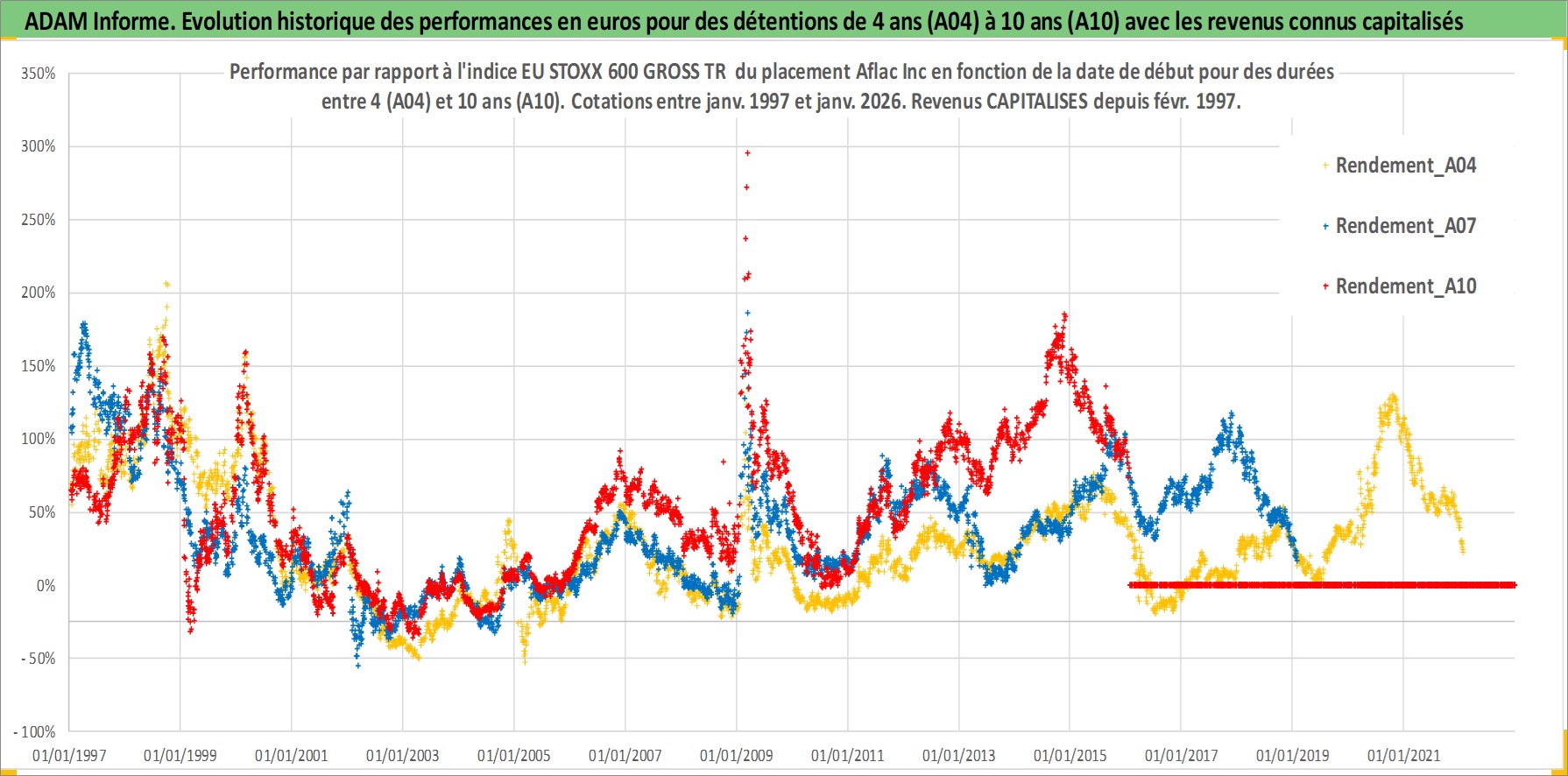 Site dédié aux investisseursPage dédiée sur site financeAnalyse des valorisations hebdomadaires de l'action Aflac Inc. Cet actif est cote en USD. Les valorisations sont en contrevaleur EURO et couvrent les semaines 1997W01 a 2026W05. Les revenus de cet actif financier sont pris en compte depuis la semaine 1997W08. La note globale ESG de cet actif est estimee a 12.0 (apres rebasage entre 0 et 20).