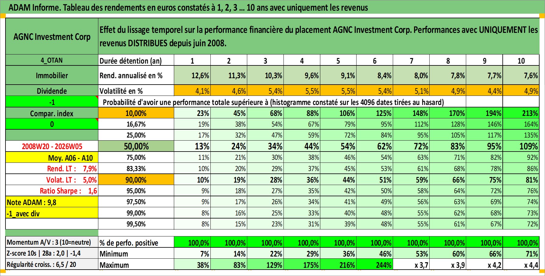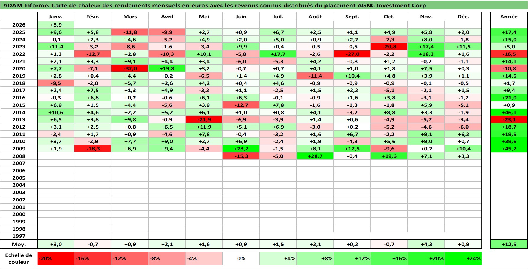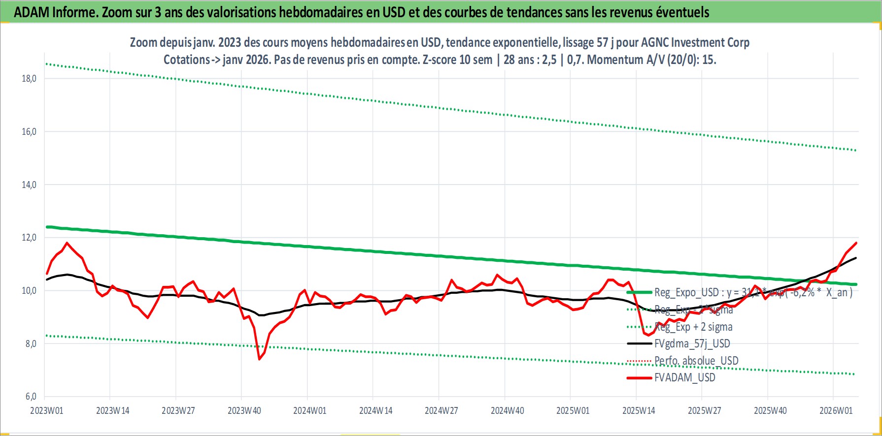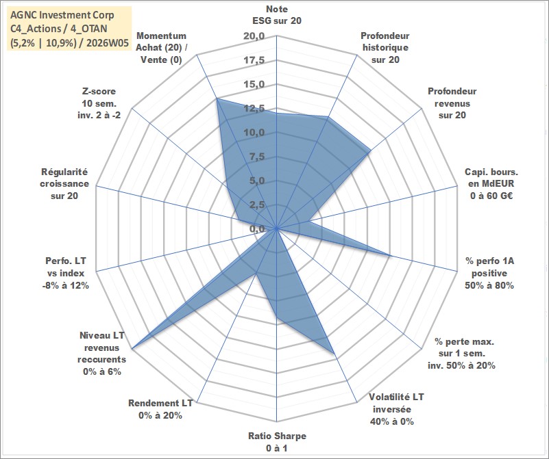 Site dédié aux investisseursPage dédiée sur site financeAnalyse des valorisations hebdomadaires de l'action AGNC Investment Corp. Cet actif est cote en USD. Les valorisations sont en contrevaleur EURO et couvrent les semaines 2008W20 a 2026W05. Les revenus de cet actif financier sont pris en compte depuis la semaine 2008W27. La note globale ESG de cet actif est estimee a 12.0 (apres rebasage entre 0 et 20).