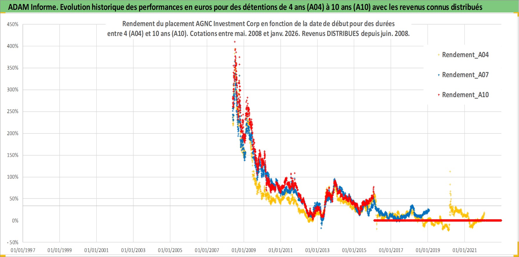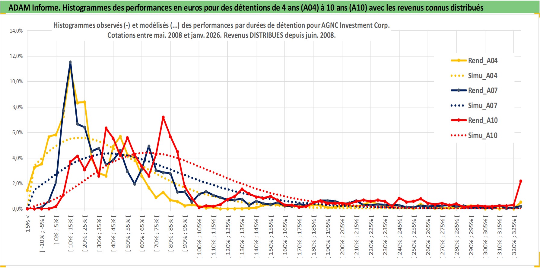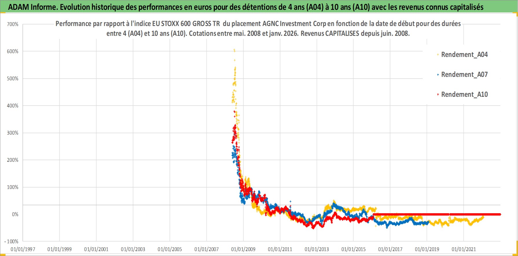 Site dédié aux investisseursPage dédiée sur site financeAnalyse des valorisations hebdomadaires de l'action AGNC Investment Corp. Cet actif est cote en USD. Les valorisations sont en contrevaleur EURO et couvrent les semaines 2008W20 a 2026W05. Les revenus de cet actif financier sont pris en compte depuis la semaine 2008W27. La note globale ESG de cet actif est estimee a 12.0 (apres rebasage entre 0 et 20).