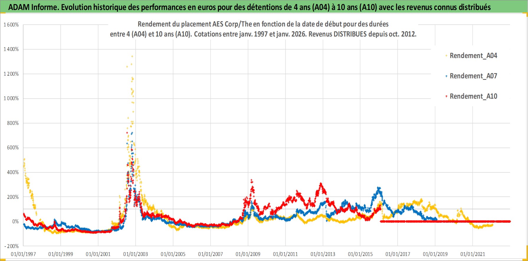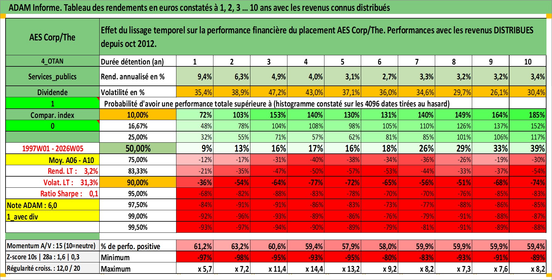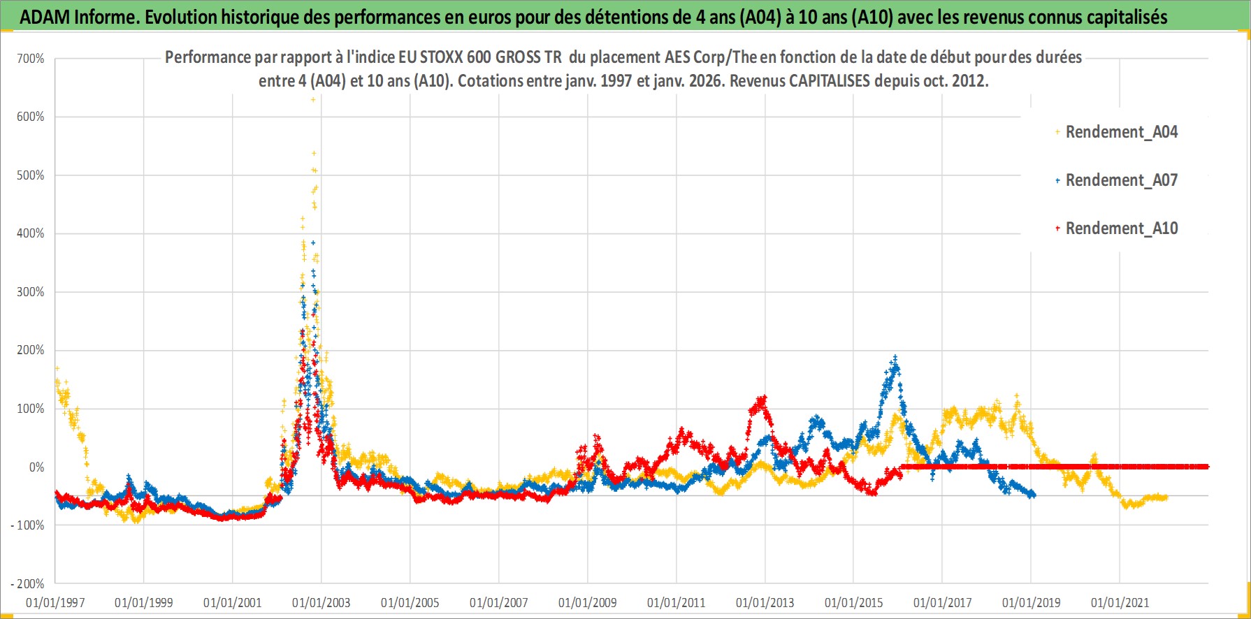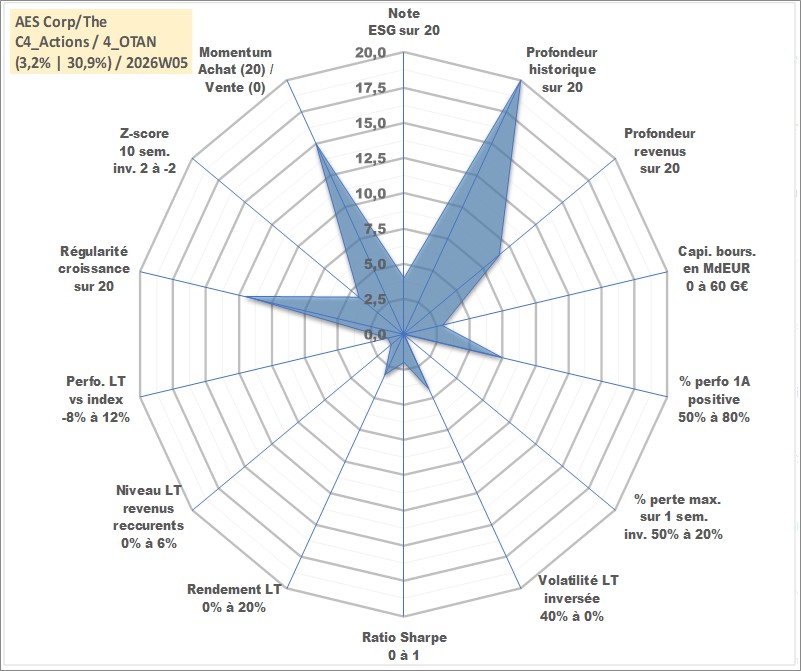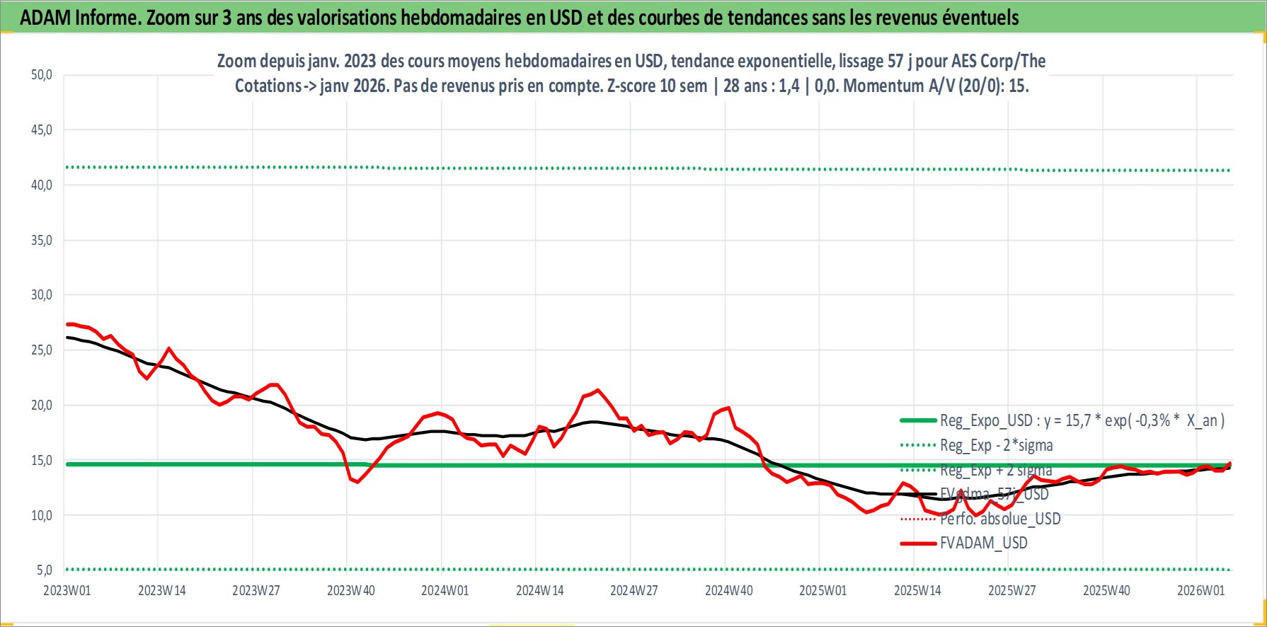 Site dédié aux investisseursPage dédiée sur site financeAnalyse des valorisations hebdomadaires de l'action AES Corp/The. Cet actif est cote en USD. Les valorisations sont en contrevaleur EURO et couvrent les semaines 1997W01 a 2026W05. Les revenus de cet actif financier sont pris en compte depuis la semaine 2012W43. La note globale ESG de cet actif est estimee a 4.0 (apres rebasage entre 0 et 20).