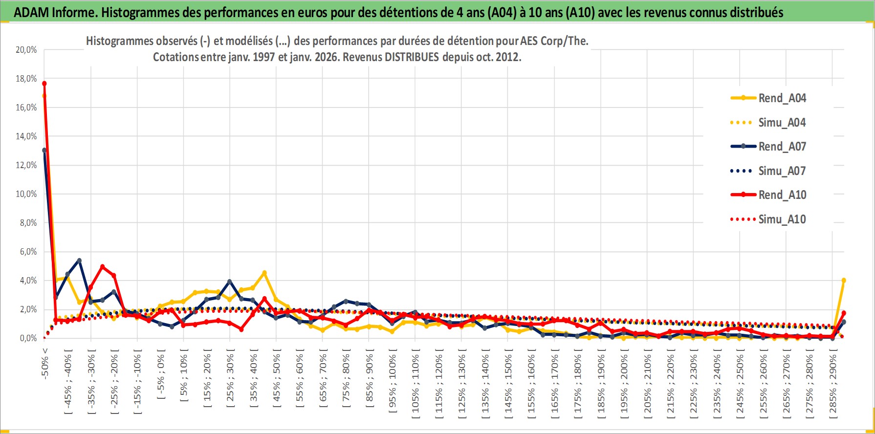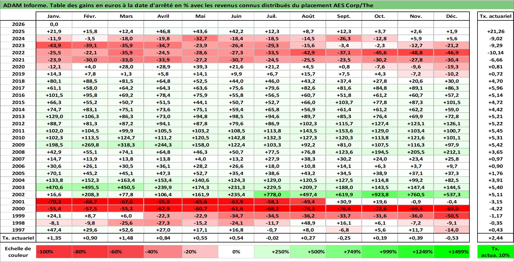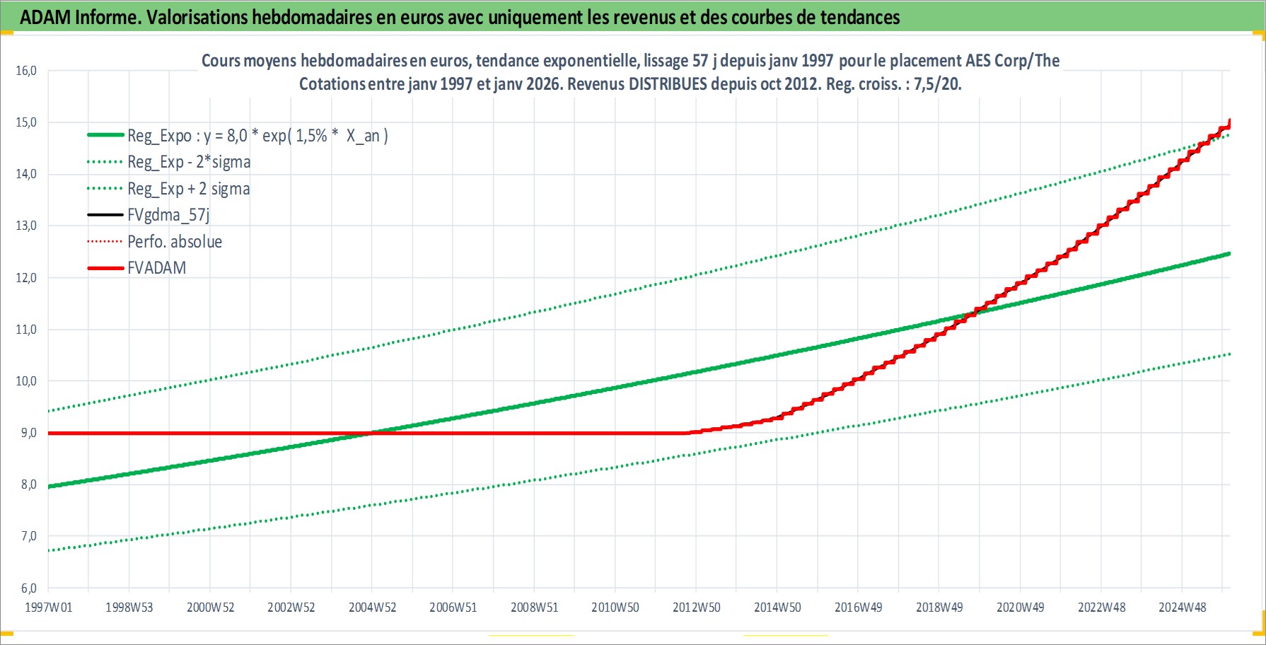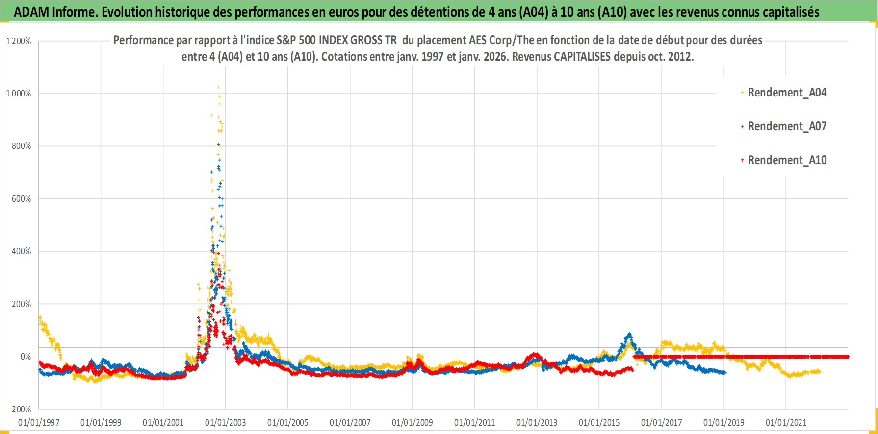 Site dédié aux investisseursPage dédiée sur site financeAnalyse des valorisations hebdomadaires de l'action AES Corp/The. Cet actif est cote en USD. Les valorisations sont en contrevaleur EURO et couvrent les semaines 1997W01 a 2026W05. Les revenus de cet actif financier sont pris en compte depuis la semaine 2012W43. La note globale ESG de cet actif est estimee a 4.0 (apres rebasage entre 0 et 20).