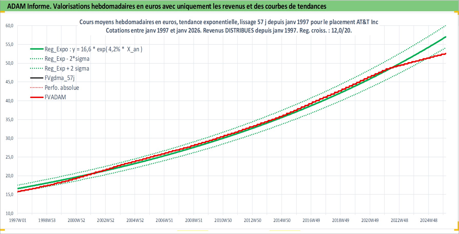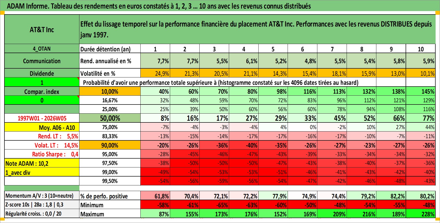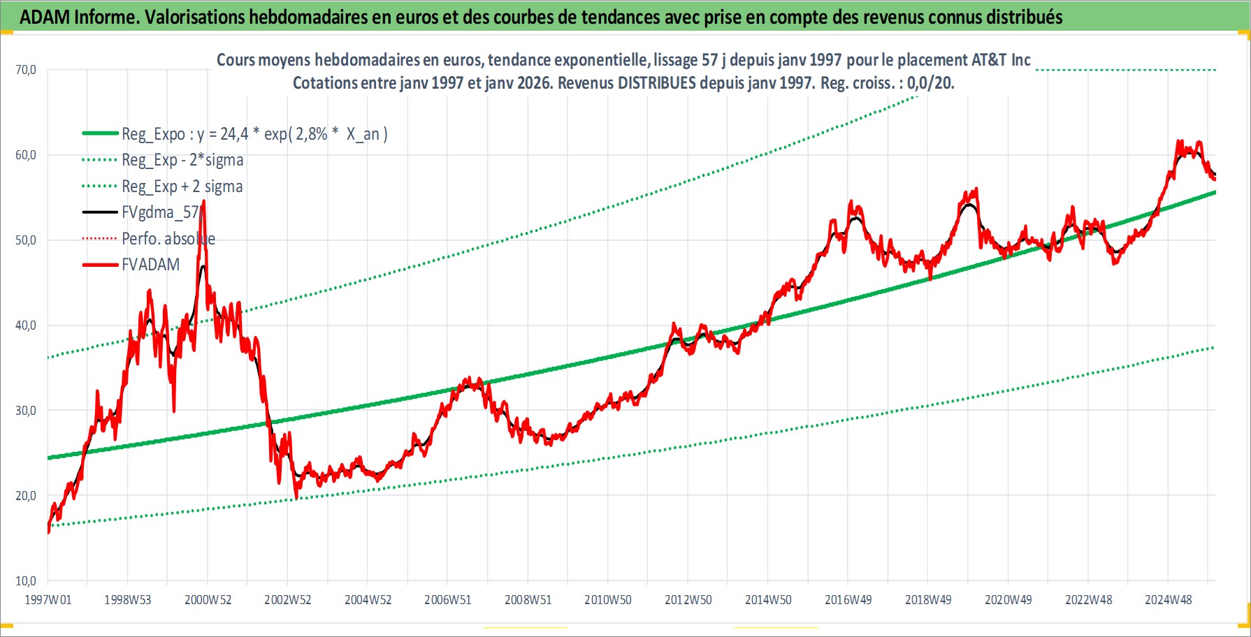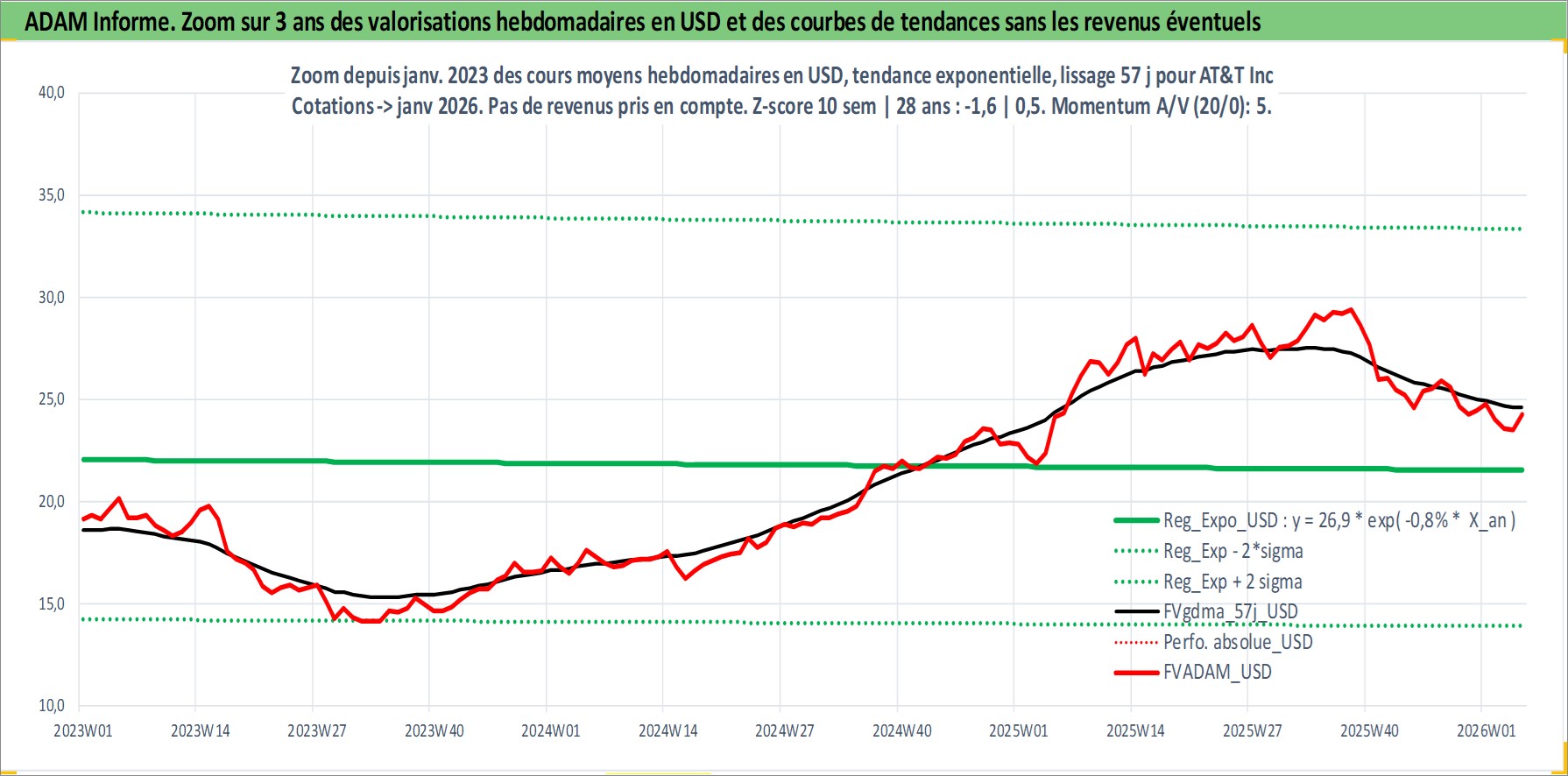 Site dédié aux investisseursPage dédiée sur site financeAnalyse des valorisations hebdomadaires de l'action AT&T Inc. Cet actif est cote en USD. Les valorisations sont en contrevaleur EURO et couvrent les semaines 1997W01 a 2026W05. Les revenus de cet actif financier sont pris en compte depuis la semaine 1997W02. La note globale ESG de cet actif est estimee a 9.0 (apres rebasage entre 0 et 20).