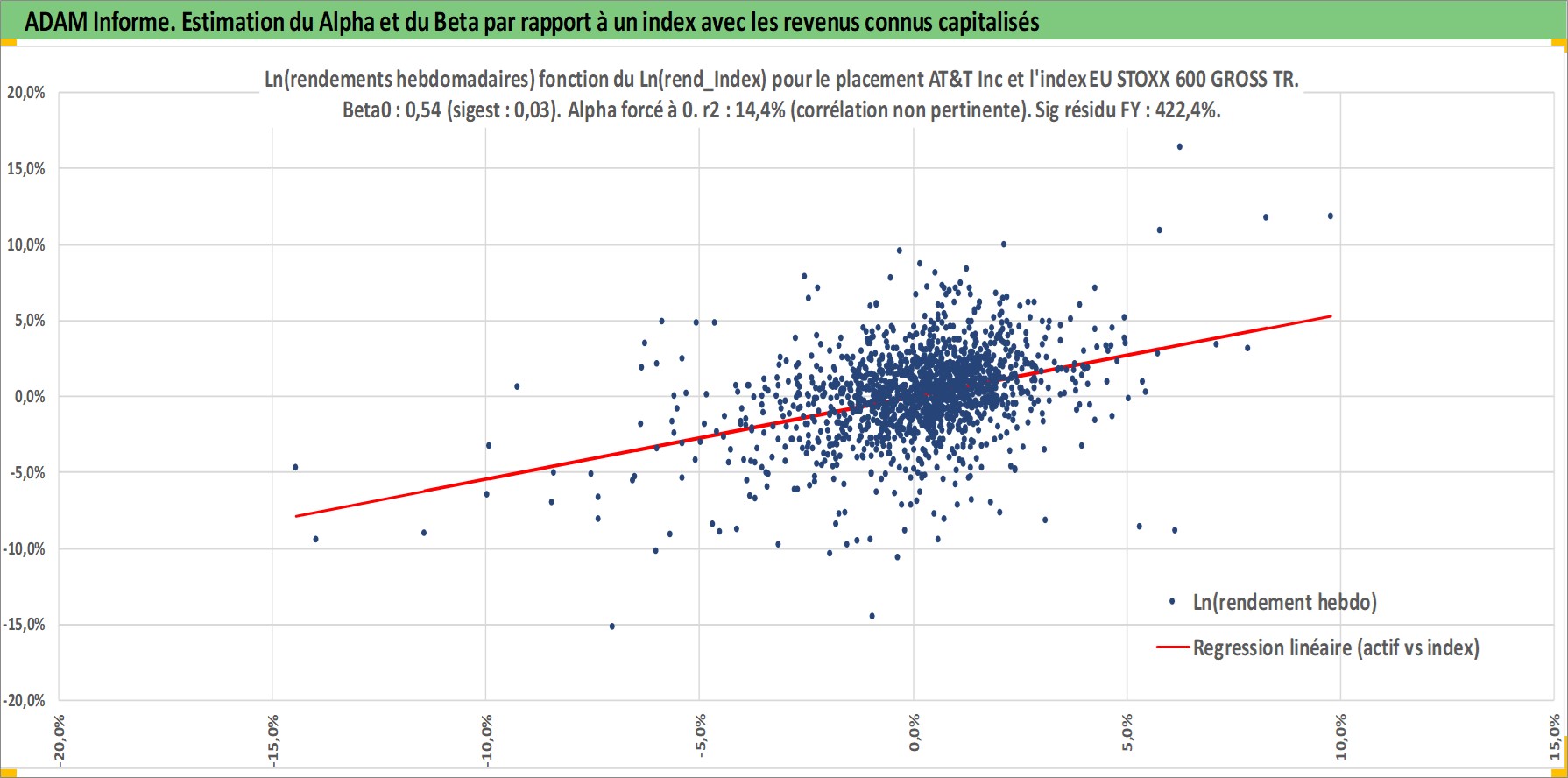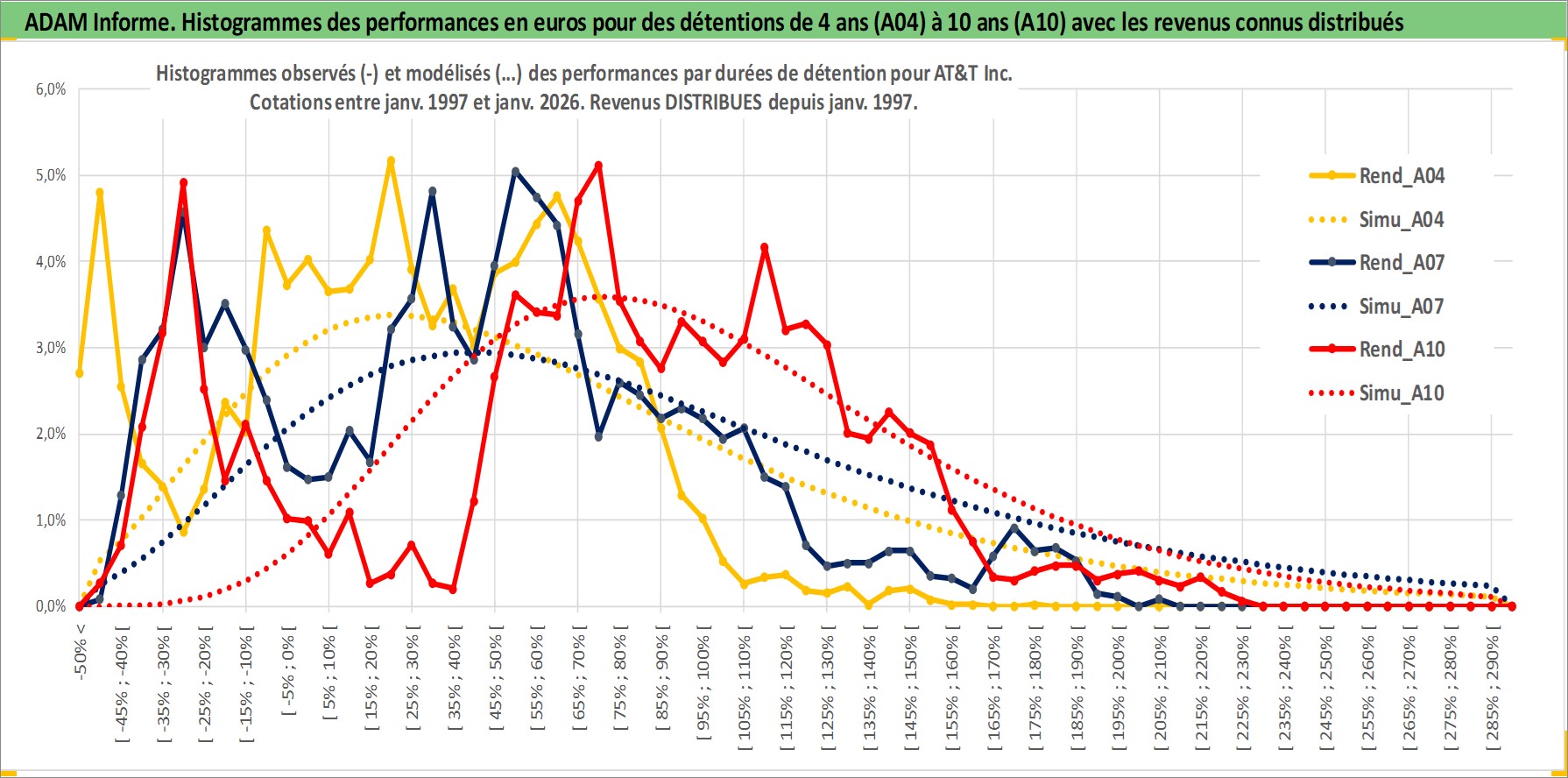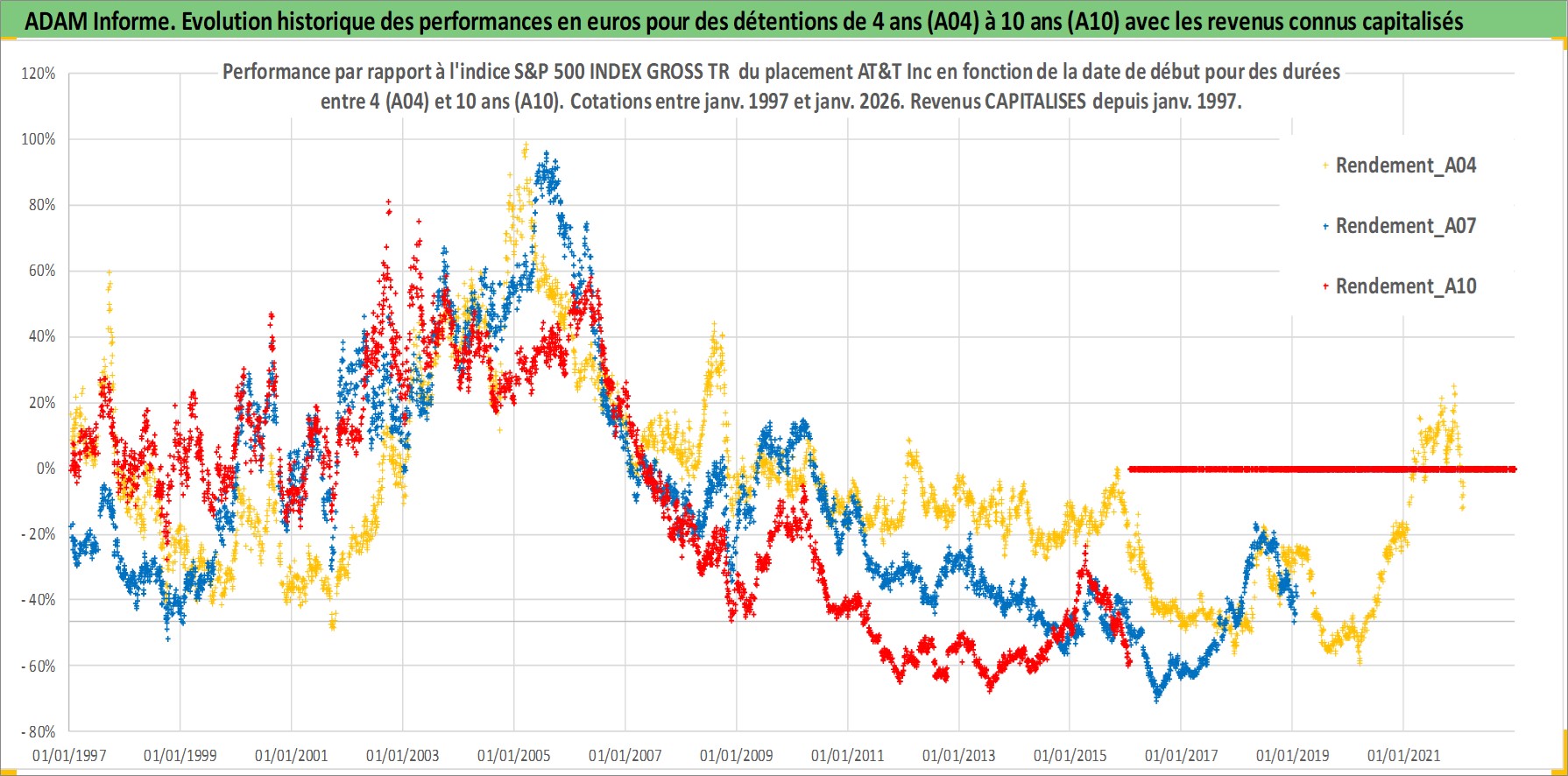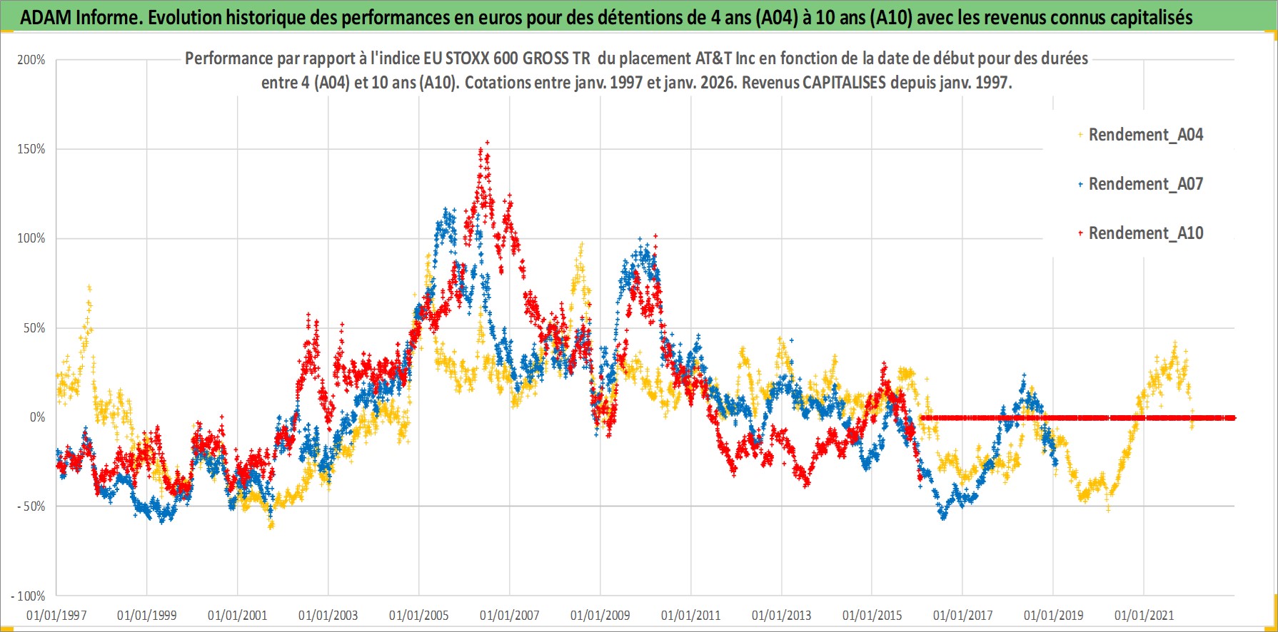 Site dédié aux investisseursPage dédiée sur site financeAnalyse des valorisations hebdomadaires de l'action AT&T Inc. Cet actif est cote en USD. Les valorisations sont en contrevaleur EURO et couvrent les semaines 1997W01 a 2026W05. Les revenus de cet actif financier sont pris en compte depuis la semaine 1997W02. La note globale ESG de cet actif est estimee a 9.0 (apres rebasage entre 0 et 20).