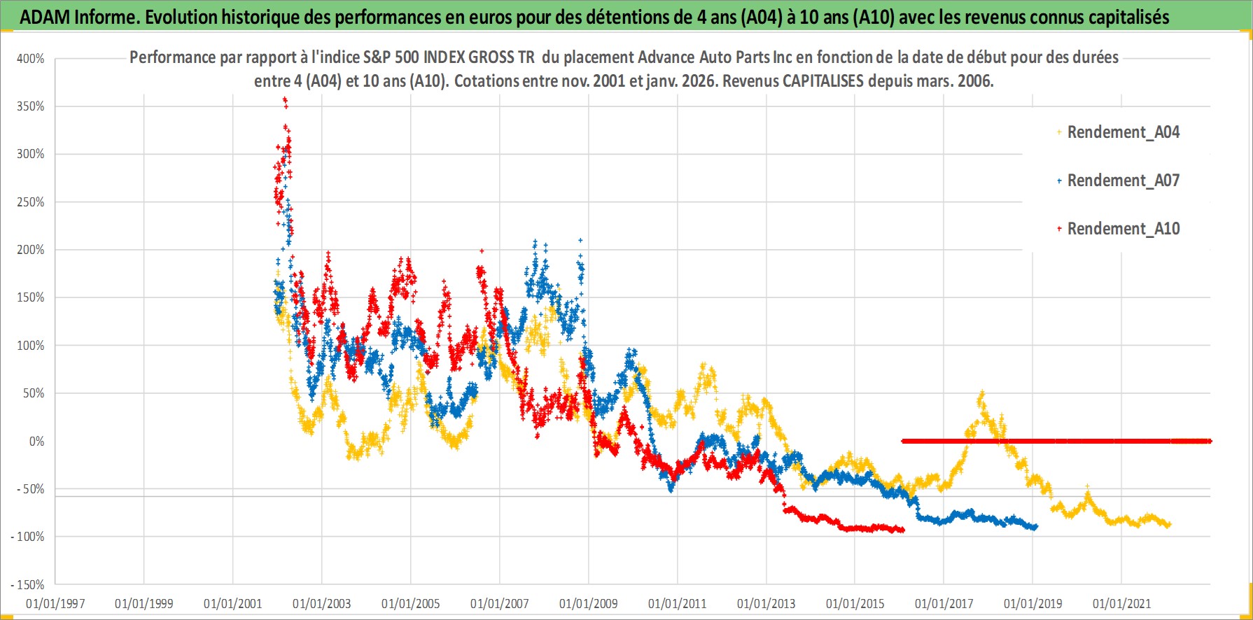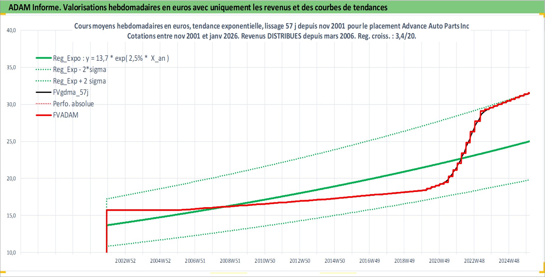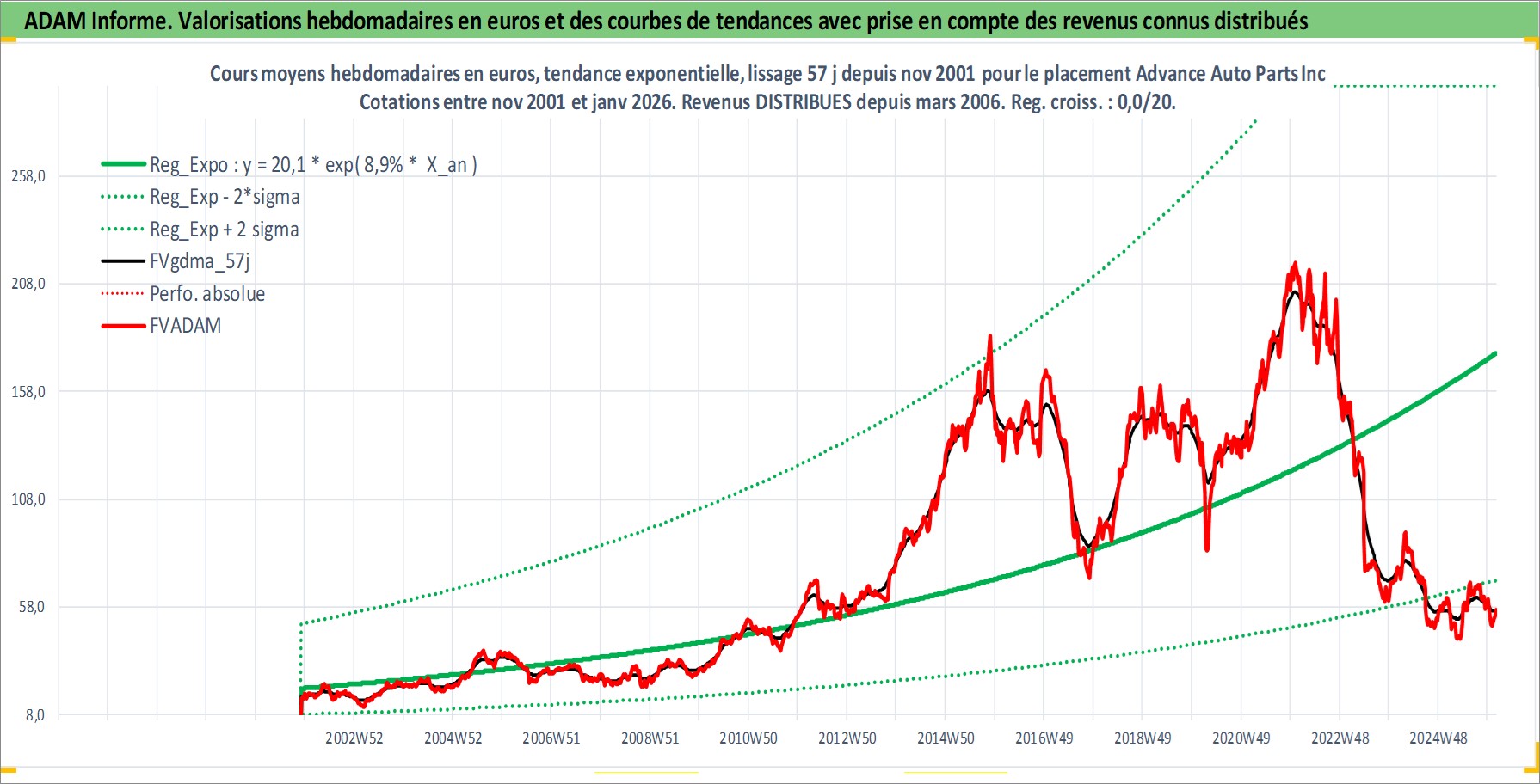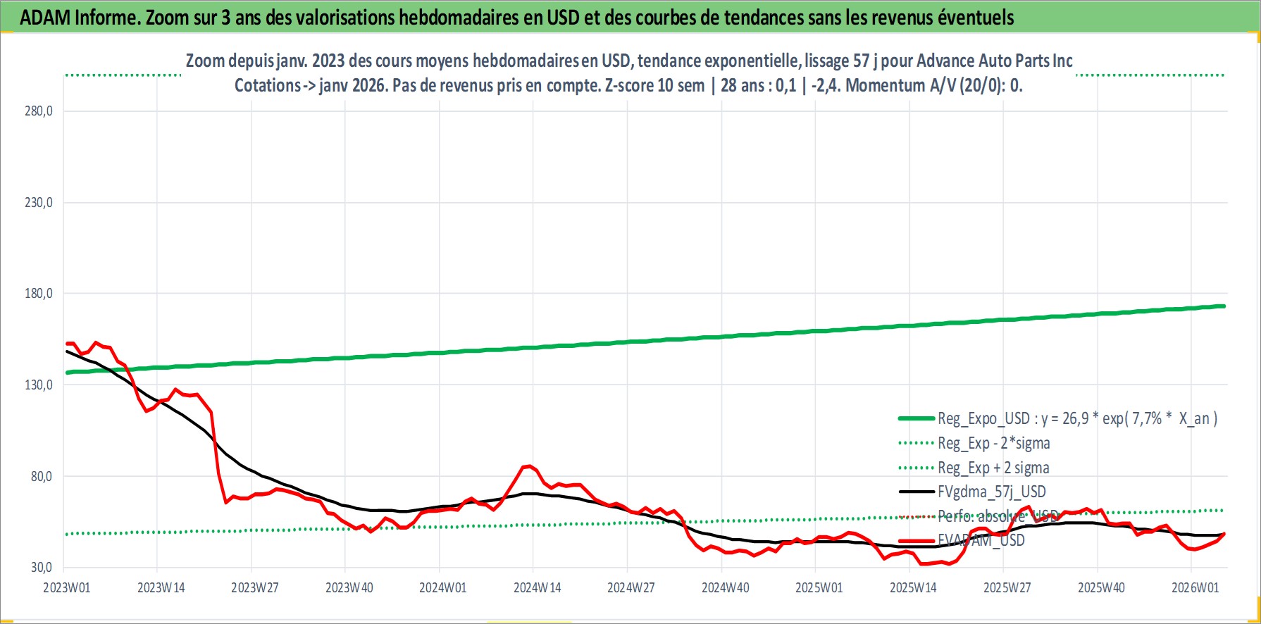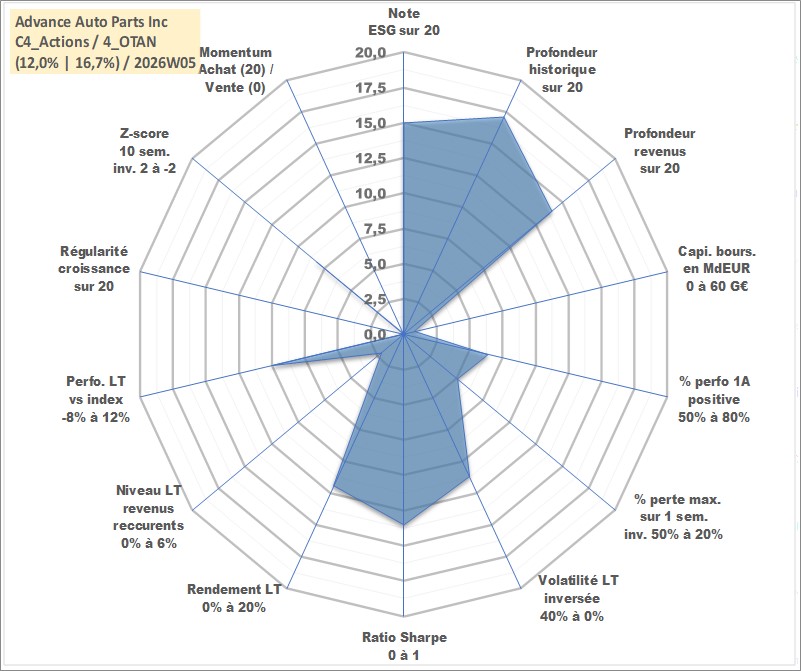 Site dédié aux investisseursPage dédiée sur site financeAnalyse des valorisations hebdomadaires de l'action Advance Auto Parts Inc. Cet actif est cote en USD. Les valorisations sont en contrevaleur EURO et couvrent les semaines 2001W48 a 2026W05. Les revenus de cet actif financier sont pris en compte depuis la semaine 2006W12. La note globale ESG de cet actif est estimee a 15.0 (apres rebasage entre 0 et 20).