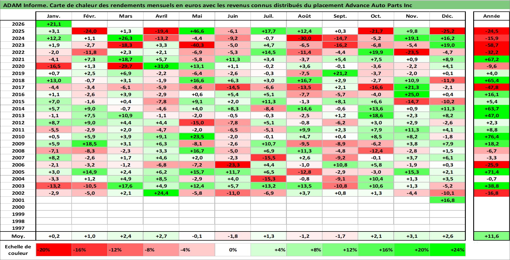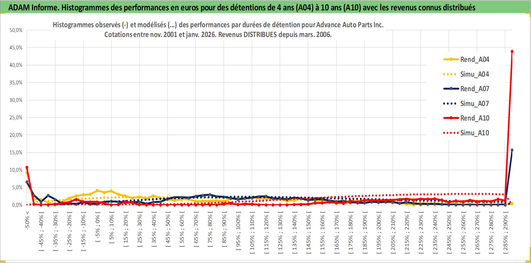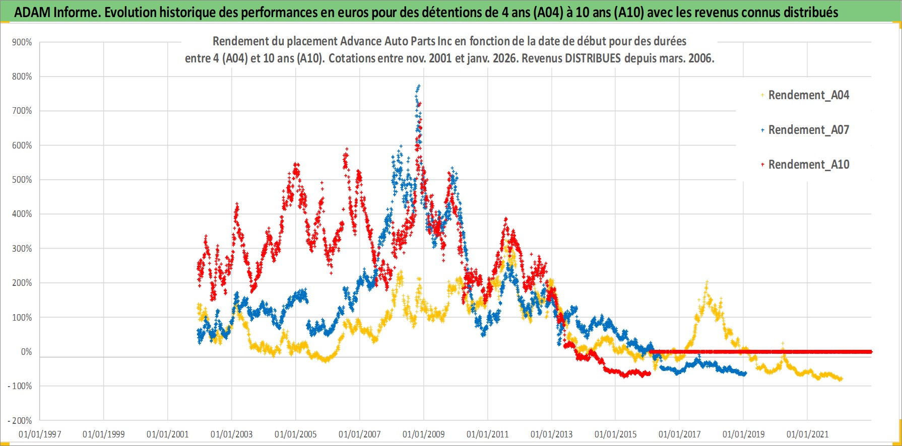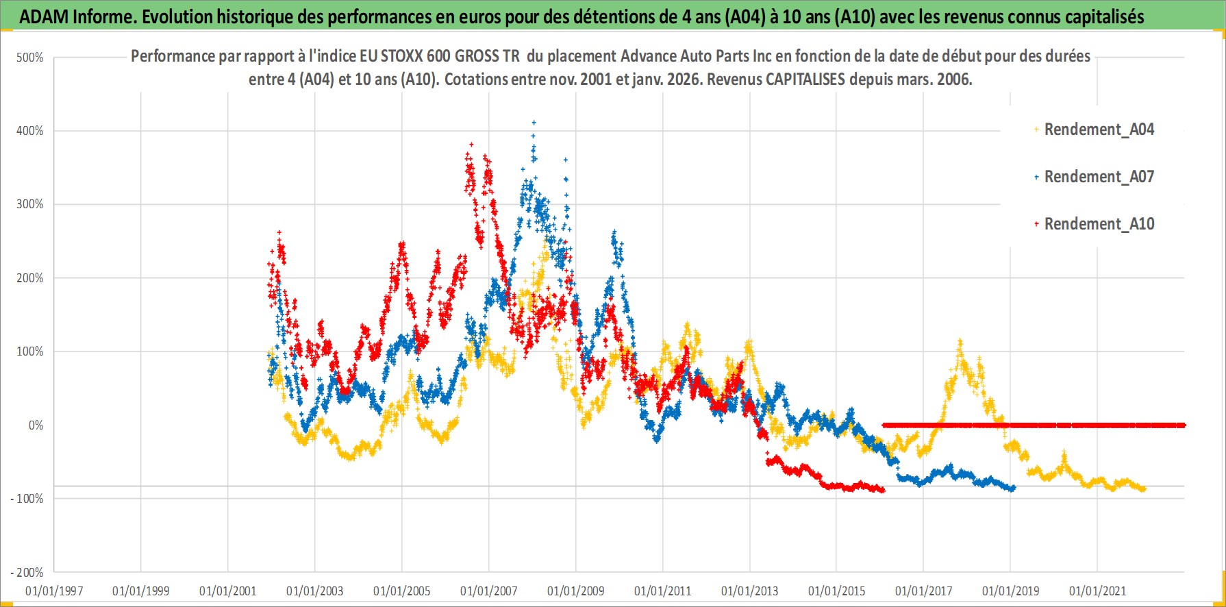 Site dédié aux investisseursPage dédiée sur site financeAnalyse des valorisations hebdomadaires de l'action Advance Auto Parts Inc. Cet actif est cote en USD. Les valorisations sont en contrevaleur EURO et couvrent les semaines 2001W48 a 2026W05. Les revenus de cet actif financier sont pris en compte depuis la semaine 2006W12. La note globale ESG de cet actif est estimee a 15.0 (apres rebasage entre 0 et 20).